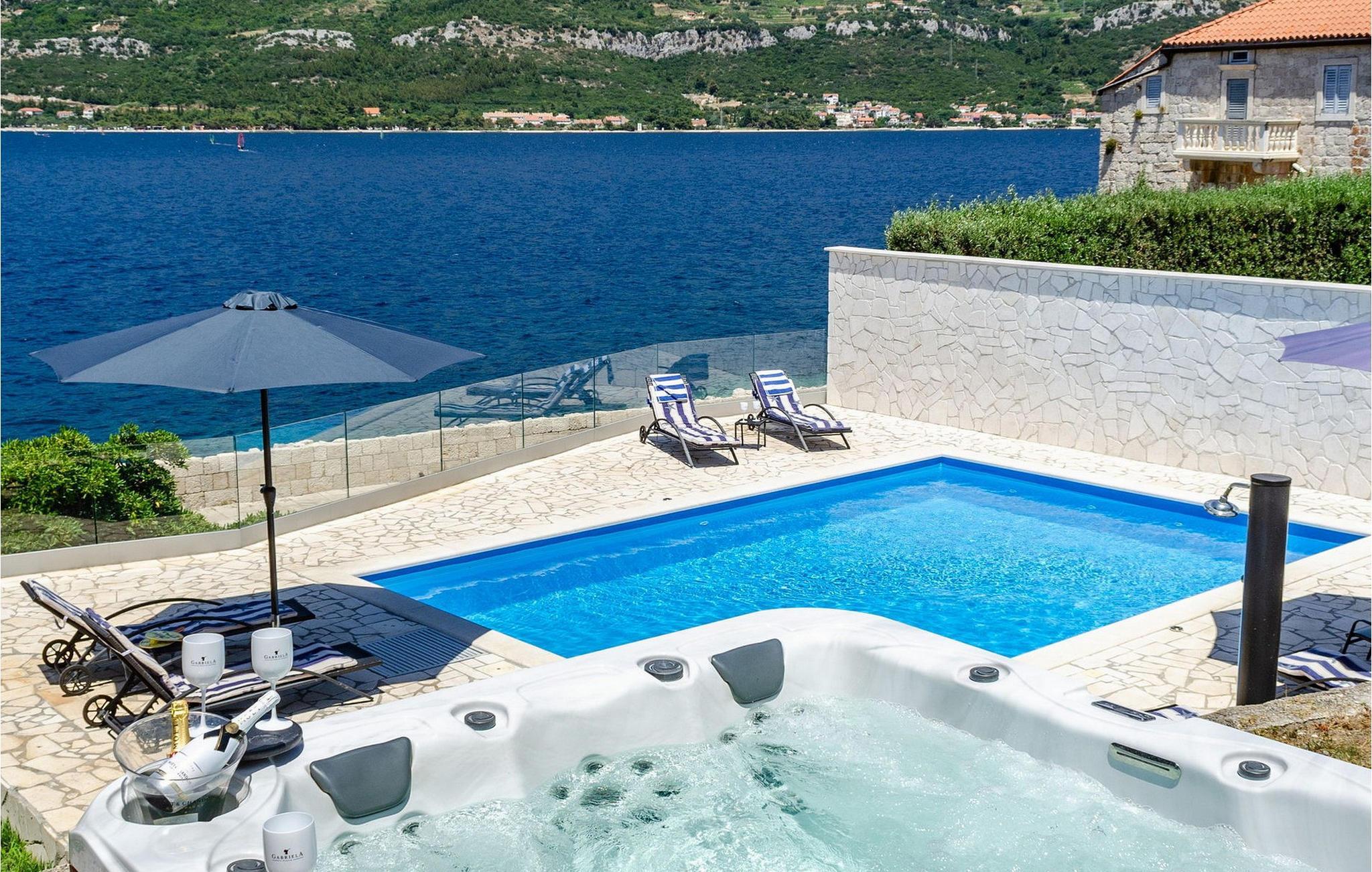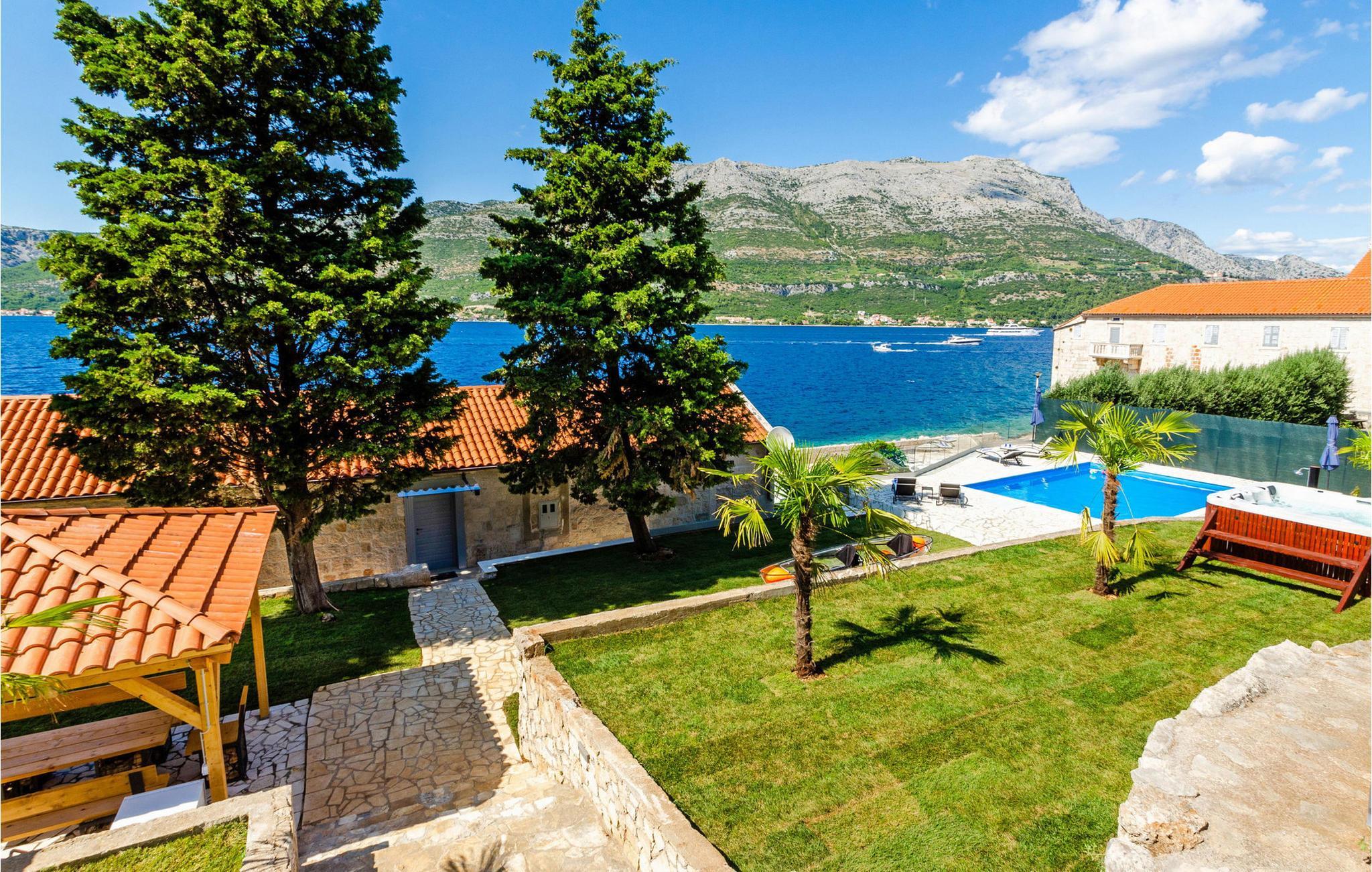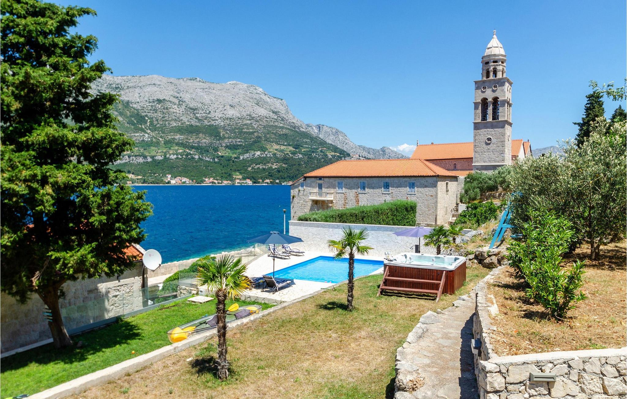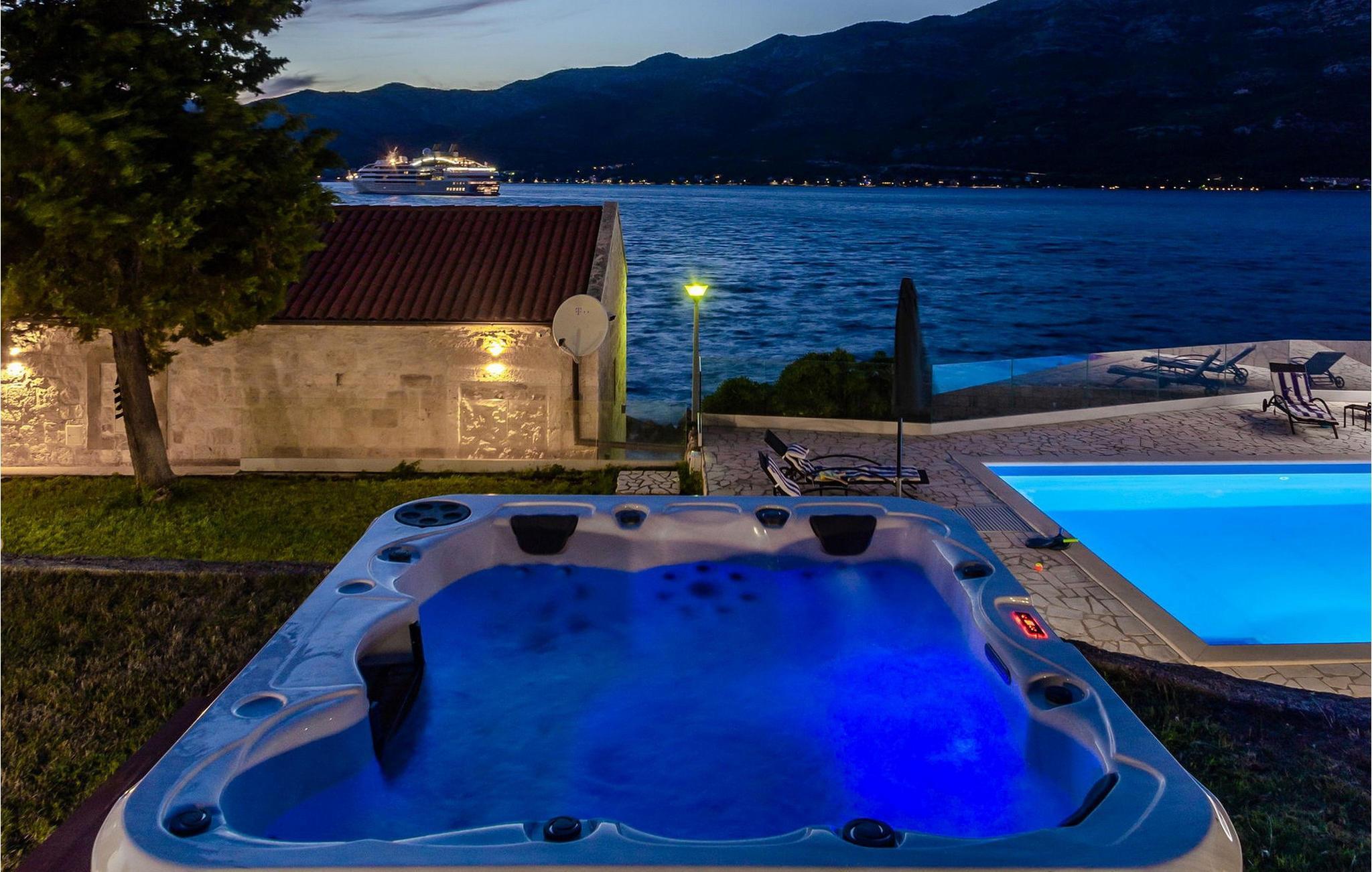 Slap af i denne luksuriøse villa med en fantastisk beliggenhed og fortryllende havudsigt. Den stilfulde naturstensvilla Gabriela Korcula er noget særligt med sin blanding af suveræn komfort og traditionel charme. Fremstil lækre retter i det moderne køkken, og glæd jer til hyggelige måltider i den stilfulde spisestue. Spil billard, brug fitnessudstyret til jeres træning, og saml jer til stimulerende samtaler under det rustikke hvælvede loft i stuen. Terrassen ved siden af opholdsstuen lægger op til at solbade og slappe af, ledsaget af havets beroligende lyde. Efter en dukkert i havet kan I slappe af i den opvarmede pool, spabadet eller villaens rummelige have. Spil bordtennis, mens børnene morer sig på trampolinen, og fejr lune sommeraftener med en udendørs grill. Korcula er et paradis for opdagelsesrejsende. Den charmerende gamle bydel, ofte sammenlignet med Dubrovnik, byder på historiske monumenter og middelhavsstemning. Besøg afsidesliggende landsbyer, slap af på idylliske strande eller udforsk øen på cykel. Bemærk venligst: For unge eller ældre selskabsgrupper kan værten forhøje depositummet ti gange og inspicere huset regelmæssigt under opholdet. Fester, stofmisbrug eller uhøflig opførsel vil resultere i øjeblikkelig udsættelse uden refusion. Gæster bedes afklare detaljerne inden booking for at undgå misforståelser.