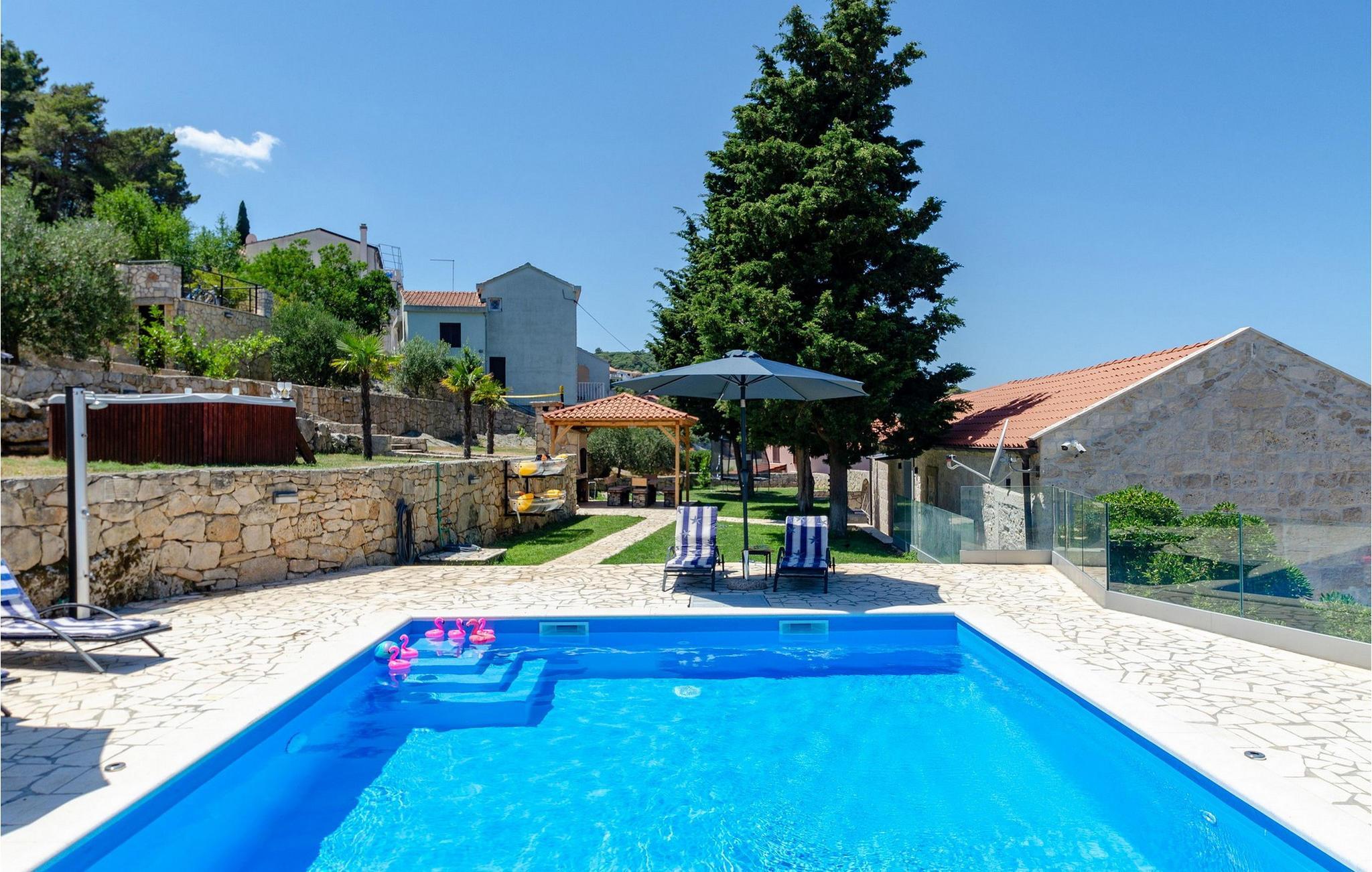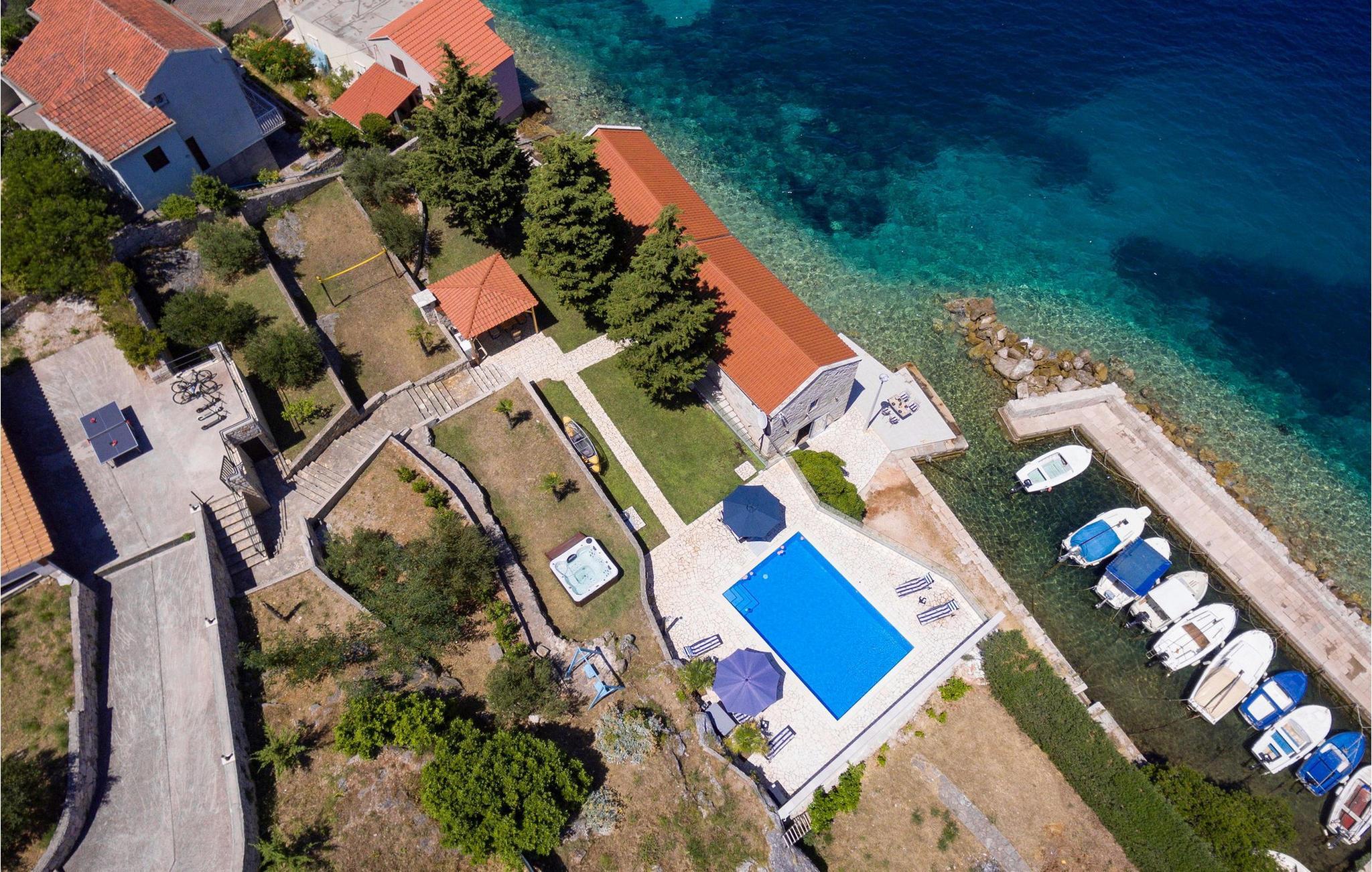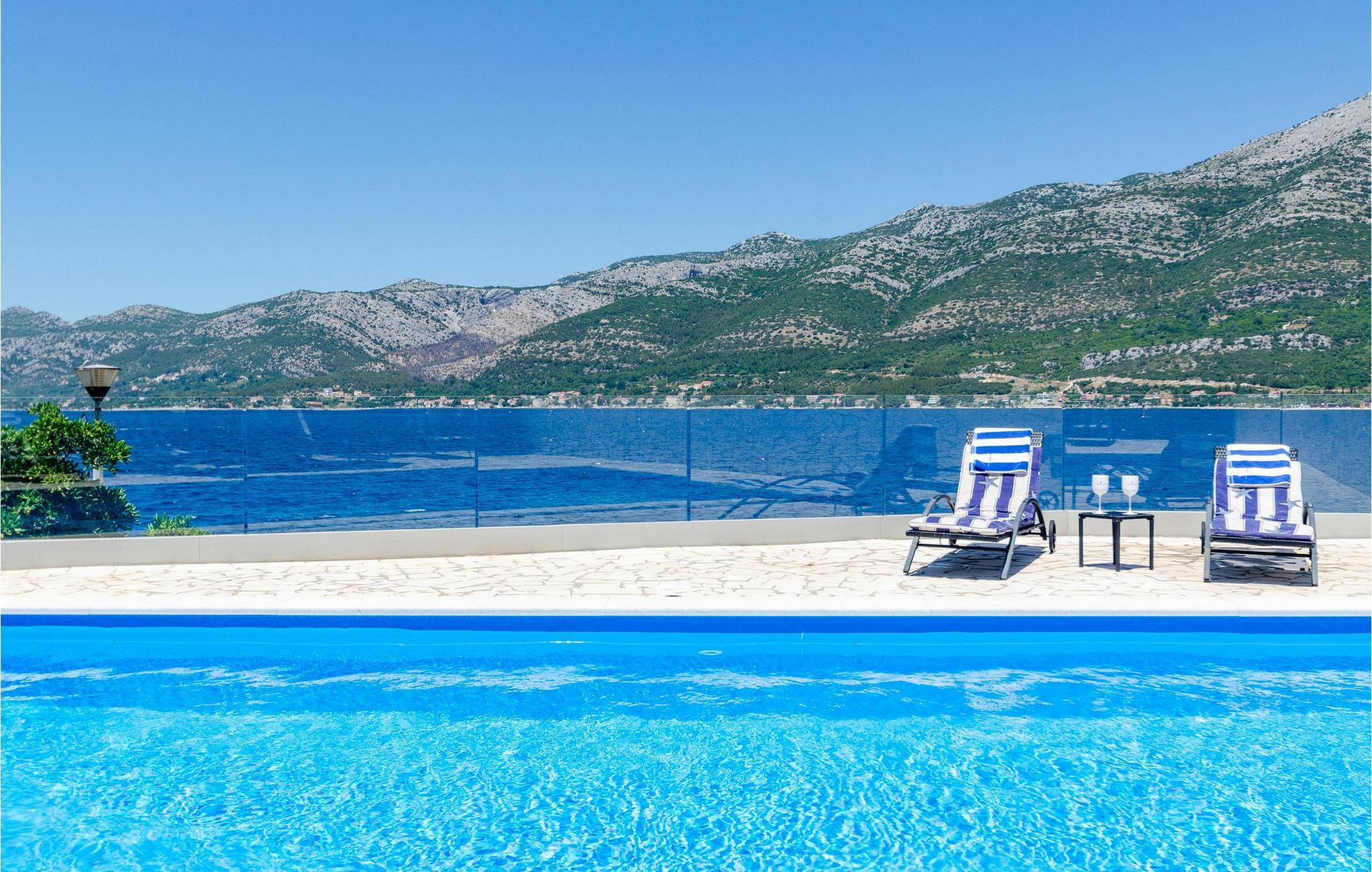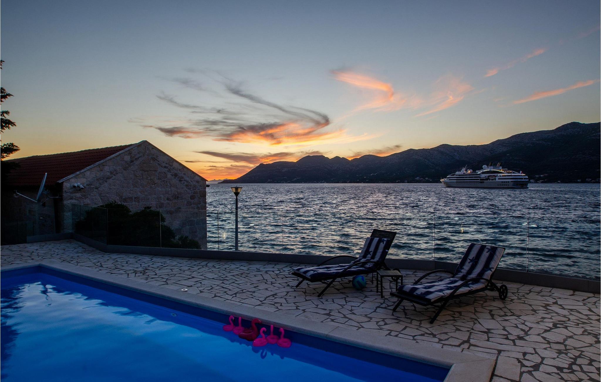 Slap af i denne luksuriøse villa med en fantastisk beliggenhed og fortryllende havudsigt. Den stilfulde naturstensvilla Gabriela Korcula er noget særligt med sin blanding af suveræn komfort og traditionel charme. Fremstil lækre retter i det moderne køkken, og glæd jer til hyggelige måltider i den stilfulde spisestue. Spil billard, brug fitnessudstyret til jeres træning, og saml jer til stimulerende samtaler under det rustikke hvælvede loft i stuen. Terrassen ved siden af opholdsstuen lægger op til at solbade og slappe af, ledsaget af havets beroligende lyde. Efter en dukkert i havet kan I slappe af i den opvarmede pool, spabadet eller villaens rummelige have. Spil bordtennis, mens børnene morer sig på trampolinen, og fejr lune sommeraftener med en udendørs grill. Korcula er et paradis for opdagelsesrejsende. Den charmerende gamle bydel, ofte sammenlignet med Dubrovnik, byder på historiske monumenter og middelhavsstemning. Besøg afsidesliggende landsbyer, slap af på idylliske strande eller udforsk øen på cykel. Bemærk venligst: For unge eller ældre selskabsgrupper kan værten forhøje depositummet ti gange og inspicere huset regelmæssigt under opholdet. Fester, stofmisbrug eller uhøflig opførsel vil resultere i øjeblikkelig udsættelse uden refusion. Gæster bedes afklare detaljerne inden booking for at undgå misforståelser.