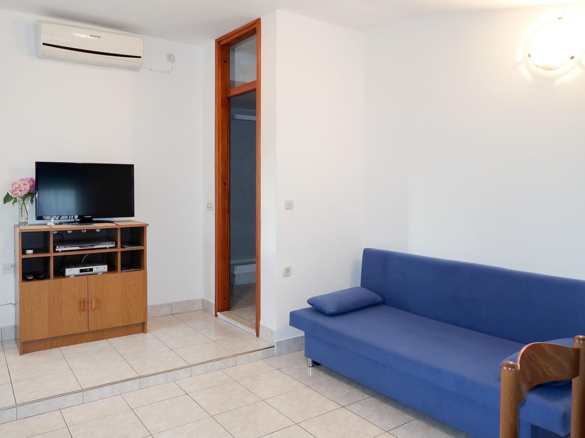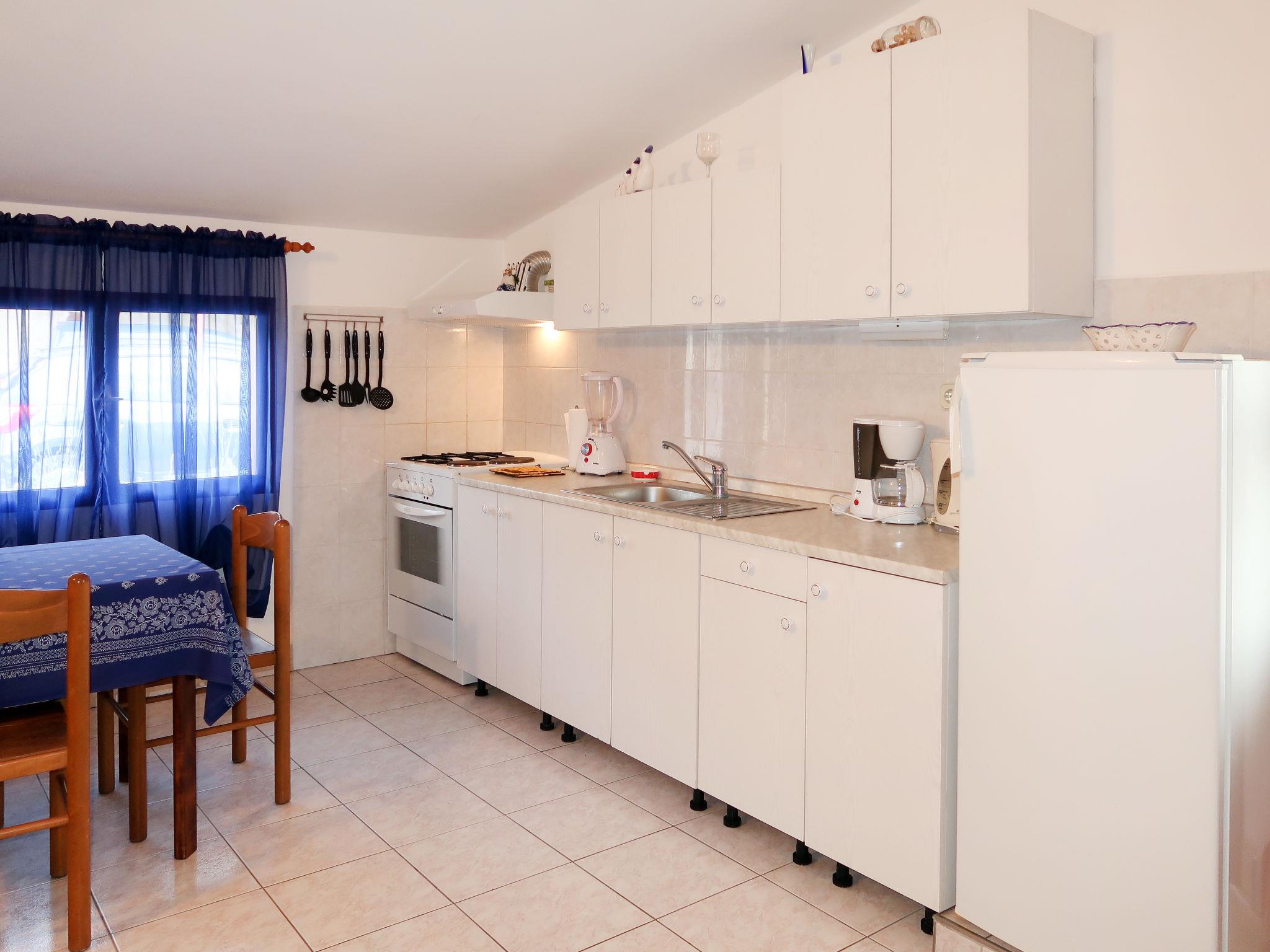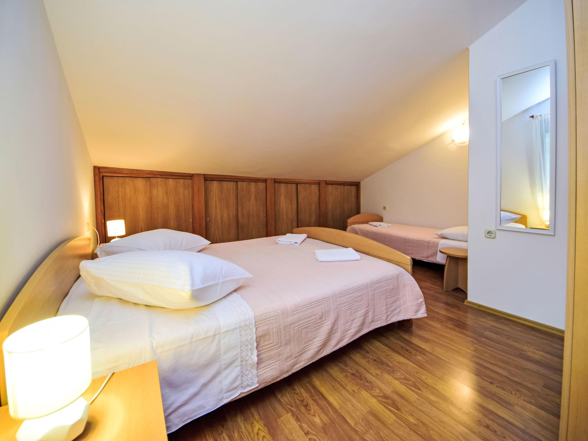 "Peric", 2-room apartment 40 m2 on 2nd floor. Living/dining room with sloping ceilings with 1 sofabed, satellite TV and air conditioning. 1 room with sloping ceilings with 1 bed and 1 double bed. With sloping ceilings, open kitchen (2 hot plates, oven, 2 gas rings, toaster, kettle, electric coffee machine). Shower/WC. No heating option. Terrace 20 m2. Terrace furniture, balcony furniture, deck chairs (2). View of the sea. Facilities: Internet (WiFi, free).