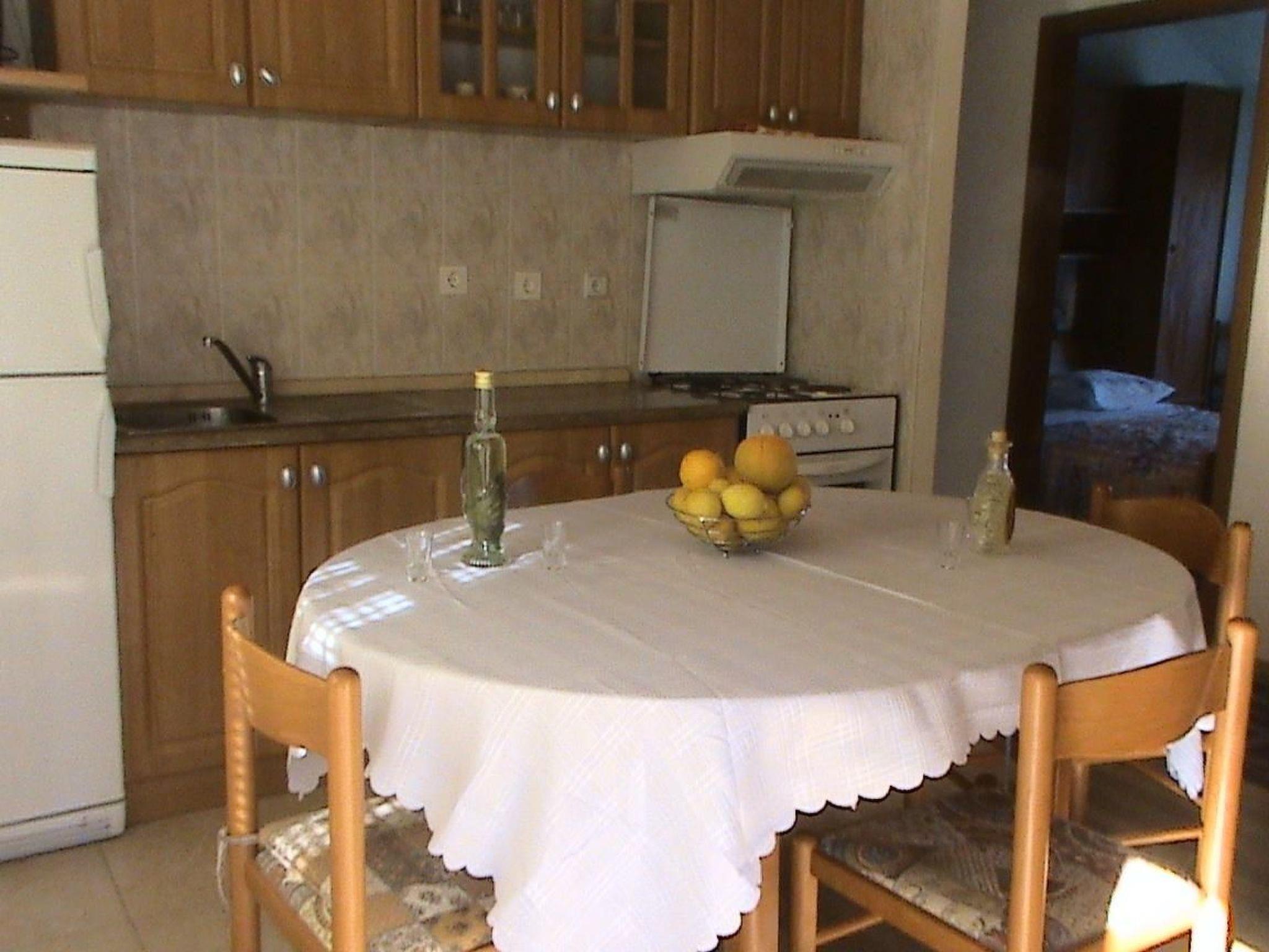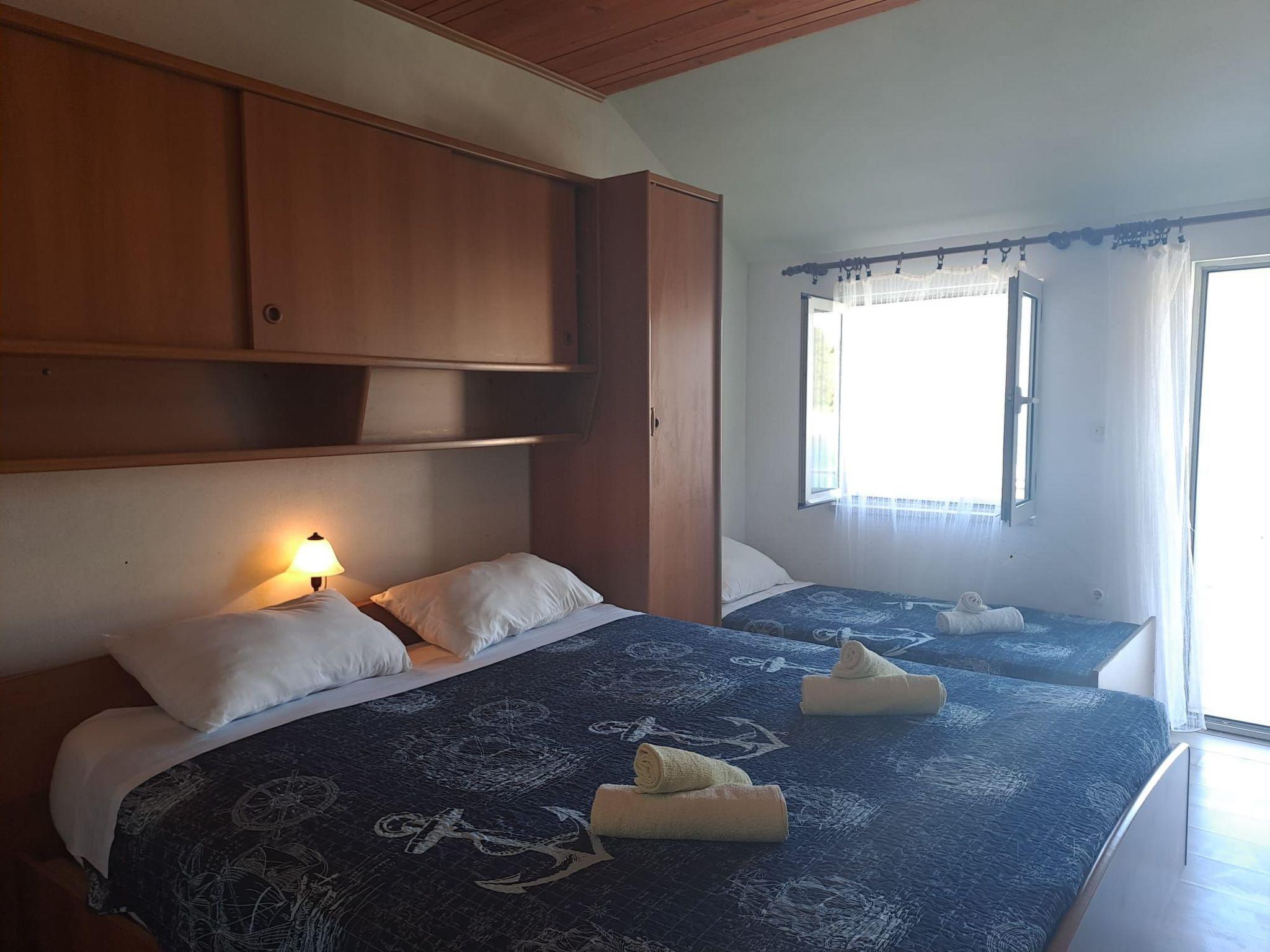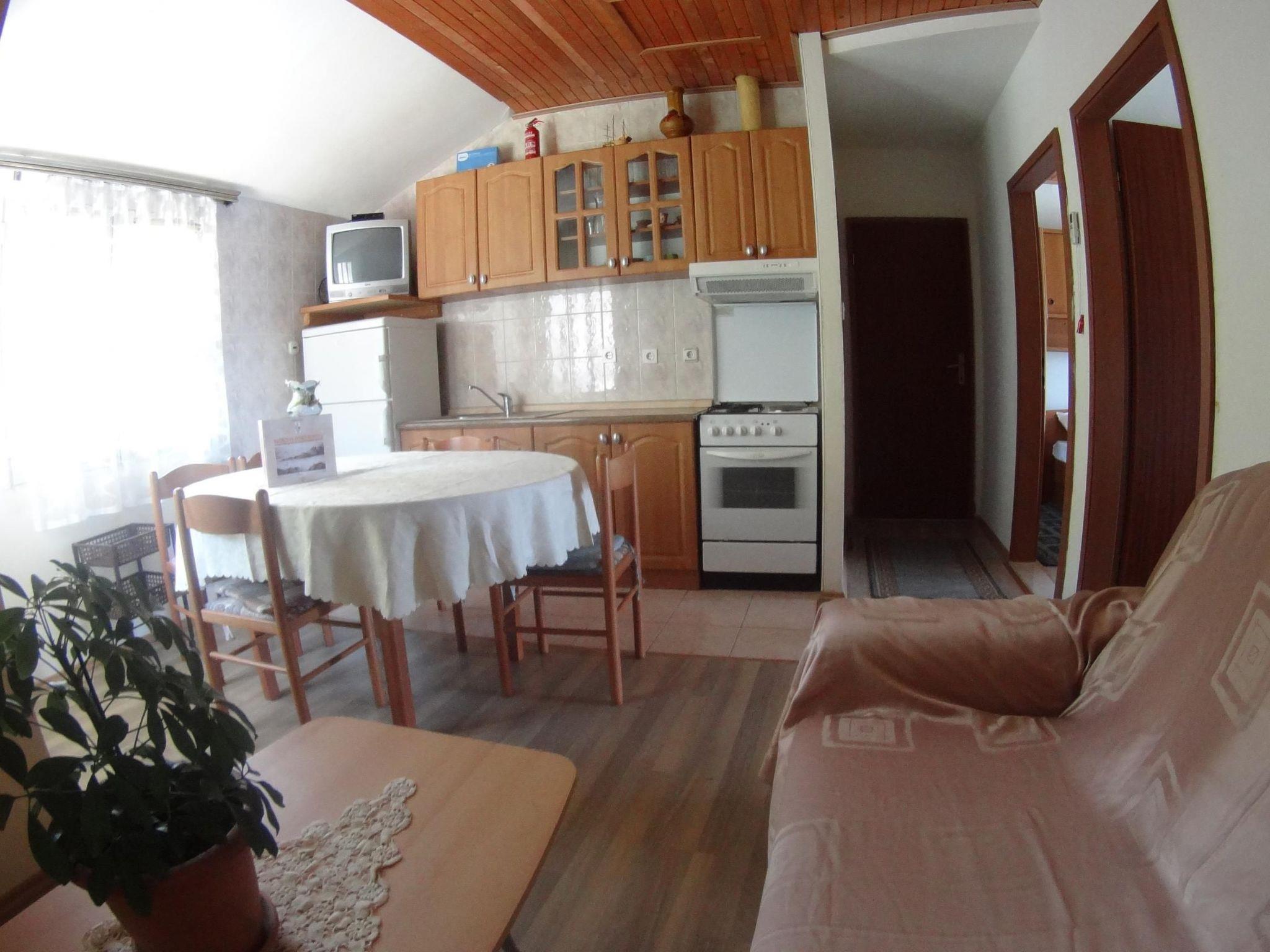 This apartment is located on the second floor and can accommodate up to five people. It has two bedrooms, each with a double bed and an extra bed. The air-conditioned living and dining area with an open kitchen offers a TV and a dining table with chairs. The kitchenette is fully equipped with all necessary kitchen appliances. The bathroom consists of a bathtub, sink, toilet and washing machine.