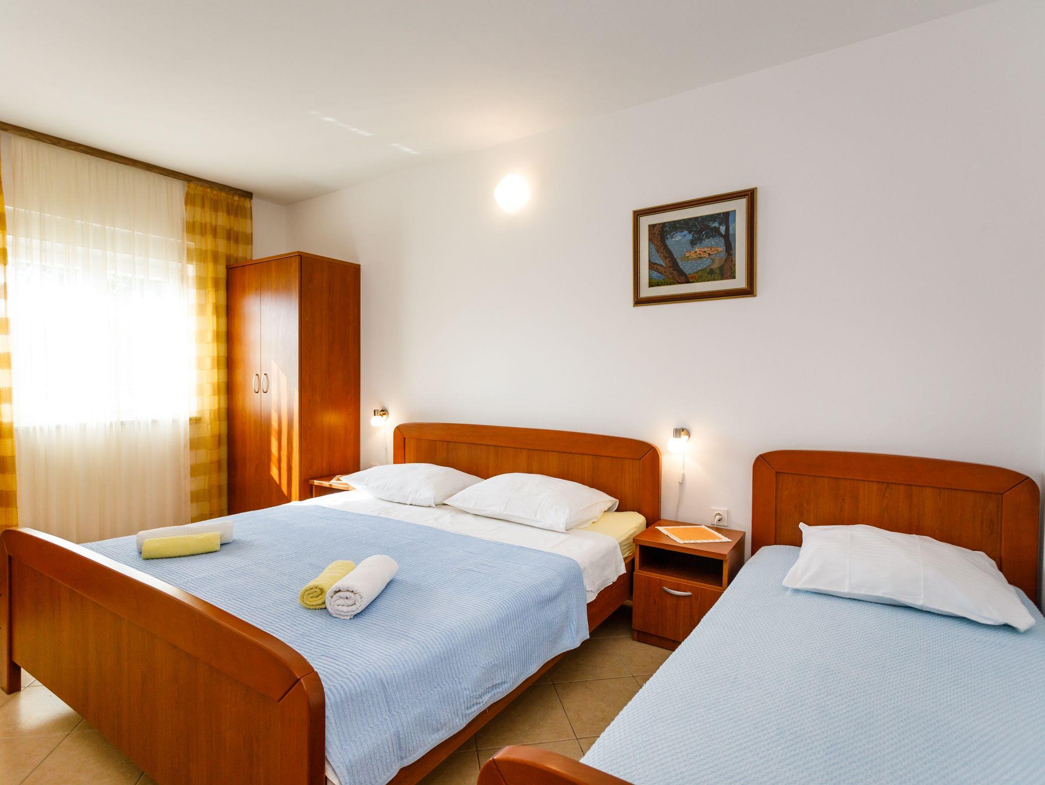 Ferienwohnung bietet Platz für 3 Gäste. Die Betten sind in Schlafzimmern, die es 1 gibt, innerhalb einer Gesamtfläche von 30m2, angeordnet. Die Gäste haben eine eigene Terrasse zur Verfügung, auf der sie in warmen Sommernächten genießen können. Es ist erlaubt, Speisen auf dem Gemeinschafts-Grill vorzubereiten. Unterkunftseinheit hat Räume, die von dem Rest der Einheit abgetrennt werden. IM PREIS INBEGRIFFEN: Kurtaxe, Endreinigung, Klimatisierung, Parkplatz, Internet, Bügeleisen, Bügelbrett, Föhn. VERBINDLICHE ZUSÄTZLICHE KOSTEN: Aufzahlung für Kurzaufenthalte (prozentualer Zuschlag pro Nächtigungsanzahl: 30% - 1, 20% - 2, 10% - 3). Die Verfügbarkeit zusätzlicher Dienstleistungen in Ihrem reservierten Termin und die Preise derselben (falls nicht aufgeführt) müssen im Voraus überprüft werden. Zusätzliche Dienstleistungen die in der Zahlungsaufforderung nicht aufgeführt sind werden direkt beim Vermieter bezahlt, angenommen der Gast nutzt auch diese. Ermäßigung auf den Grundpreis: Gratistag 14=13 (bei einem Aufenthalt von 14 Tagen oder mehr erhalten Sie einen Gratistag für den Aufenthalt bis 31.12.26).