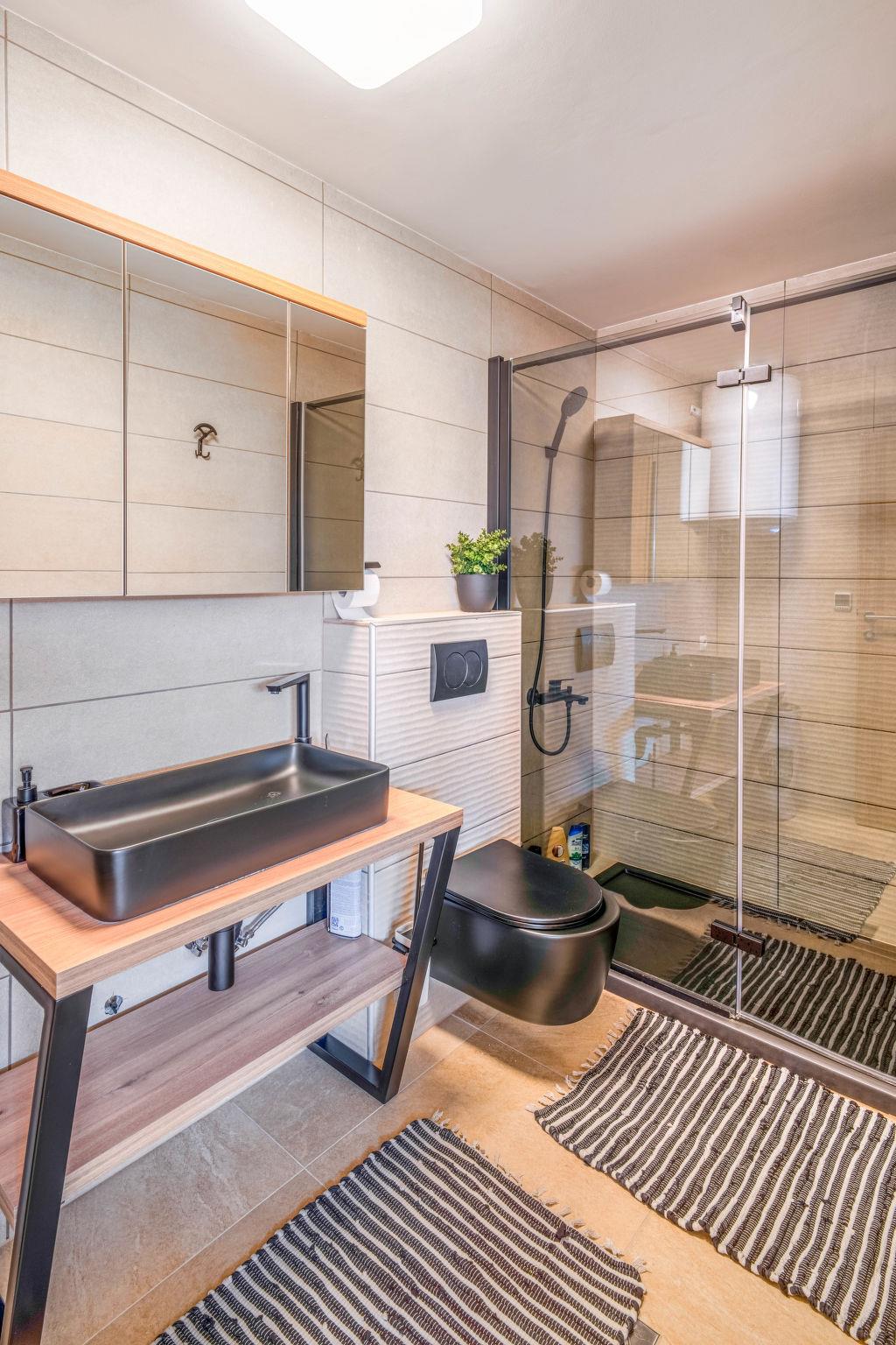 3-room house 60 m2 on 2 levels. Living/dining room with satellite TV. Open kitchen (dishwasher, 2 induction hot plates, kettle, freezer). Shower/WC. Top floor: entrance hall with air conditioning. 1 room with 3 beds (80 cm, length 200 cm). 1 room with 1 bed (90 cm, length 200 cm), 1 french bed (160 cm, length 200 cm). Exit to the balcony. Sep. WC. Heating. Balcony 3 m2. Beautiful view of the mountains and the resort. Facilities: washing machine, iron, mosquito net, children's high chair, baby cot, hair dryer. Internet (WiFi, free). Please note: non-smoking house. Fire extinguisher.