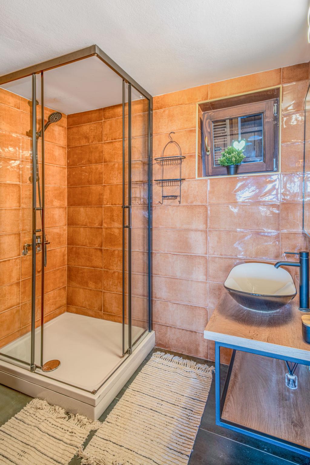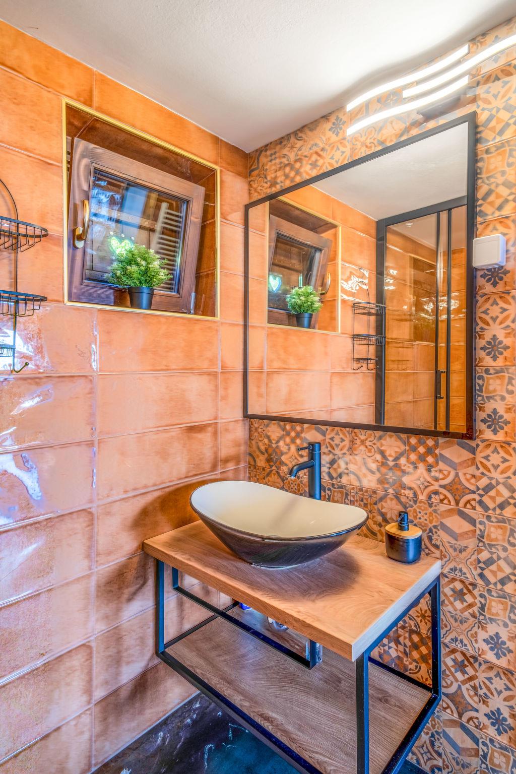 6-room house 140 m2 on 3 levels. Living/dining room with kitchen corner and satellite TV (flat screen), wood-burning stove. Living/dining room with kitchen corner and satellite TV. Open kitchen (4 induction hot plates, kettle). 2 showers/WC. On the lower ground floor: (exterior staircase). Open kitchen (oven, dishwasher, 4 induction hot plates, toaster, kettle, microwave, freezer, electric coffee machine). Top floor: entrance hall with air conditioning. 1 room, ceiling height 80 - 230 cm with 2 beds (80 cm, length 200 cm). 1 room, ceiling height 80 - 230 cm with 2 beds (80 cm, length 200 cm), 1 french bed (160 cm, length 200 cm). Exit to the balcony. Entrance hall with air conditioning. 1 room with 3 beds (80 cm, length 200 cm) with 1 bed (90 cm, length 200 cm), 1 french bed (160 cm, length 200 cm). Exit to the balcony. Shower/WC, sep. WC. Heating. Balcony 7 m2, balcony 3 m2, terrace 20 m2, roofed. Terrace furniture, balcony furniture. Beautiful view of the mountains and the resort. Facilities: washing machine, iron, mosquito net, children's high chair, baby cot, hair dryer. Internet (WiFi, free). Please note: non-smoking house. Fire extinguisher. The first house consists of a living/dining room, an open kitchen on the ground floor, a second kitchen on the lower ground floor and 2 bedrooms on the upper floor. The second house consists of a living/dining room, an open kitchen on the ground floor and 2 bedrooms on the top floor.