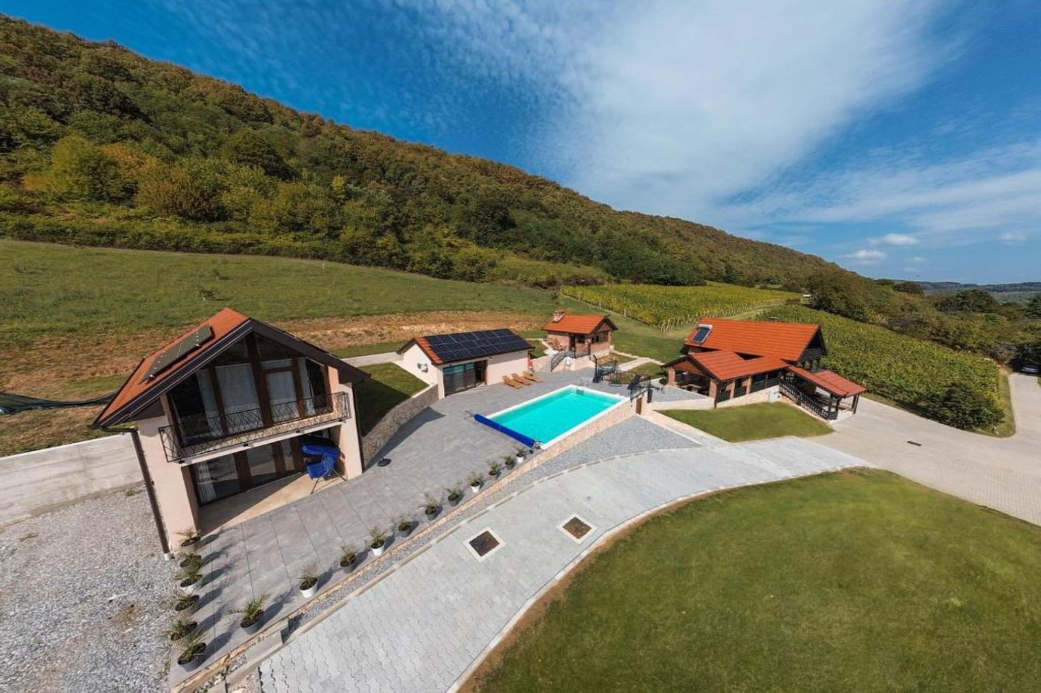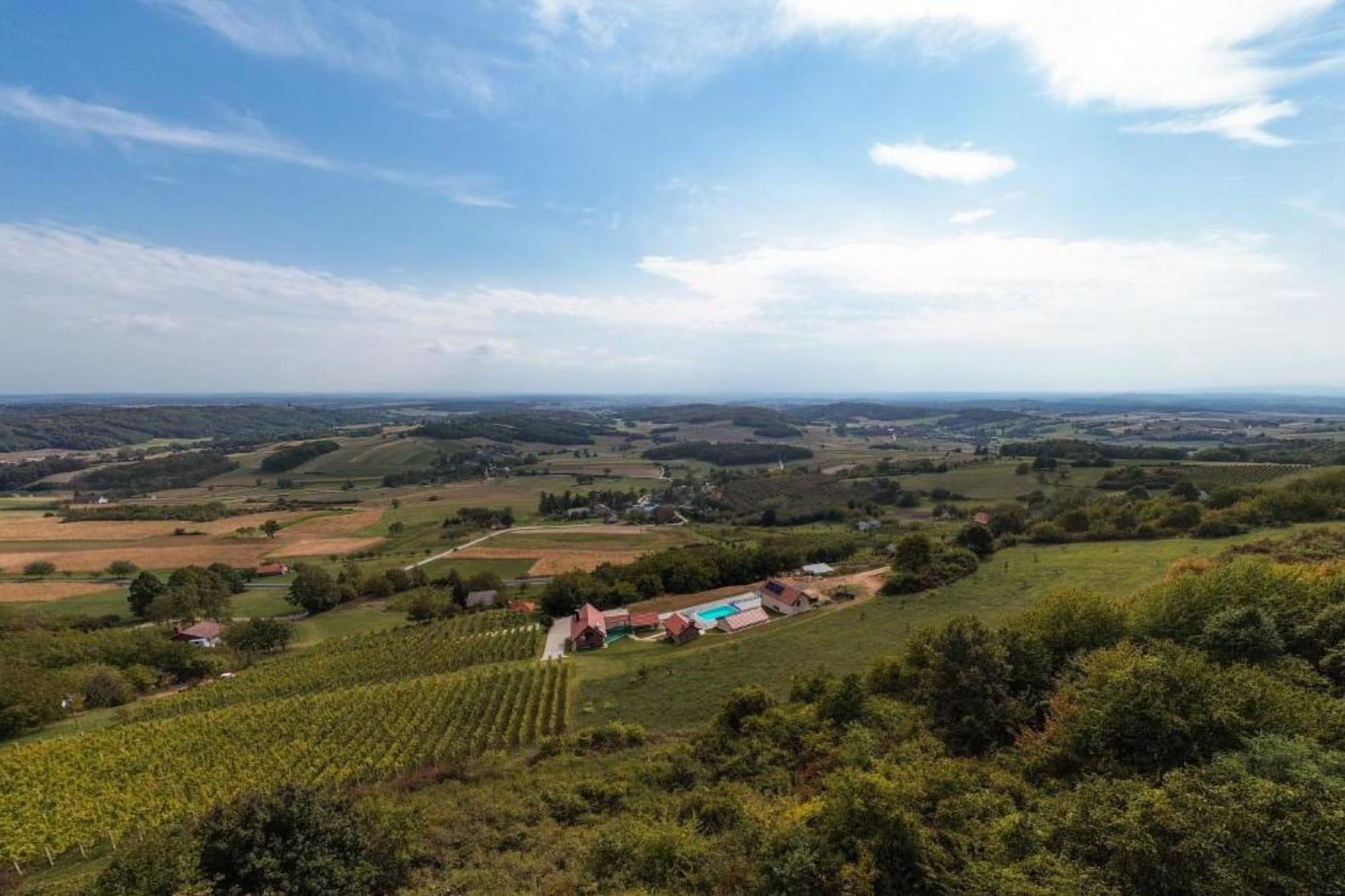 Villa Breg in Kalnik, Koprivnica-Križevci County, Croatia, is a peaceful retreat surrounded by vineyards and forests. Guests can enjoy stunning highland views and explore nearby attractions in Kalnik and Križevci, known for outdoor activities and cultural heritage. Perfect for relaxation and nature escapes. Note: Private parking is available, reservation is not required. Baggage drop-off is available before check-in. Wi-Fi is available throughout the property. Pets are not allowed. Baby cot is available on request. Pool open 01.05.-31.10. This four-bedroom can accommodate up to thirteen guests. It features an internet-enabled/flat-screen TV and is combined with a living room seating area, sofa, and kitchen. The private bathroom is equipped with a shower and toilet. Free toiletries are available on request. Thanks to its excellent location, everything you'll need for your vacation is just a short walk away from the property. Grocery stores, cafes, restaurants—everything is within 2 km radius. The airport is 50 km away from the property.