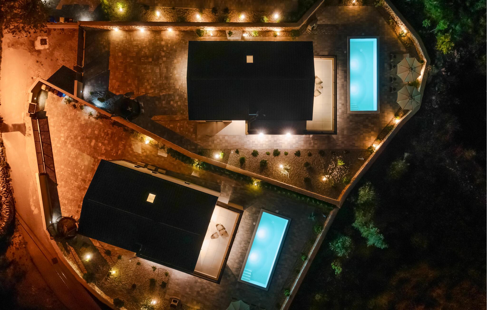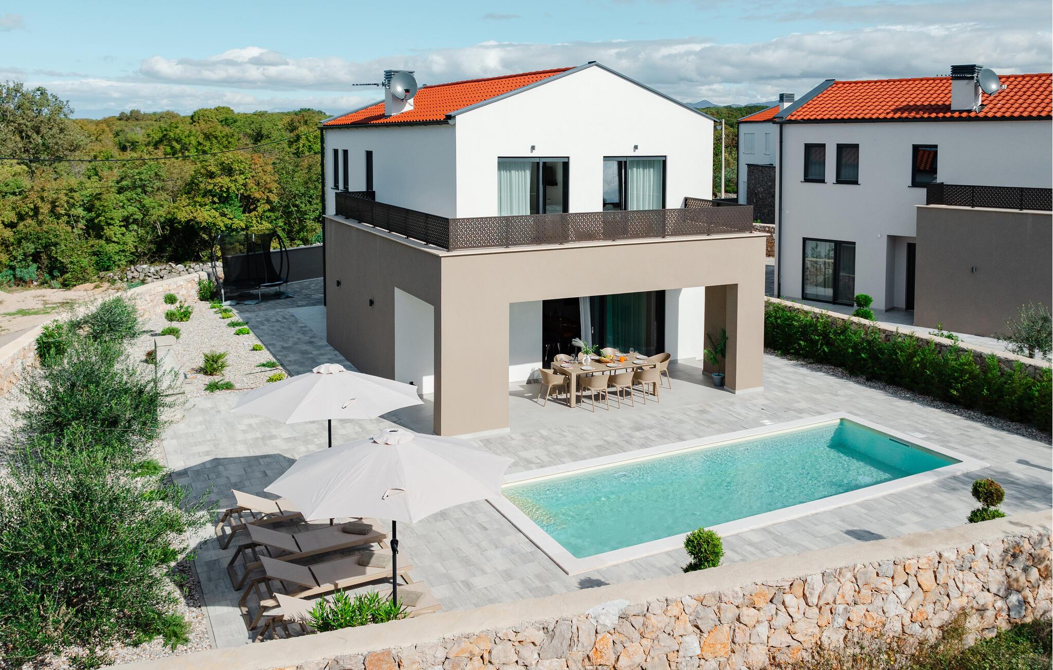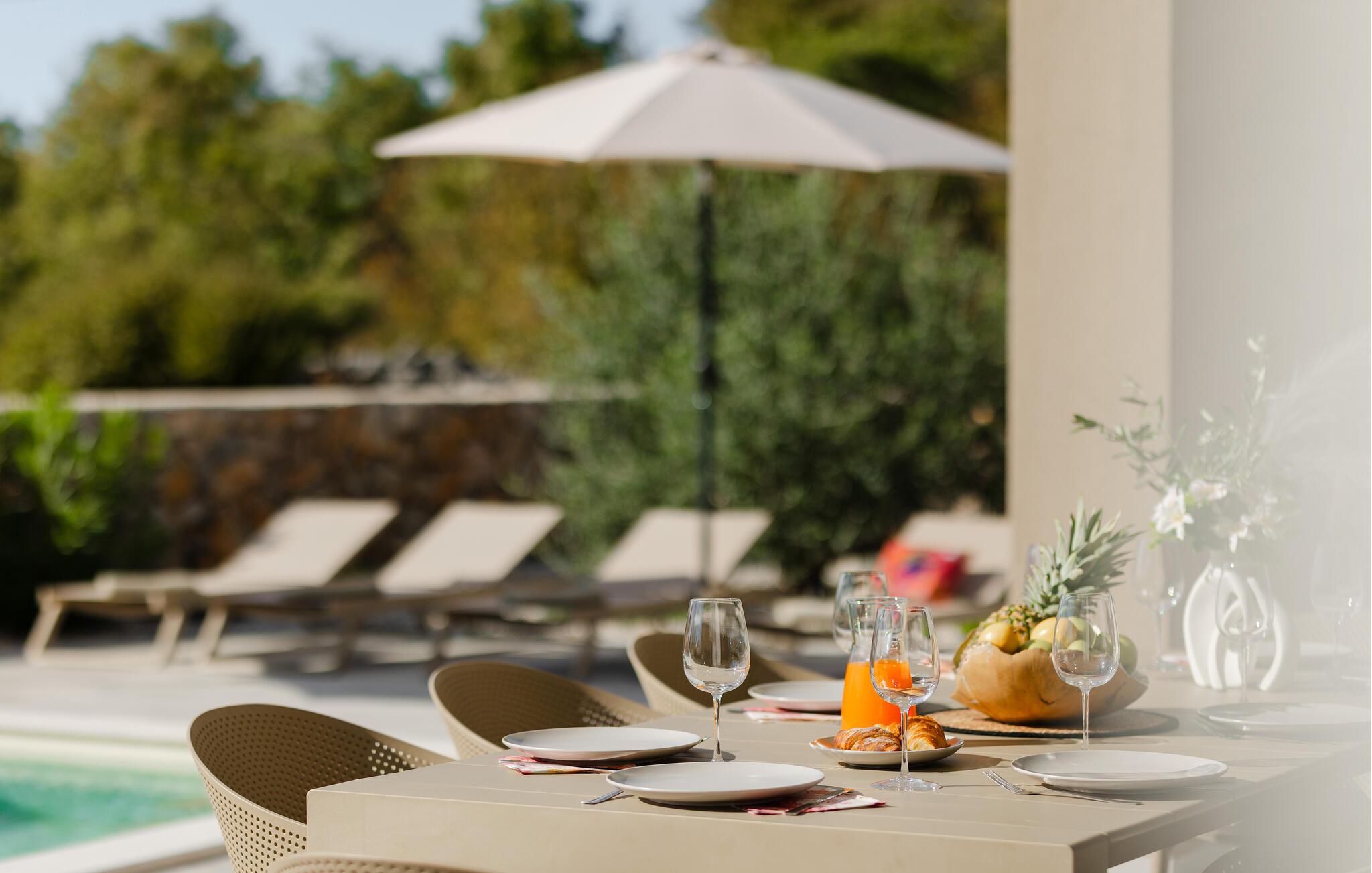 Udendørs finder I også dejlige steder at slappe af i solen. Gør det behageligt med kolde drikke på terrasserne med den smukke udsigt, slap af i liggestolen efter en forfriskende dukkert i poolen, og se jeres børn hoppe på trampolinen.
