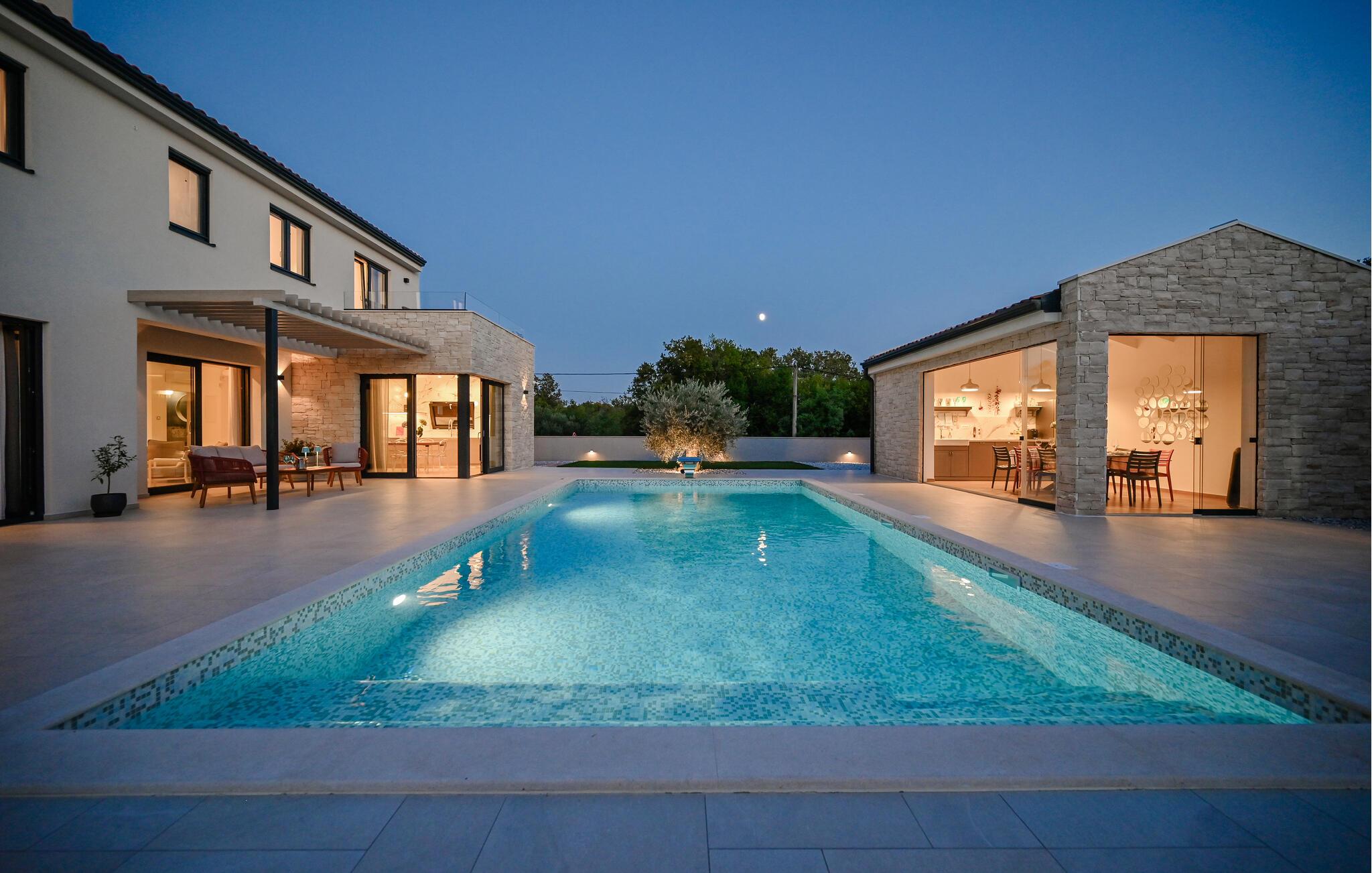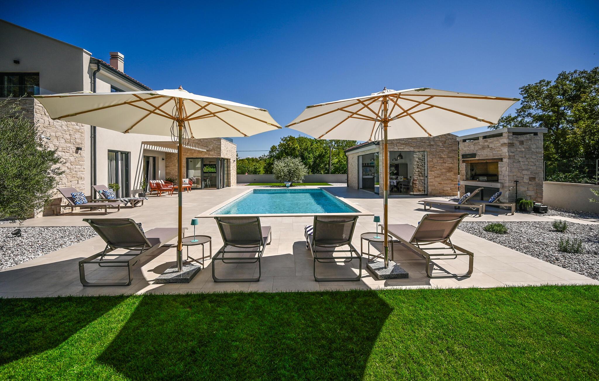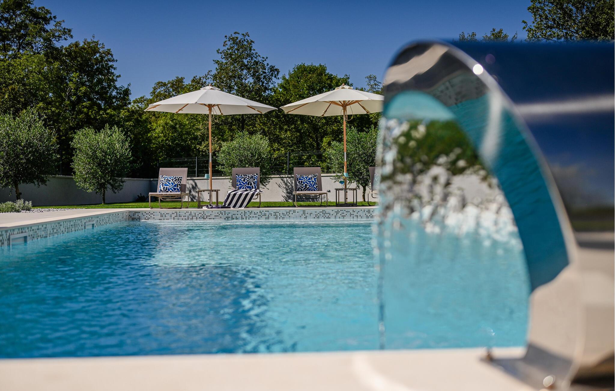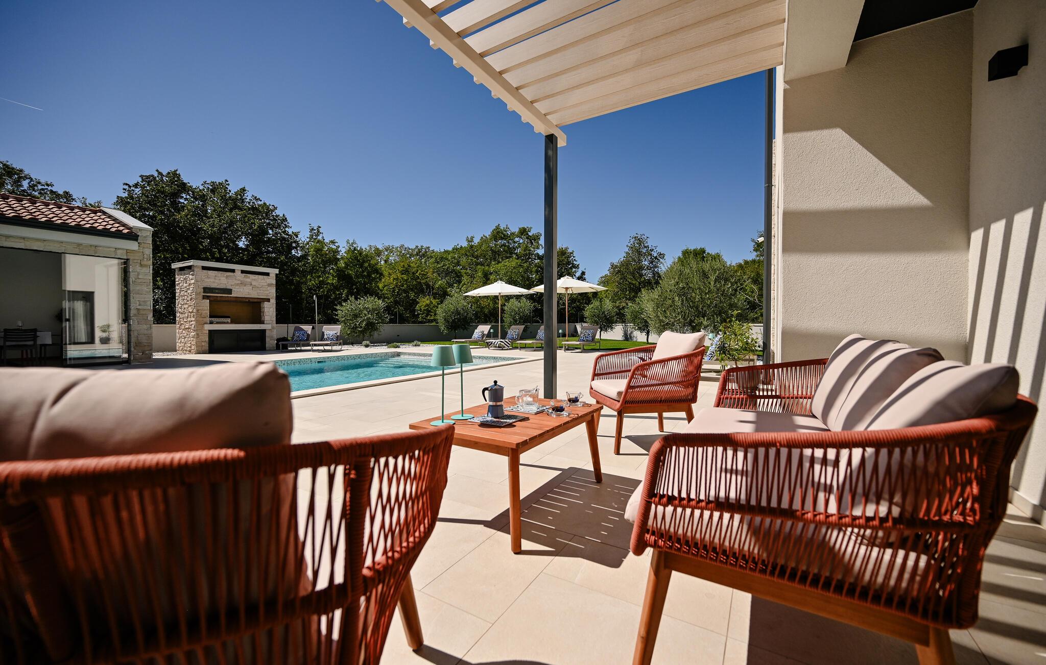 Begynd dagene med en morgenkaffe udendørs og nyd den vidunderlige udsigt over det omkringliggende landskab. Snup en frisk dukkert i poolen, svøm et par baner eller spil en omgang vandpolo. Om aftenen inviterer den dejlige terrasse jer til at grille med venner og familie og nyde en afslappende afslutning på dagen under åben himmel.