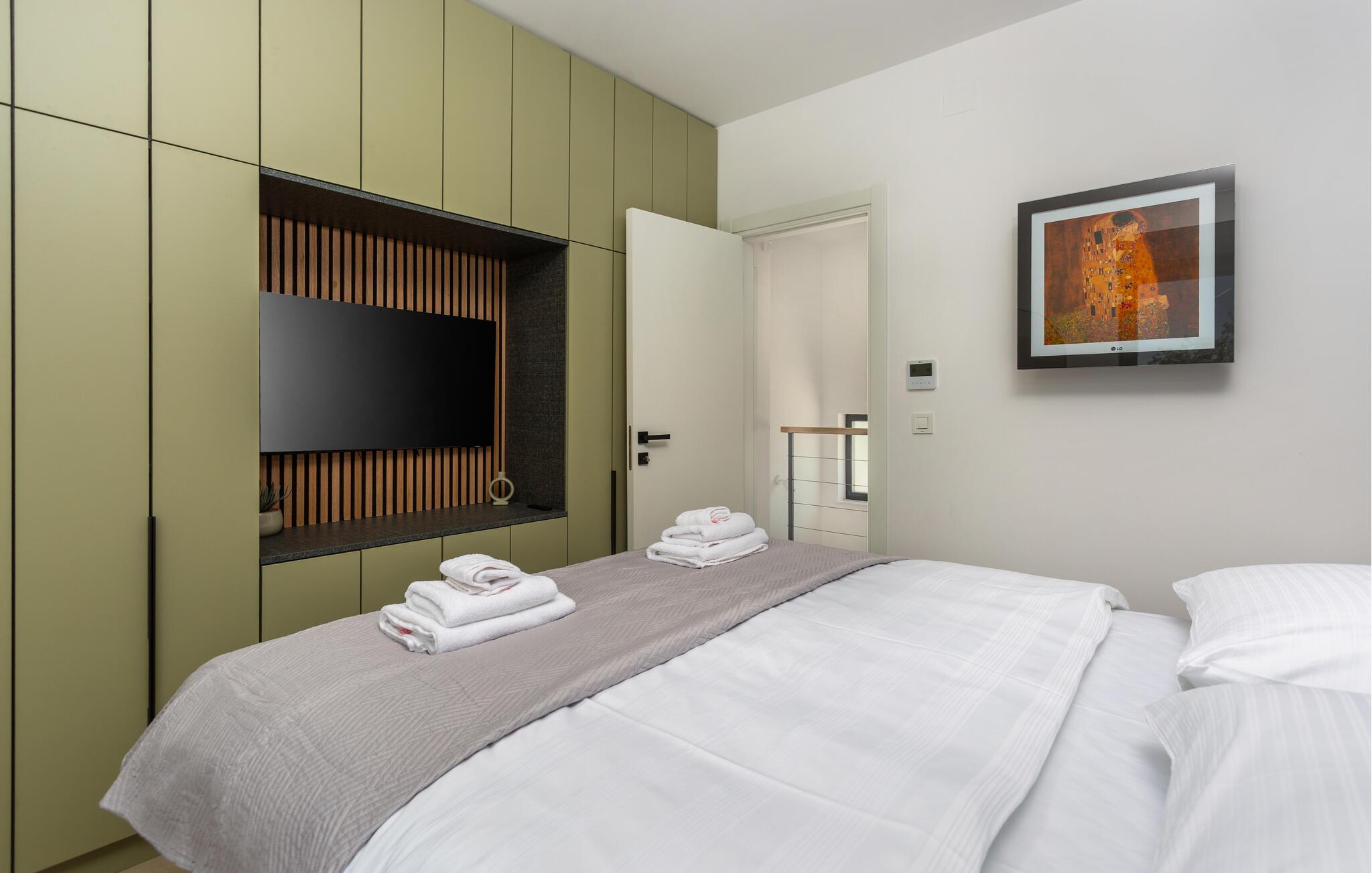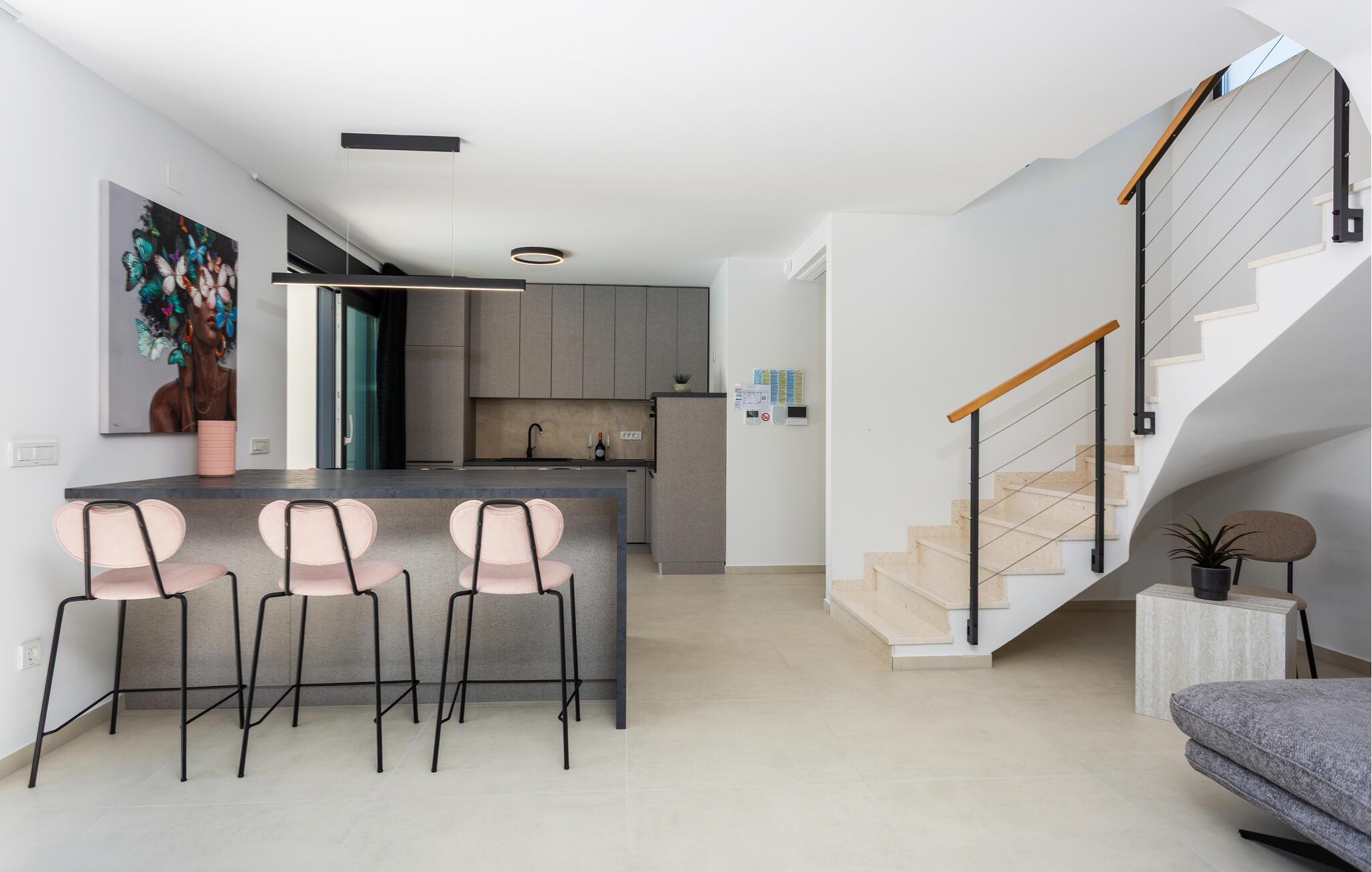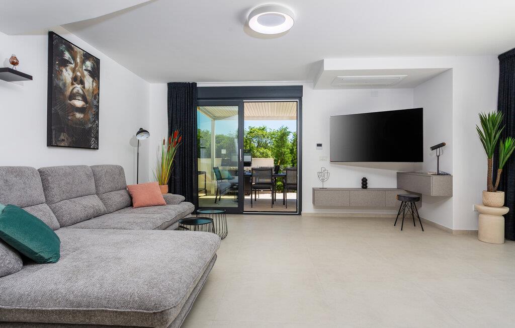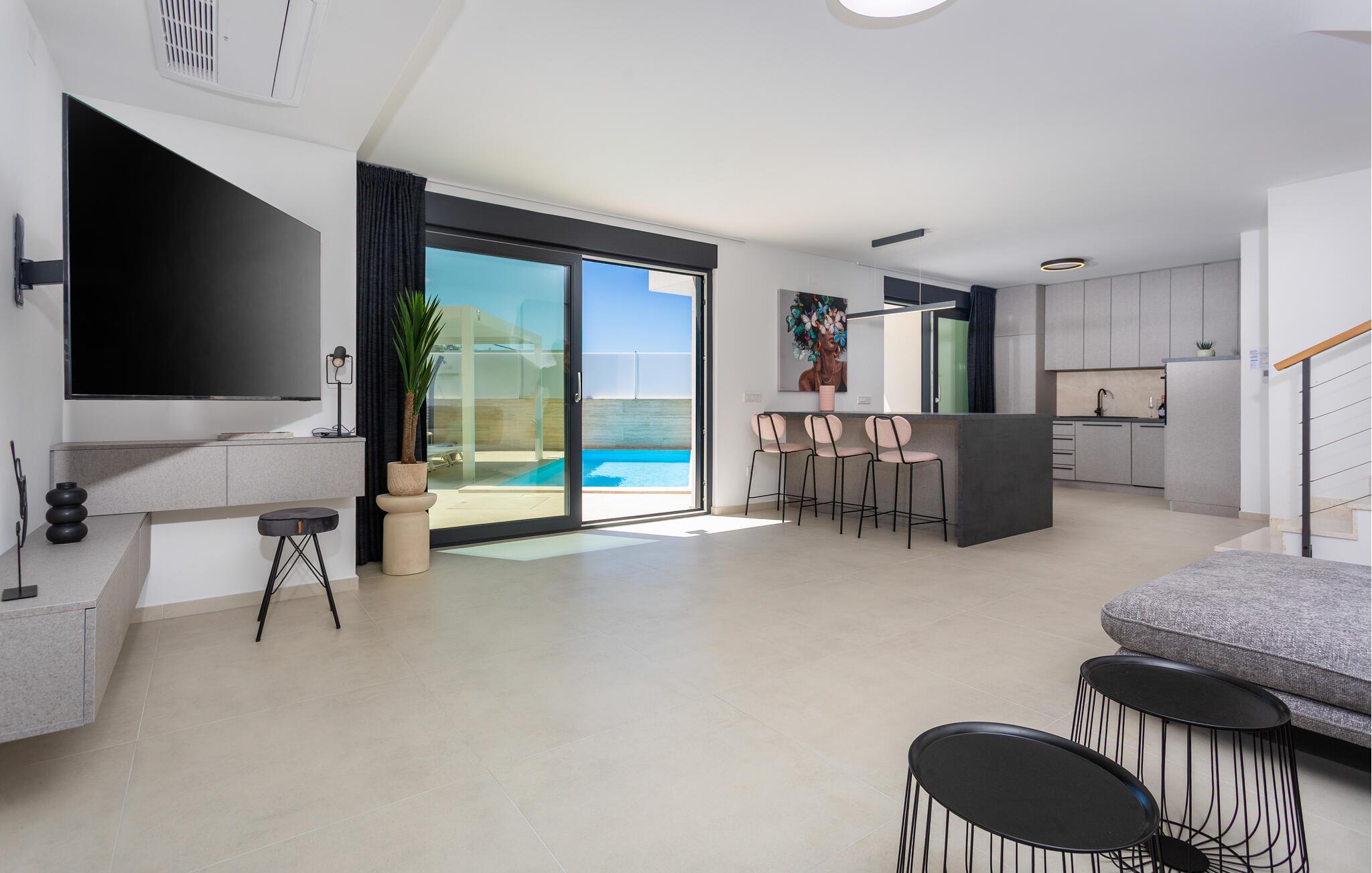 Dette moderne feriehus byder jer velkommen med stilfuldt møblerede interiører og en behagelig boligatmosfære. Bliv inspireret til at skabe kulinariske højdepunkter i det åbne køkken og Find jer til rette for jer til hyggelige filmaftener i den rummelige sofagruppe.