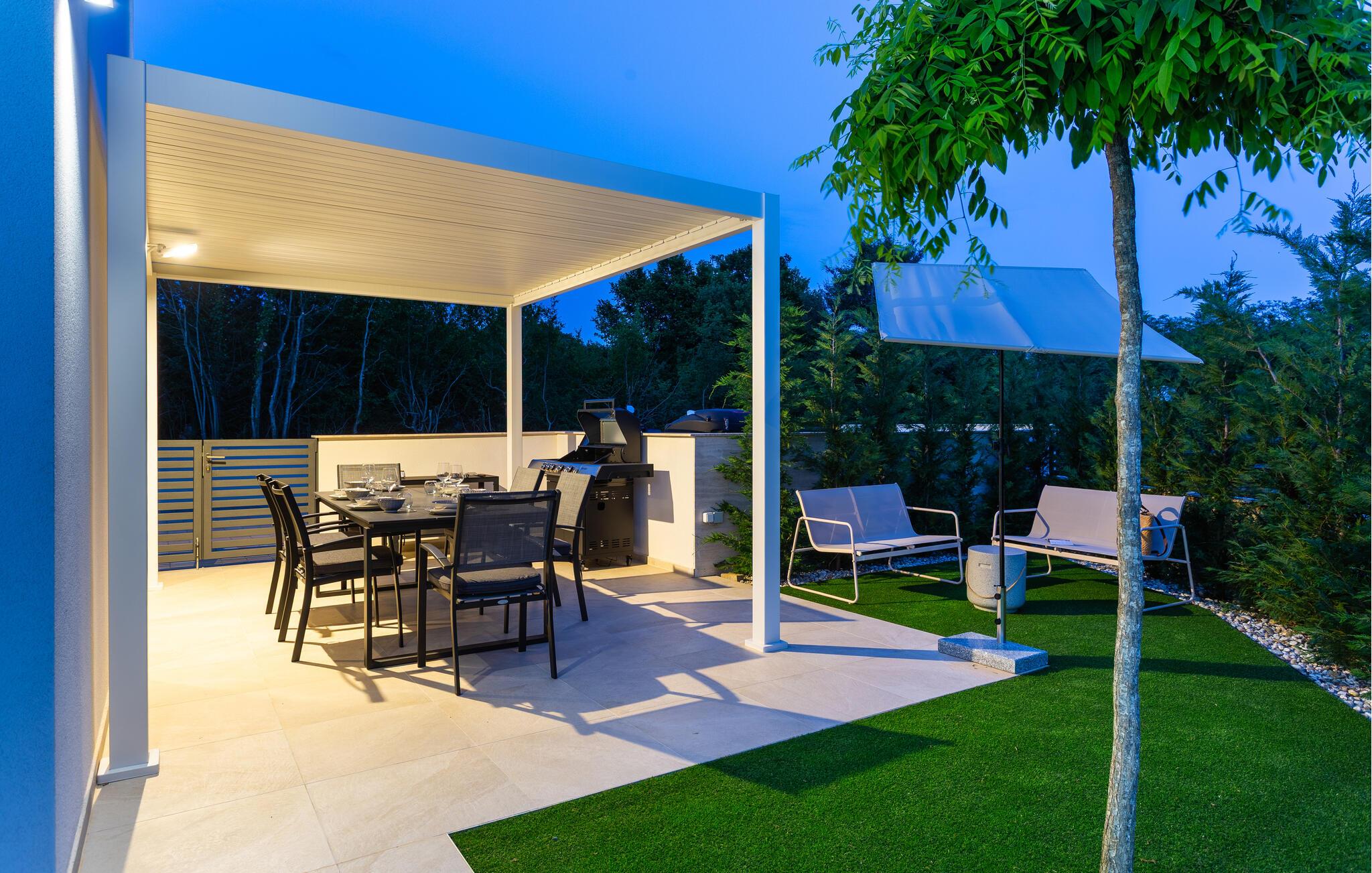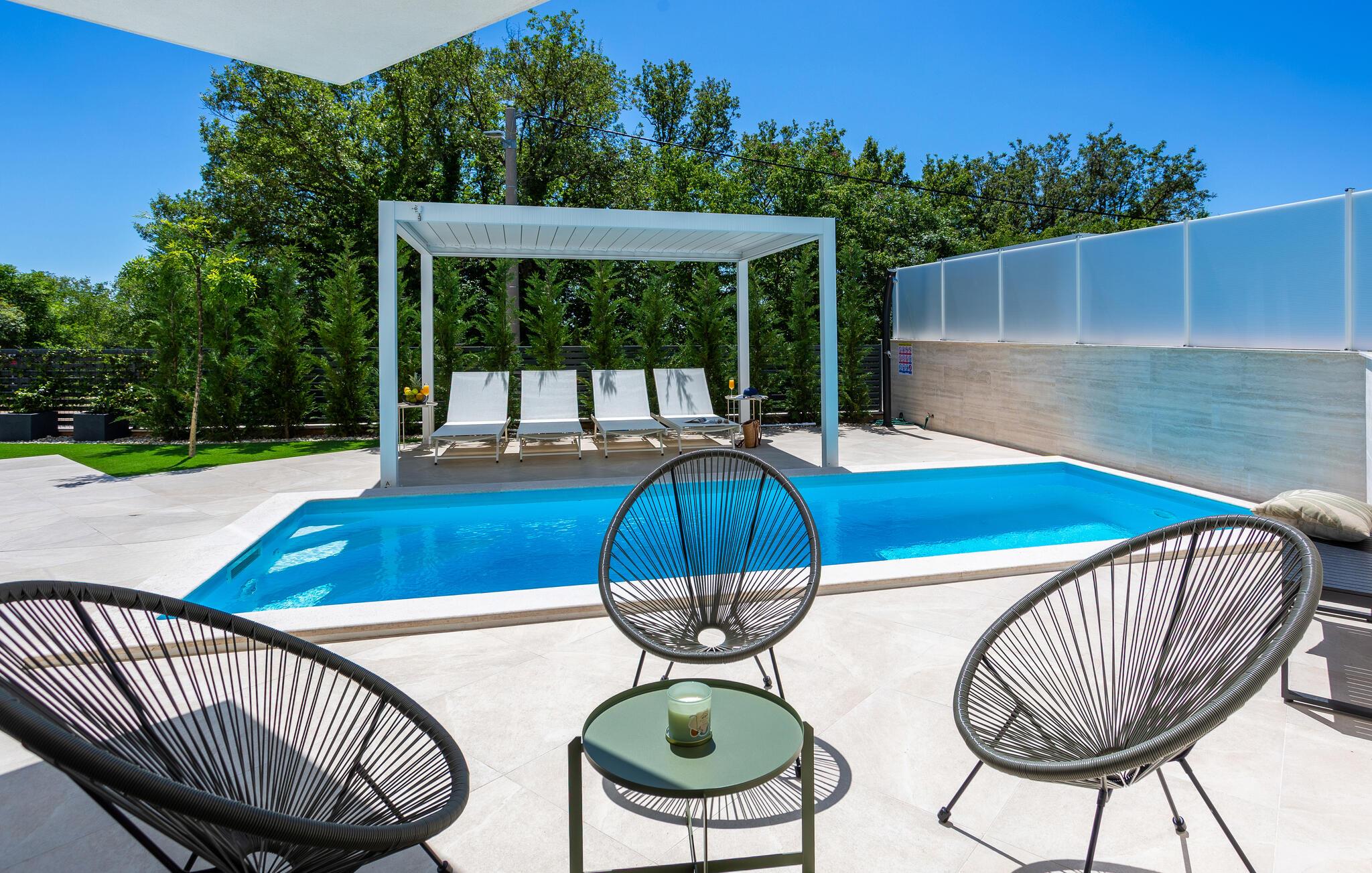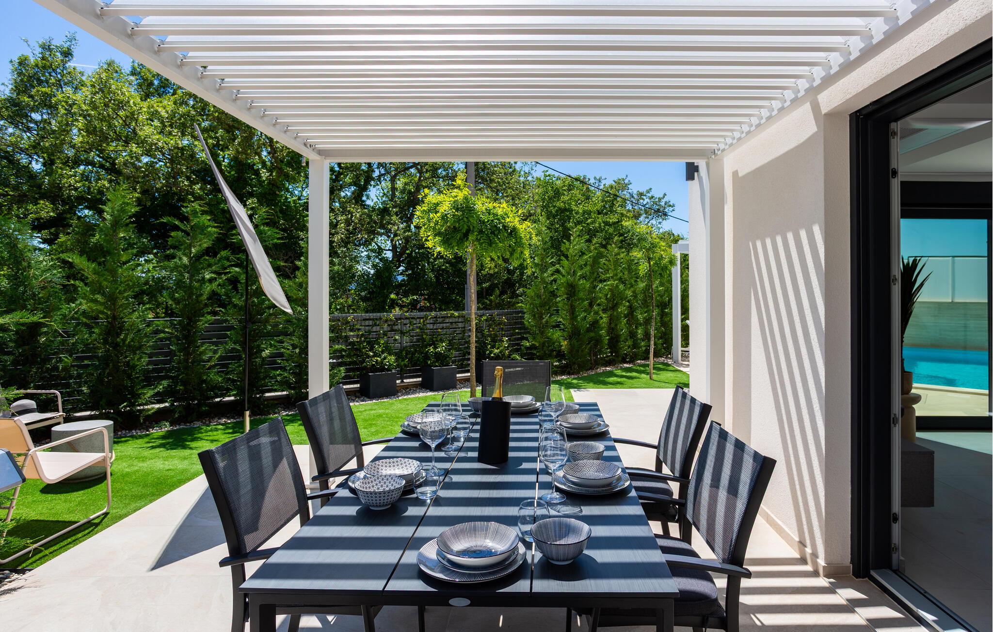 gå barfodet op til jeres solrige terrasse om morgenen og tag afslappende svømmebaner i den smukke pool. Lange timer under den blå himmel, afslappende læsning i skyggen og hyggelige måltider på den indbydende terrasse venter jer. Tænd op i grillen og snak over vin og stearinlys til langt ud på den varme sommernat.