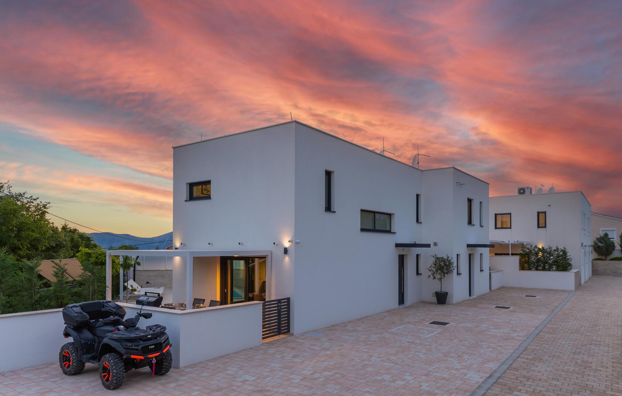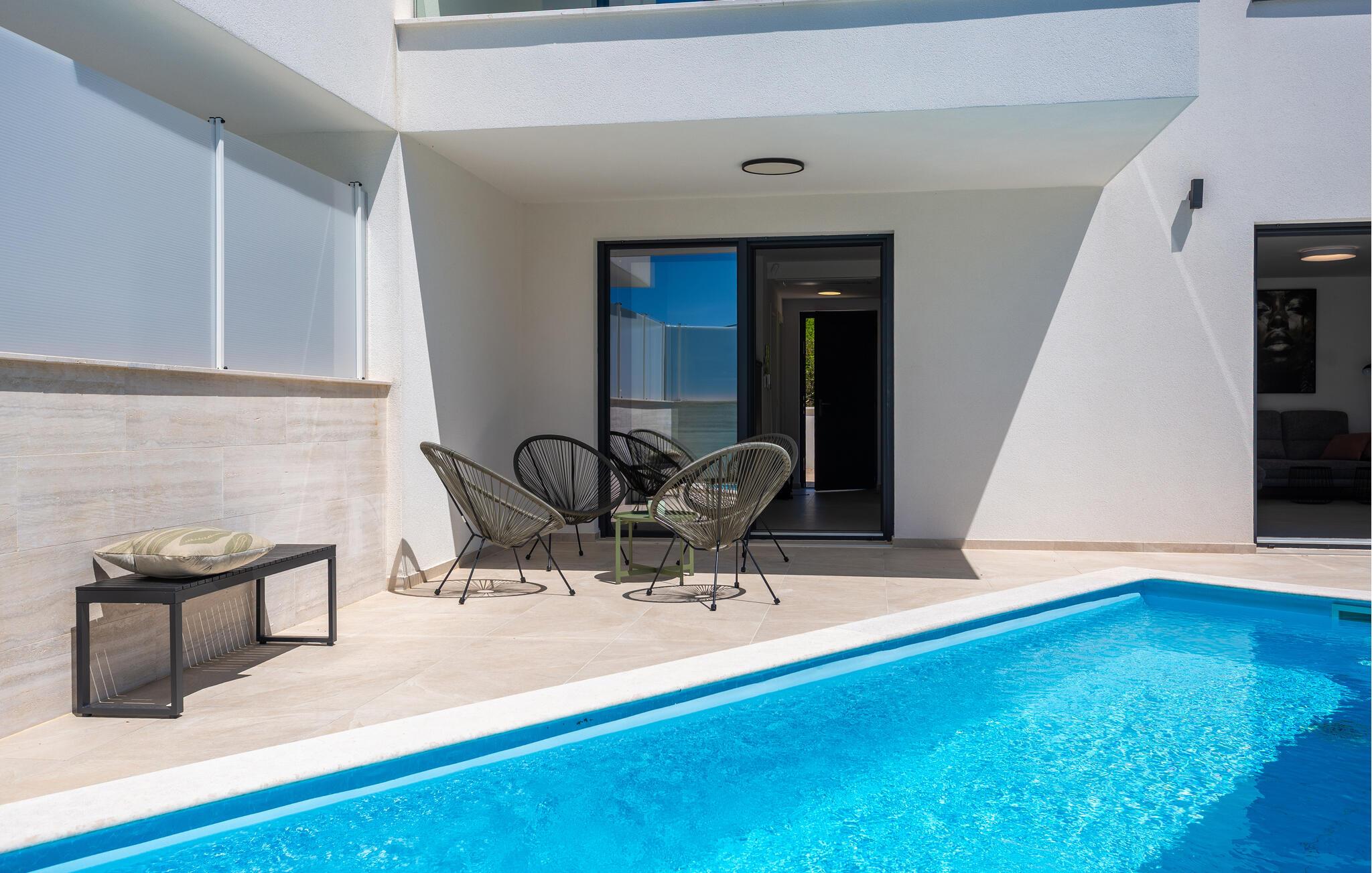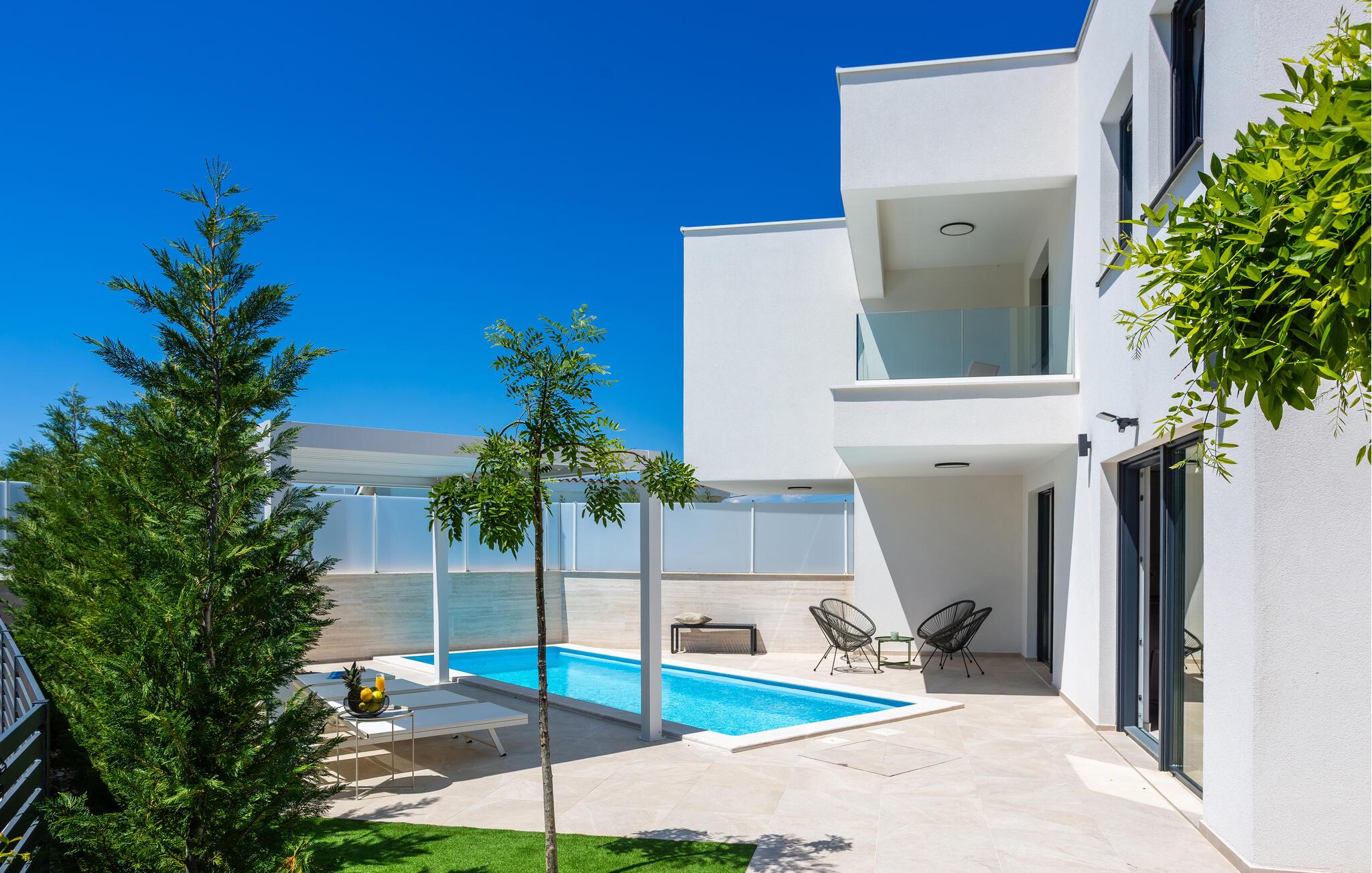 gå barfodet op til jeres solrige terrasse om morgenen og tag afslappende svømmebaner i den smukke pool. Lange timer under den blå himmel, afslappende læsning i skyggen og hyggelige måltider på den indbydende terrasse venter jer. Tænd op i grillen og snak over vin og stearinlys til langt ud på den varme sommernat.