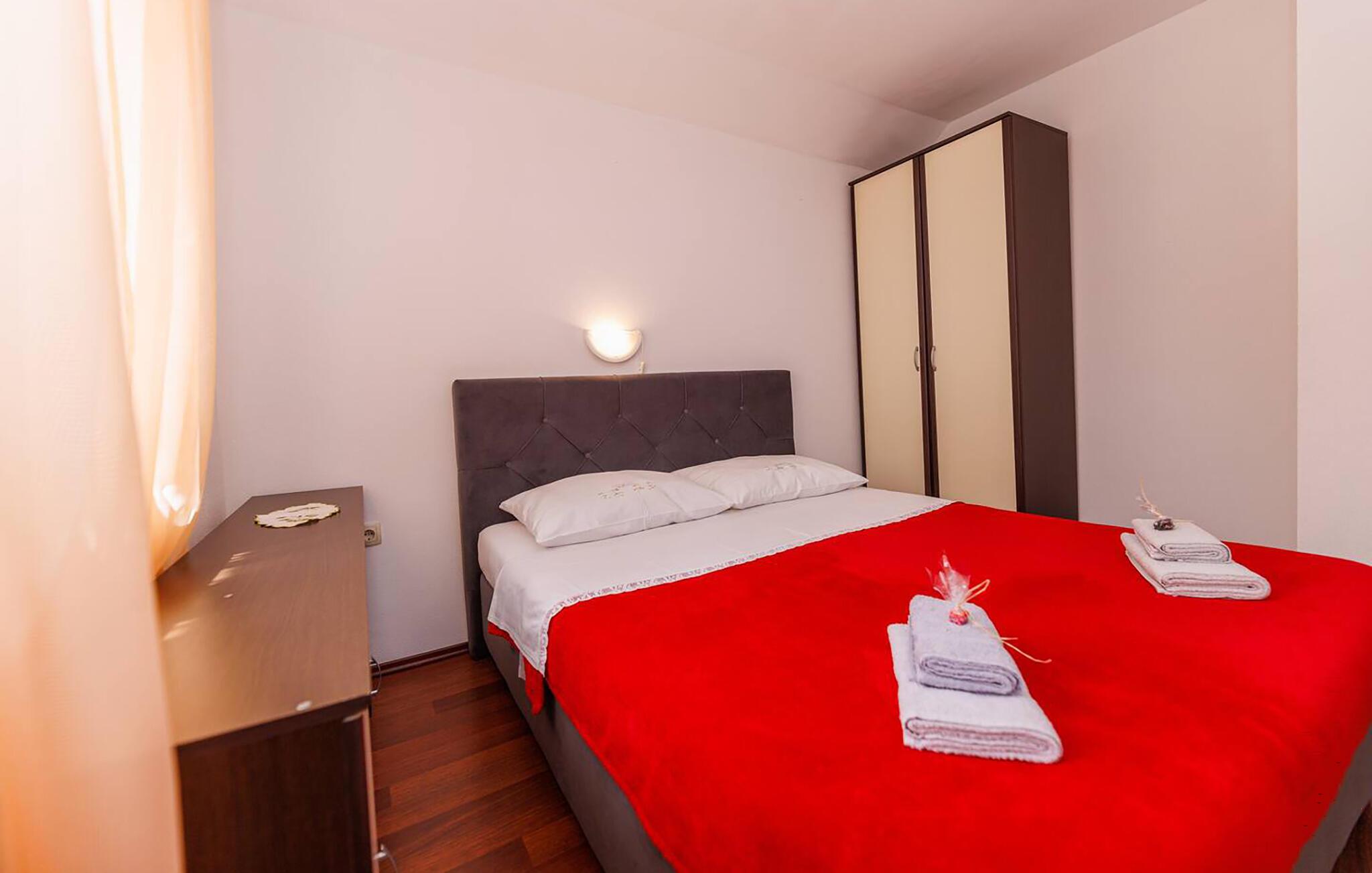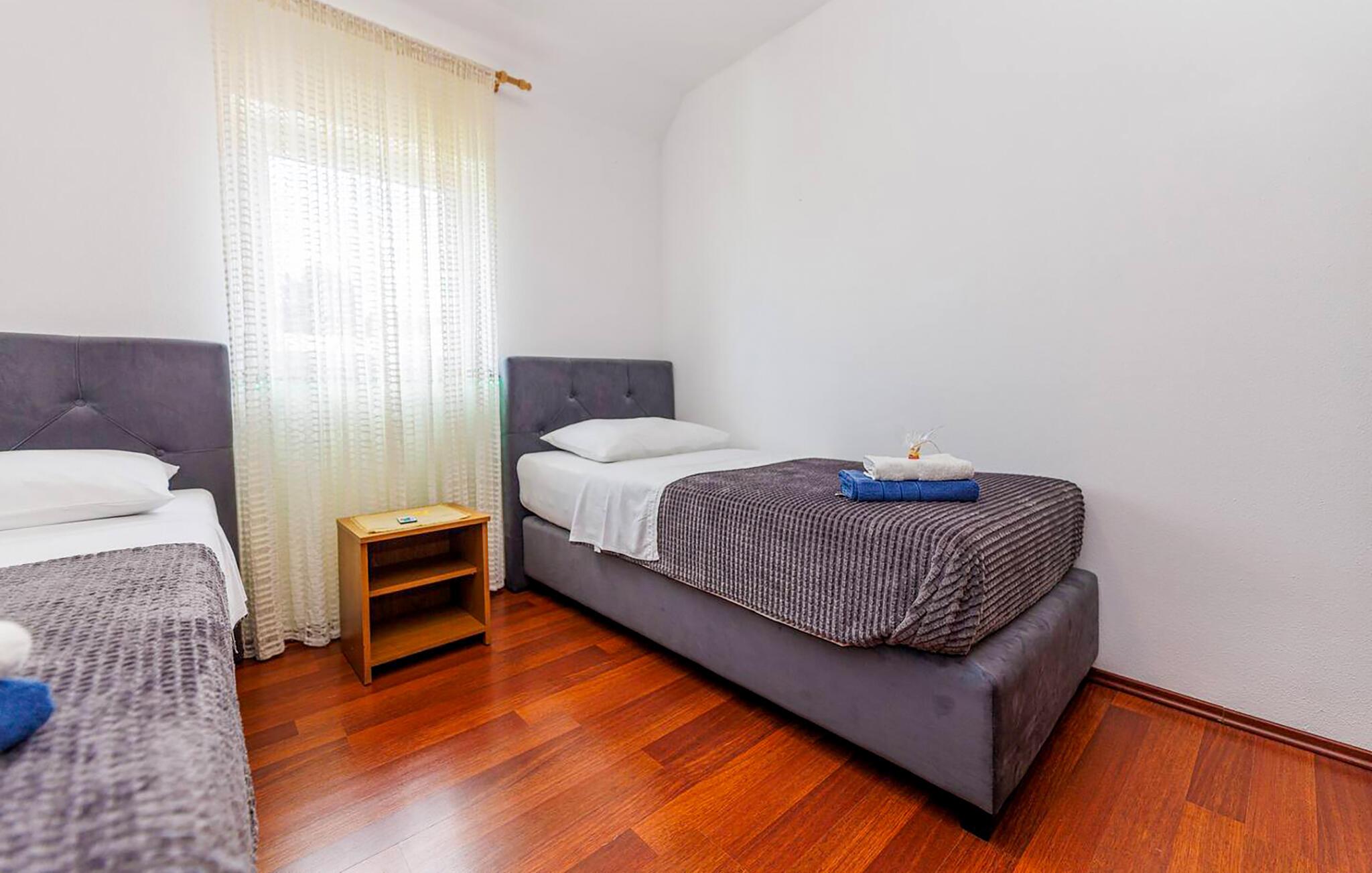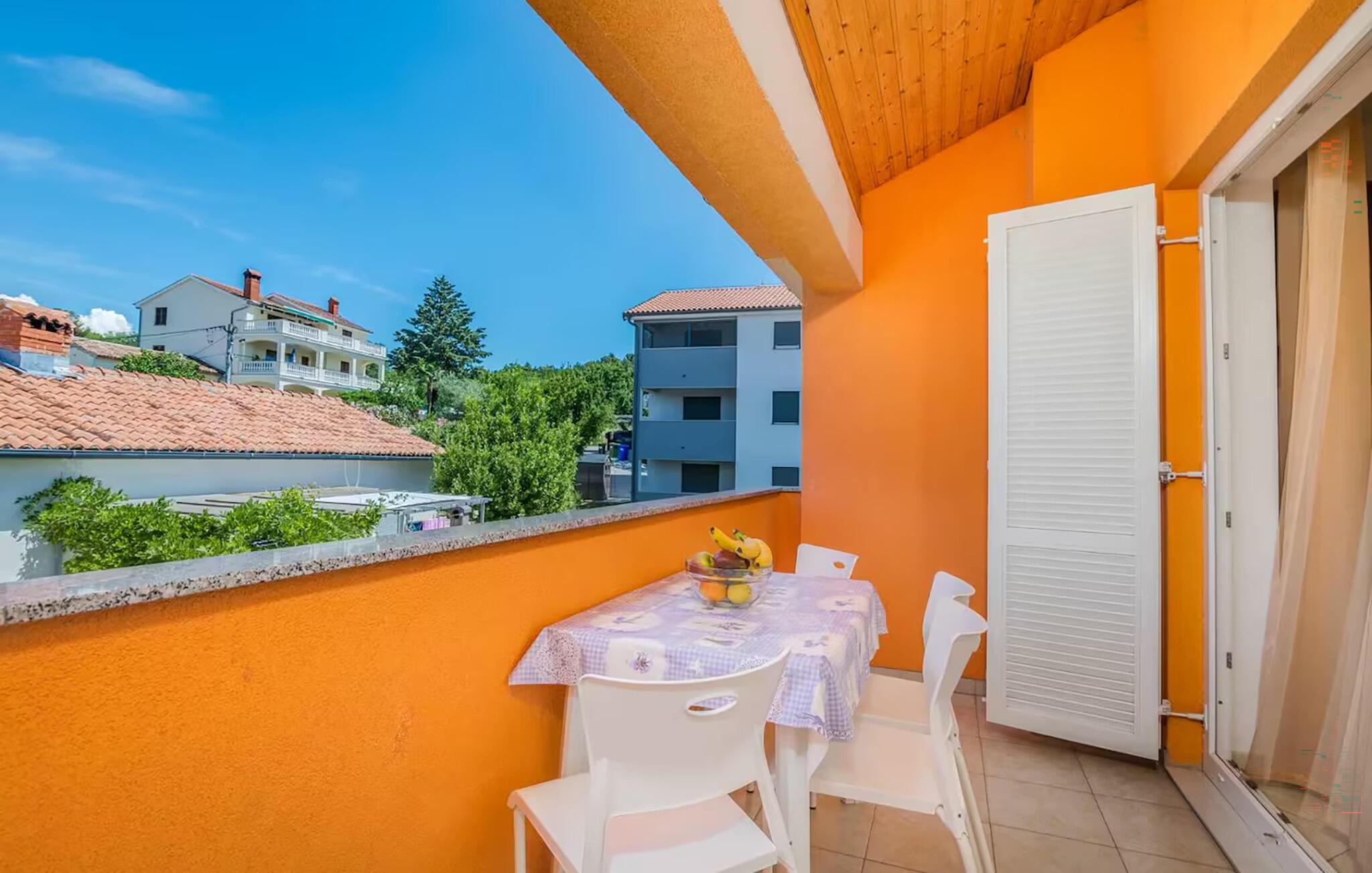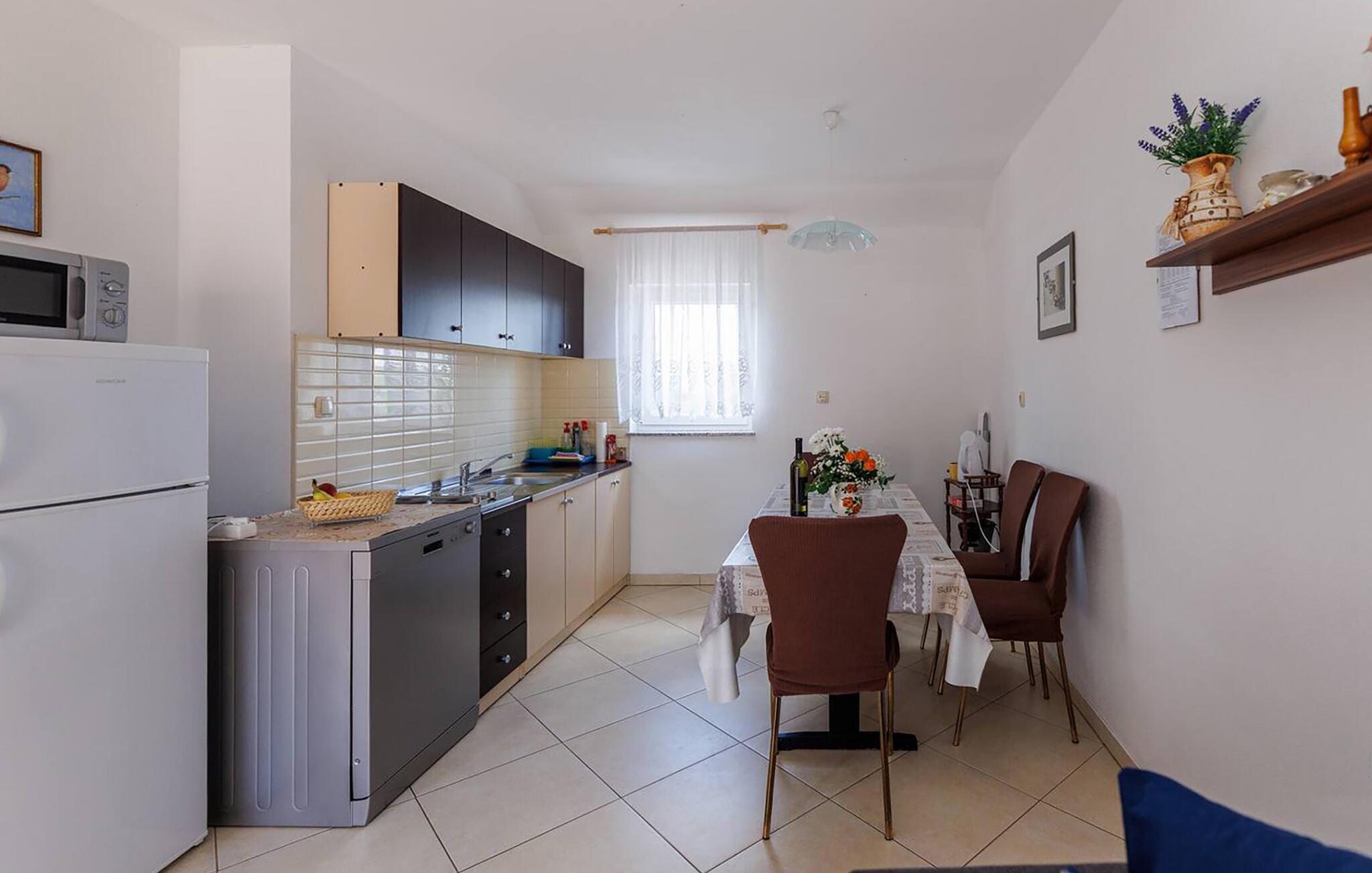 Tilbring afslappende dage i denne komfortable ferielejlighed med havudsigt. Denne velholdte lejlighed ligger kun en kort gåtur fra stranden og byder jer velkommen med en lys og indbydende atmosfære. Tilbered lækre måltider med lokale råvarer, planlæg jeres aktiviteter over afslappende måltider, og afslut en begivenhedsrig dag med en sjov spilleaften eller en god film på den hyggelige sofa. Server morgenmad på altanen - hvor I allerede kan se det nærliggende hav. Om aftenen kan I nyde middelhavsatmosfæren med et glas vin. Udforsk den charmerende gamle bydel i Krk med dens historiske mure og snoede gader, cykl langs kysten og opdag skjulte bugter til svømning og snorkling. Slentr gennem de smalle, stejle gader i den maleriske landsby Vrbnik, prøv lokal mad på traditionelle restauranter, og tag en bådtur til de nærliggende øer. For aktive feriegæster er kajak- eller stand-up paddle-ture langs kysten en god mulighed, mens I kan nyde solen på strandene i Malinska eller Porat.
