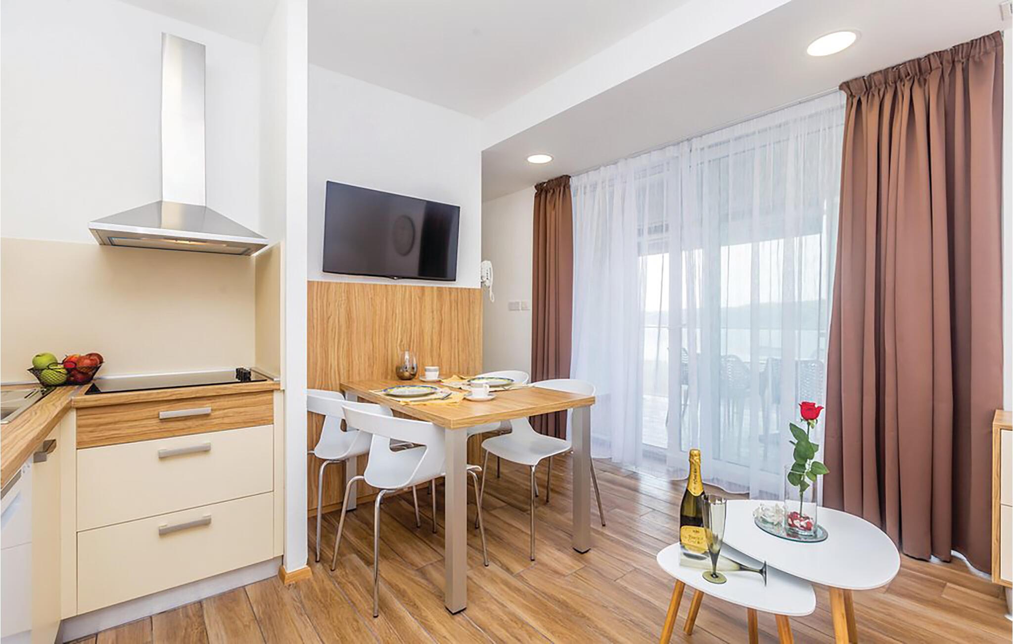 Tilbring solrige dage i denne komfortable ferielejlighed med adgang til poolen og havudsigt. Kun få skridt fra en plateaustrand inviterer denne lyse lejlighed jer til en afslappende ferie med venner eller familie. Tilbered lækre måltider og nyd harmoniske måltider sammen. Slå jer ned til en filmaften eller et brætspil i stuen, eller fordyb jer i jeres ferielæsning. Server morgenmaden på terrassen og lad jer betage af udsigten over det turkisblå hav. På varme dage kan I forfriske jer i den fælles pool, lade op på en liggestol og afslutte dagen med et glas vin under åben himmel. Tag en bådtur til de nærliggende bugter og strande, eller udforsk kystlinjen i kajak. Slentr gennem de smalle gader i Krks gamle bydel og prøv regionale specialiteter i hyggelige tavernaer. Cykl gennem olivenlunde og fyrreskove, eller vandr på stierne i Velebitbjergene. Besøg markedet i Punat og nyd middelhavsatmosfæren under en aftentur langs havnen.
