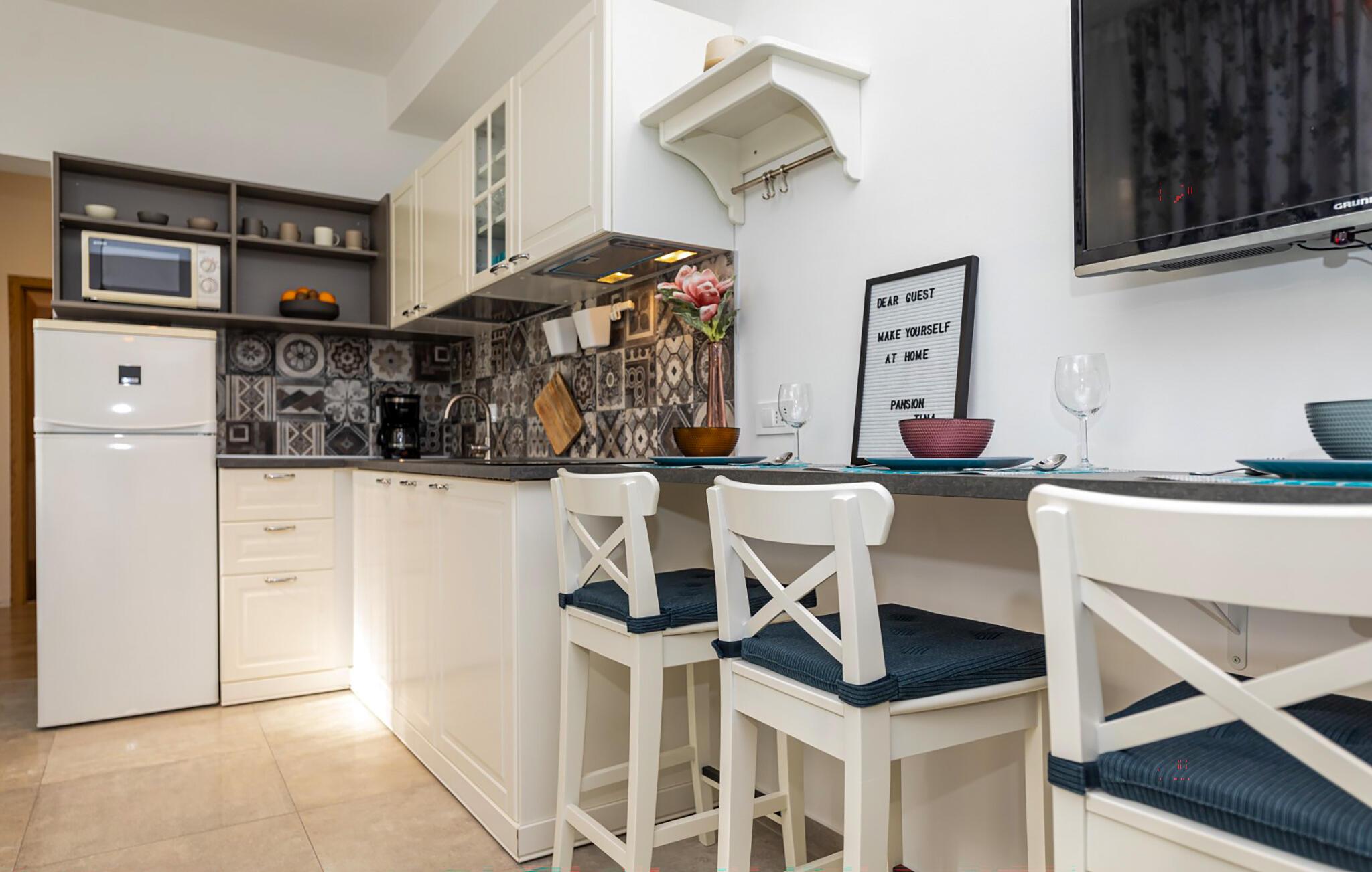 I opholdsstuen skaber de smagfulde møbler en behagelig atmosfære. Læn jer tilbage i den komfortable sofa og nyd jeres ferie fuldt ud. Tilbered lækre retter i det praktiske køkken og nyd dem ved det tilstødende spisebord. Oplev den harmoniske blanding af moderne møbler, rene linjer og gennemtænkte detaljer, der gør interiøret så indbydende.