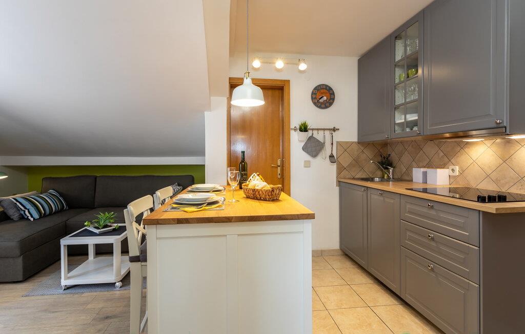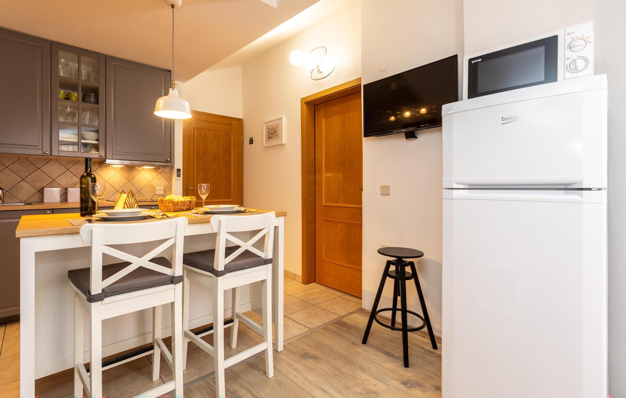 I opholdsstuen skaber de smagfulde møbler en behagelig atmosfære. Læn jer tilbage i den komfortable sofa og nyd jeres ferie fuldt ud. Tilbered lækre retter i det praktiske køkken og nyd dem ved det tilstødende spisebord. Oplev den harmoniske blanding af moderne møbler, rene linjer og gennemtænkte detaljer, der gør interiøret så indbydende.