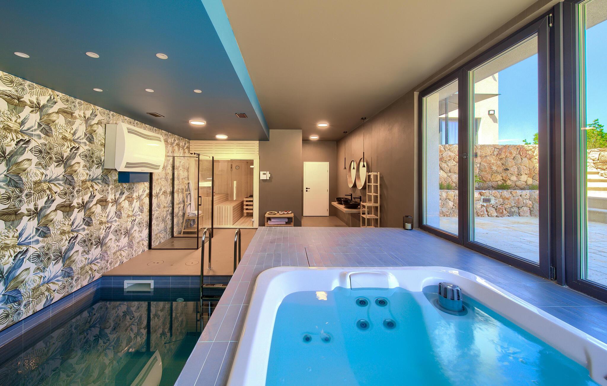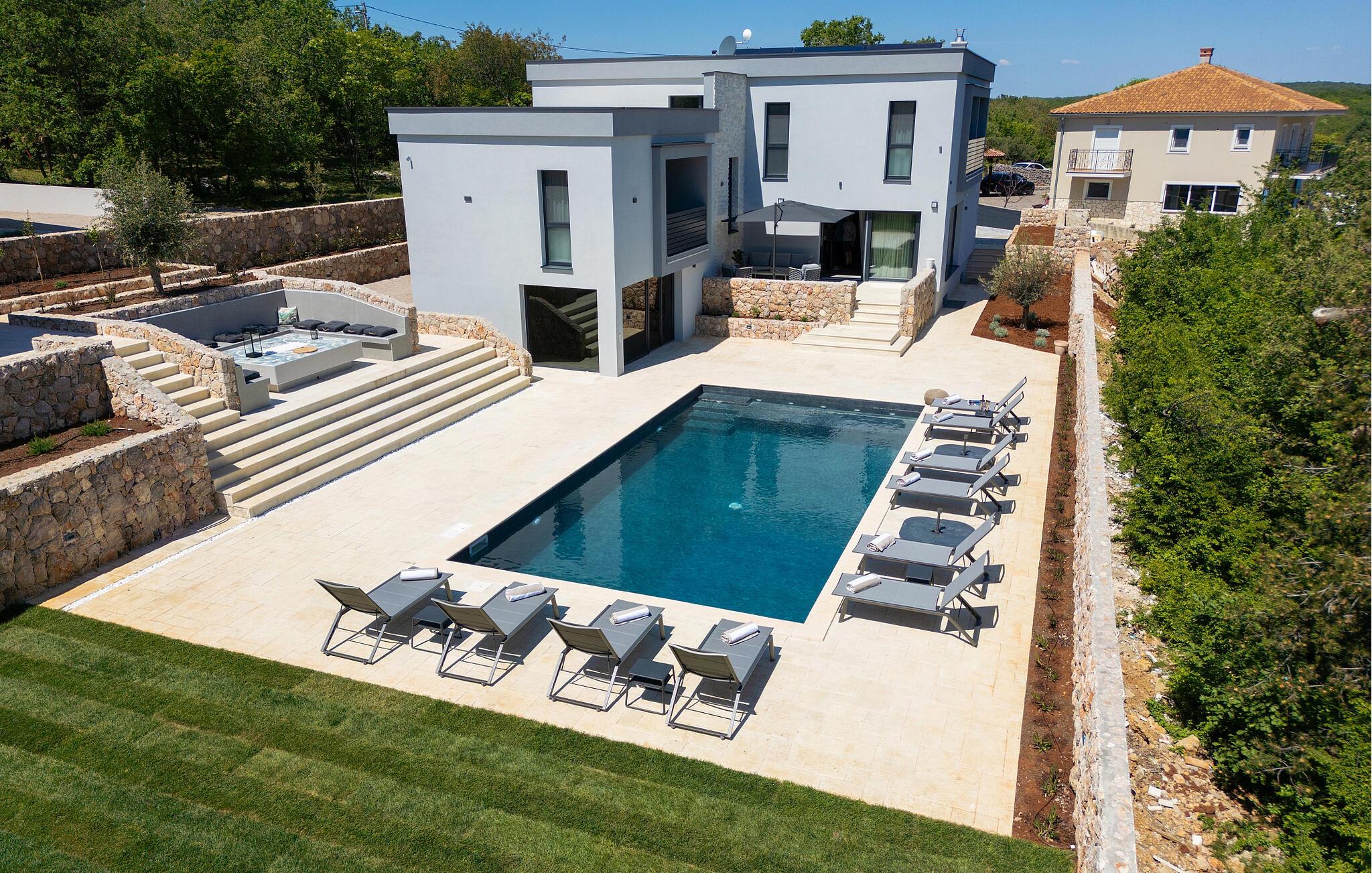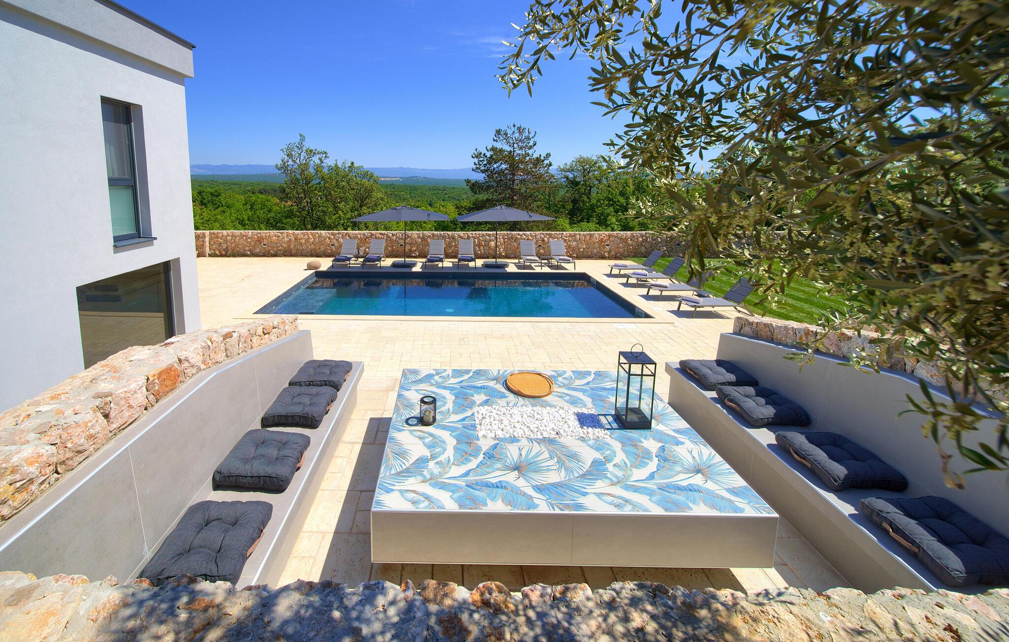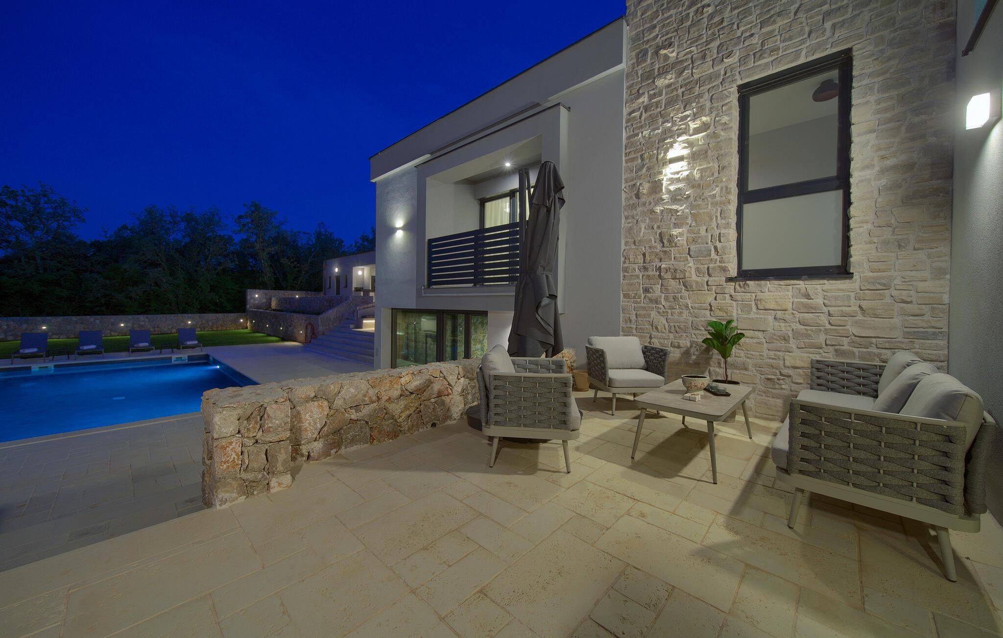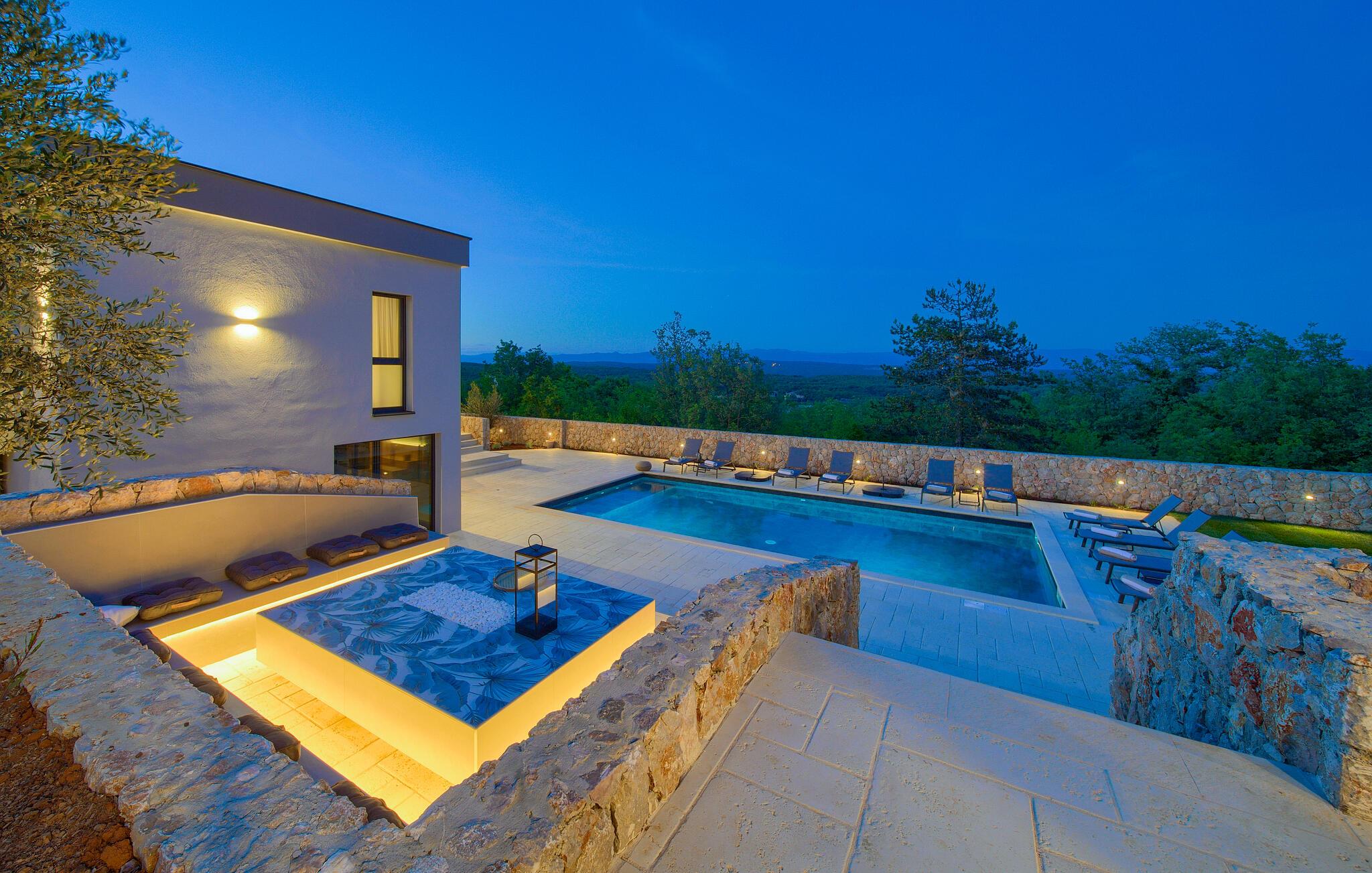 Slap af på den store udendørsterrasse og tilbring hyggelige aftener ved grillen. De komfortable solsenge omkring udendørspoolen indbyder til afslapning. Nyd solen og den klare himmel over Krk, mens jeres børn hopper på trampolinen. I den hyggelige stue finder I alt til afslappede stunder. Gør jer det behageligt på den komfortable sofa foran den moderne brændeovn og nyd udsigten ud i det fri.