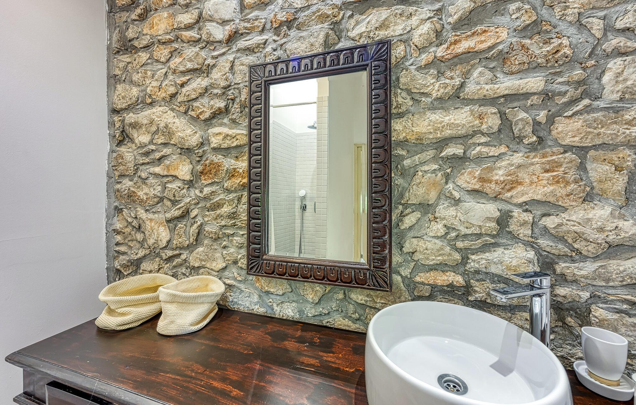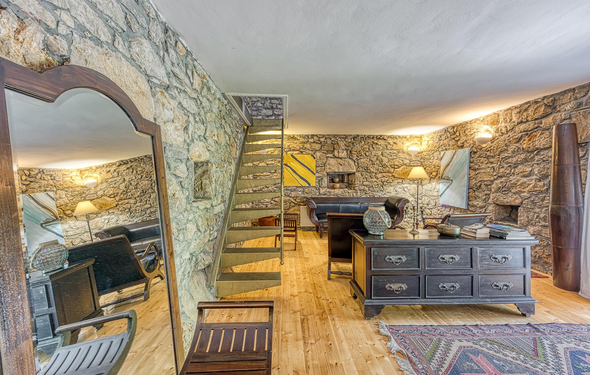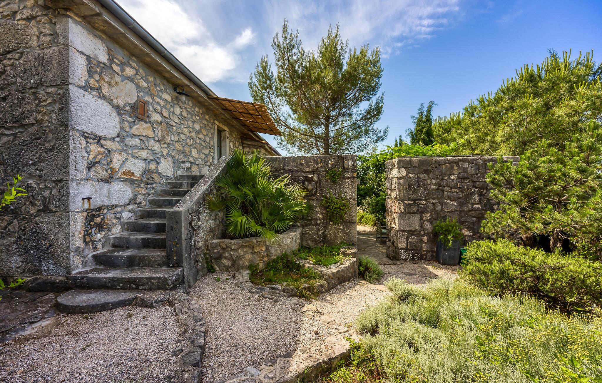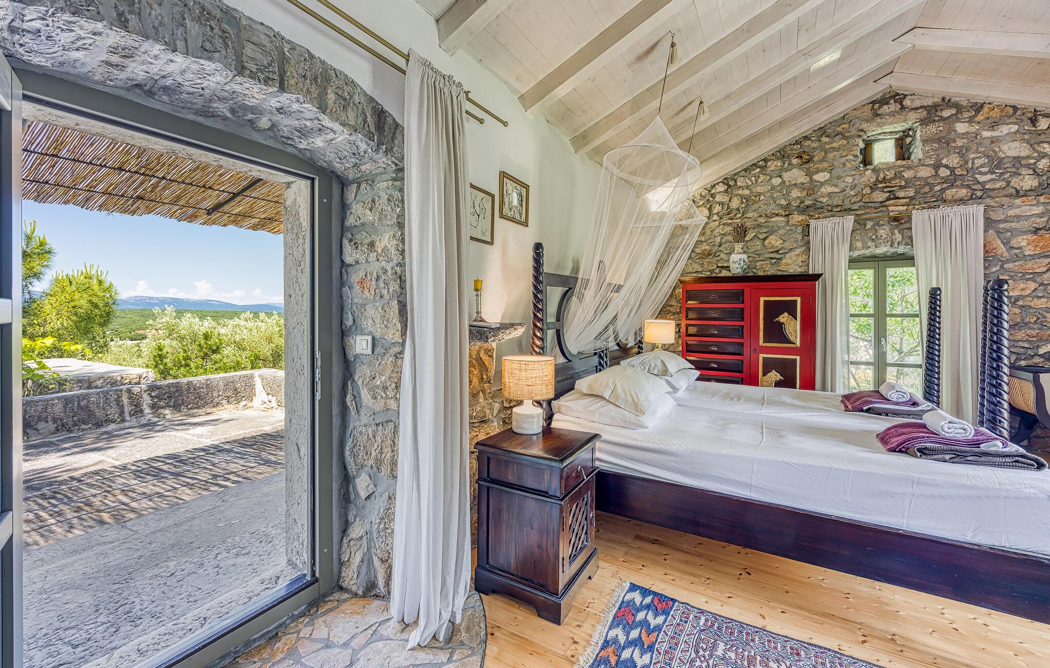 I smukke, grønne omgivelser ligger denne drømmevilla fra 1827, som er renoveret i husets oprindelige stil og indrettet med stor kærlighed til detaljen. Kombinationen af rustik indretning og moderne swimmingpool passer perfekt til denne drøm af en oase. I stueetagen har I det rummelige køkken og stuen, mens de to soveværelser ligger ovenpå. Et af soveværelserne kan I kun komme til ad en udendørs trappe. På den lukkede naturgrund er der desuden både swimmingpool og terrasse. Herfra har I en vidunderlig udsigt ud over havet og den charmerende ø Krk. Det lille hyggelige hus ved siden af byder på endnu et soveværelse med eget badeværelse. Alle værelserne er smagfuldt og traditionelt indrettede. Snup en forfriskende dukkert i poolen, og nyd en kop god kaffe eller en spændende bog på terrassen! Et besøg i byen Krk må varmt anbefales. Især i løbet af sommeren summer byen af mange kunstmalere og orkestre. De andre maleriske steder på øen, f.eks. Vrbnik, Baska, Malinska, Punat og den lille ø Kosljun, bør I bestemt også udforske. Og tag en tur med båd til øerne Rab, Cres eller Losinj. Koljun er en lille ø i bugten Puntarska Draga, som især er kendt for sin kulturarv. I løbet af sommerfestivalen i Krk afholdes der koncerter i byens kloster - det er et must at opleve.