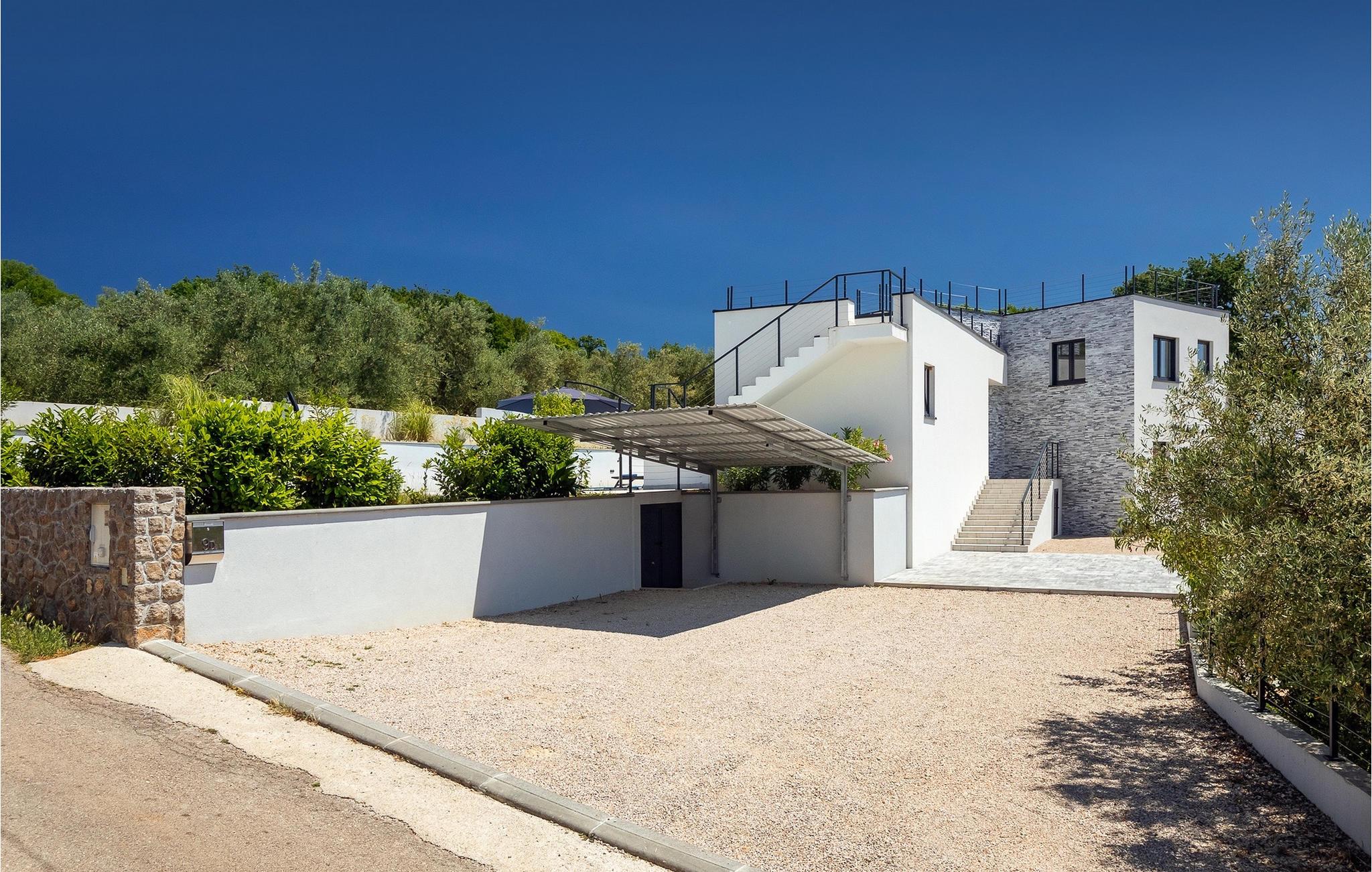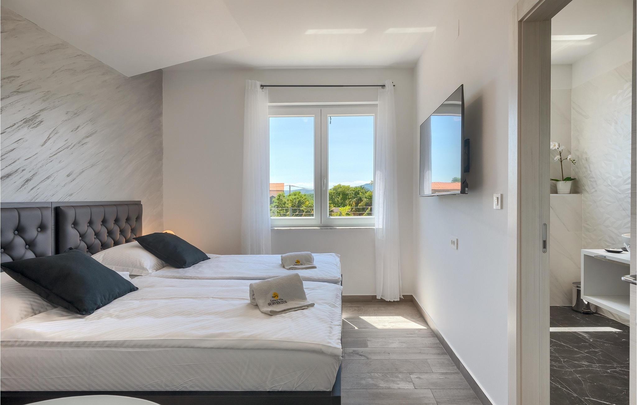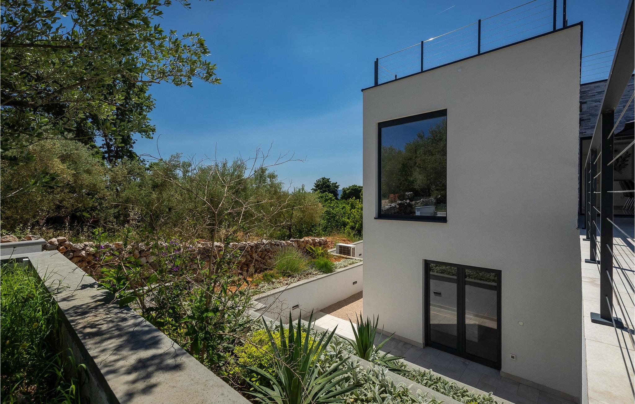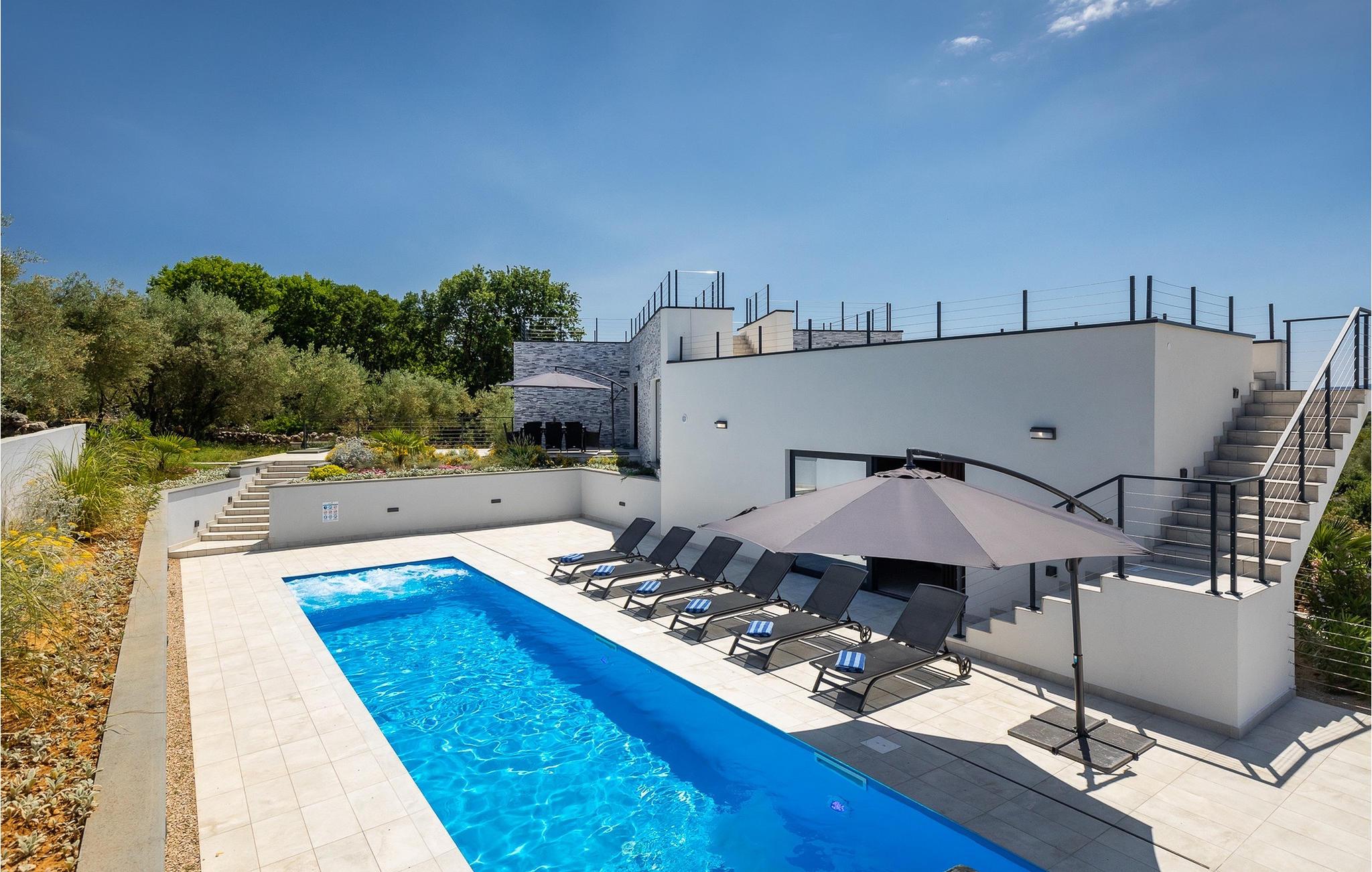 Denne store villa er beliggende på øen Krk, nær turistbyen Malinska. Med i alt 190 kvadratmeter boligareal byder den på plads til op til 6+2 personer og et nænsomt møbleret interiør. Den elegante og rummelige villa er opdelt i 3 etager og giver dig en følelse af hjem. Stueetagen består af 3 smukt indrettede soveværelser med harmoniske farvekombinationer. Et af soveværelserne har eget badeværelse med badekar. På mezzaninen er der et wellness-område med en finsk sauna og en jacuzzi, hvor du kan tilbringe afslappende stunder med din familie og venner. Fra wellnessområdet har du direkte adgang til poolområdet, hvor du kan slappe af på de komfortable liggestole og se børnene hygge sig ved poolen. Anden sal består af et opholdsområde med et fuldt udstyret køkken, en spiseplads med et stort familiebord og en stue med et tv. Få skridt væk ligger den smukke terrasse med en udendørs spiseplads, hvor du kan nyde måltider tilberedt på grillen. I opholdsområdet kan du gøre dig godt tilpas med en kop kaffe og nyde din ferie fuldt ud.Villa Subventus ligger i en lille landsby Bajcici, ikke langt fra turiststedet Malinska på øen Krk. Øen Krk er en af de største øer i Adriaterhavet og er forbundet med fastlandet med en bro. Øen Krk er et meget populært turistmål, der byder på mange turistattraktioner og er et ideelt udgangspunkt for mange udflugter. Vi anbefaler dig at opdage Kvarners skønheder såsom Opatija og Moscenicka Draga, gå langs promenaden Lungo mare og nyde en af de smukkeste solnedgange. Hvis du bare vil slappe af og nyde din ferie, har øen Krk alt hvad du behøver. Nyd de smukke strande i de mange skjulte bugter på øen og det mangfoldige kulinariske tilbud, der vil glæde alle elskere af gastronomi. Udover at være et fantastisk sted for alle hedonister, byder øen Krk på meget mere, såsom adskillige cykel- og vandrestier, dykkersteder og adskillige sportsmuligheder.