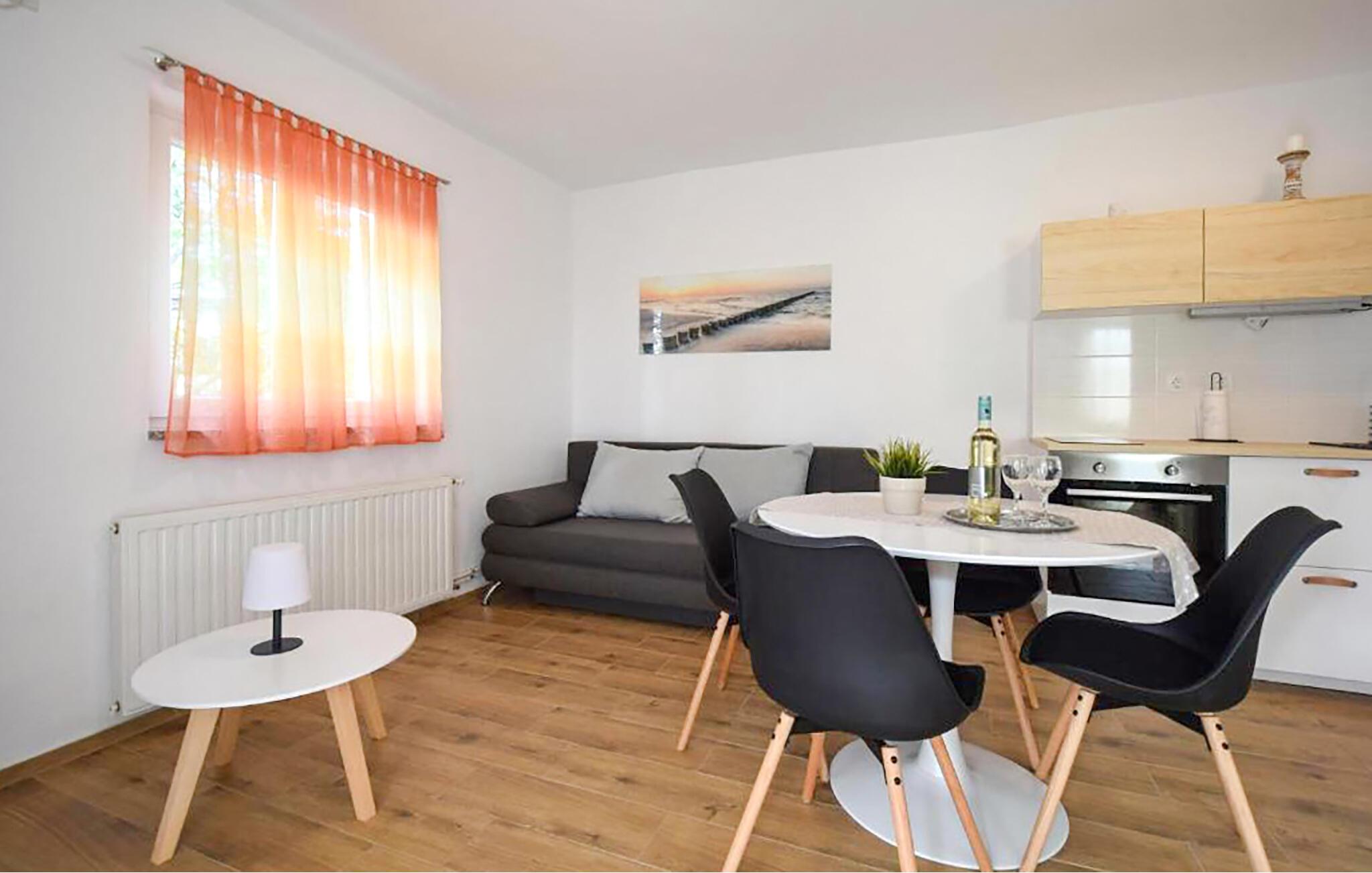 Denne lyse og moderne ferielejlighed har et smagfuldt indrettet interiør. Brug det åbne køkken til at tilberede dagens måltider og tag plads ved det stilfulde spisebord. Slap af om aftenen med en film i den komfortable sofa eller med et brætspil.