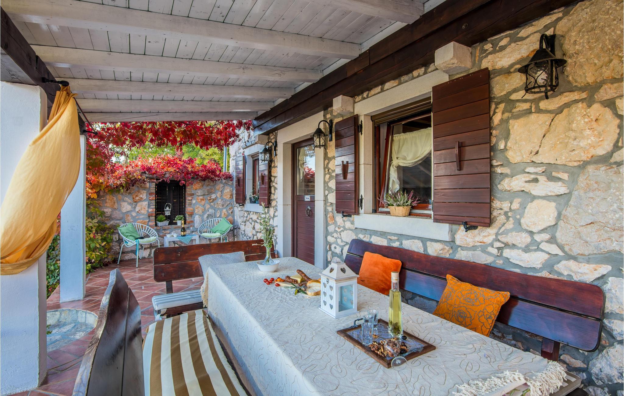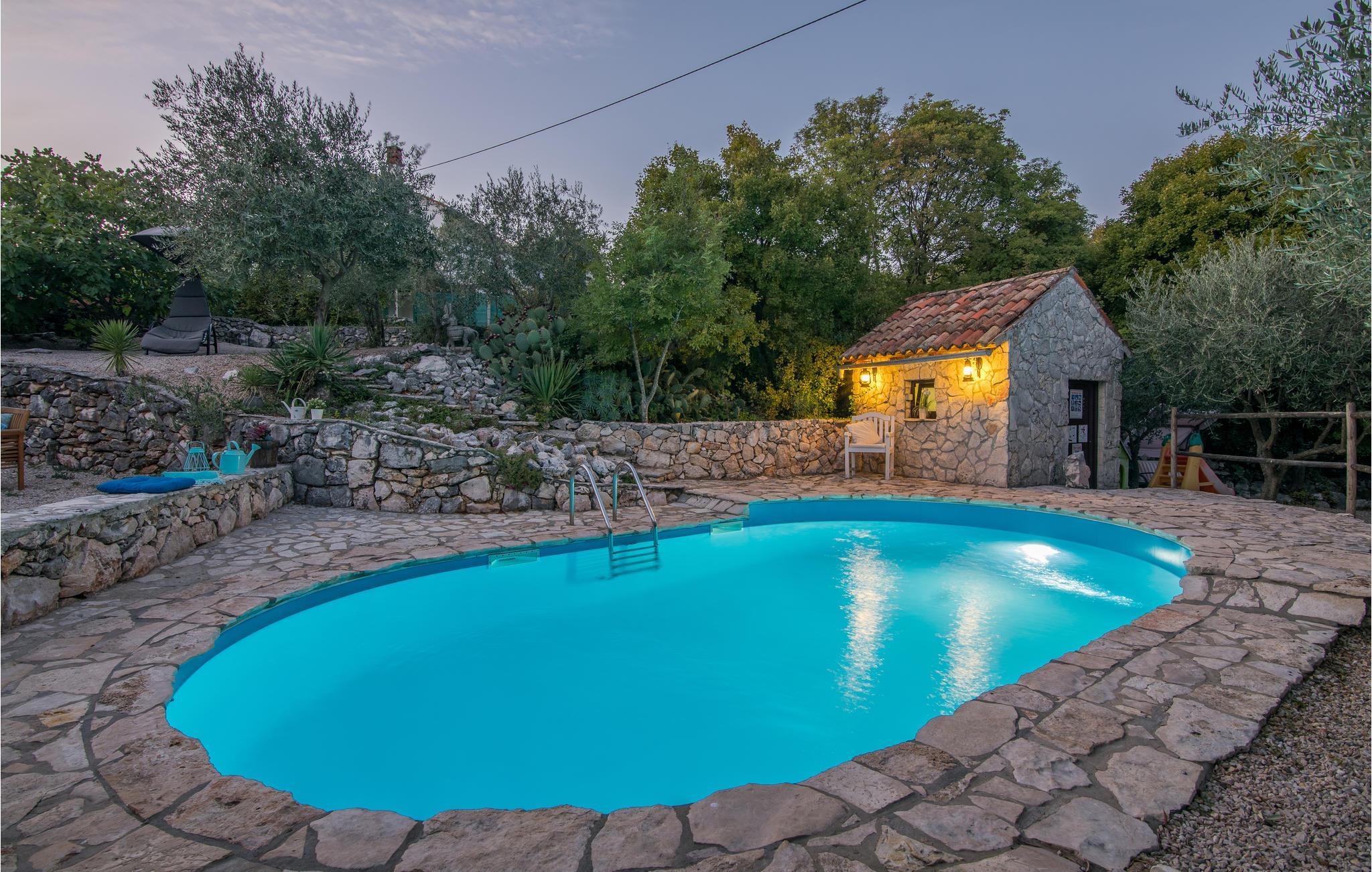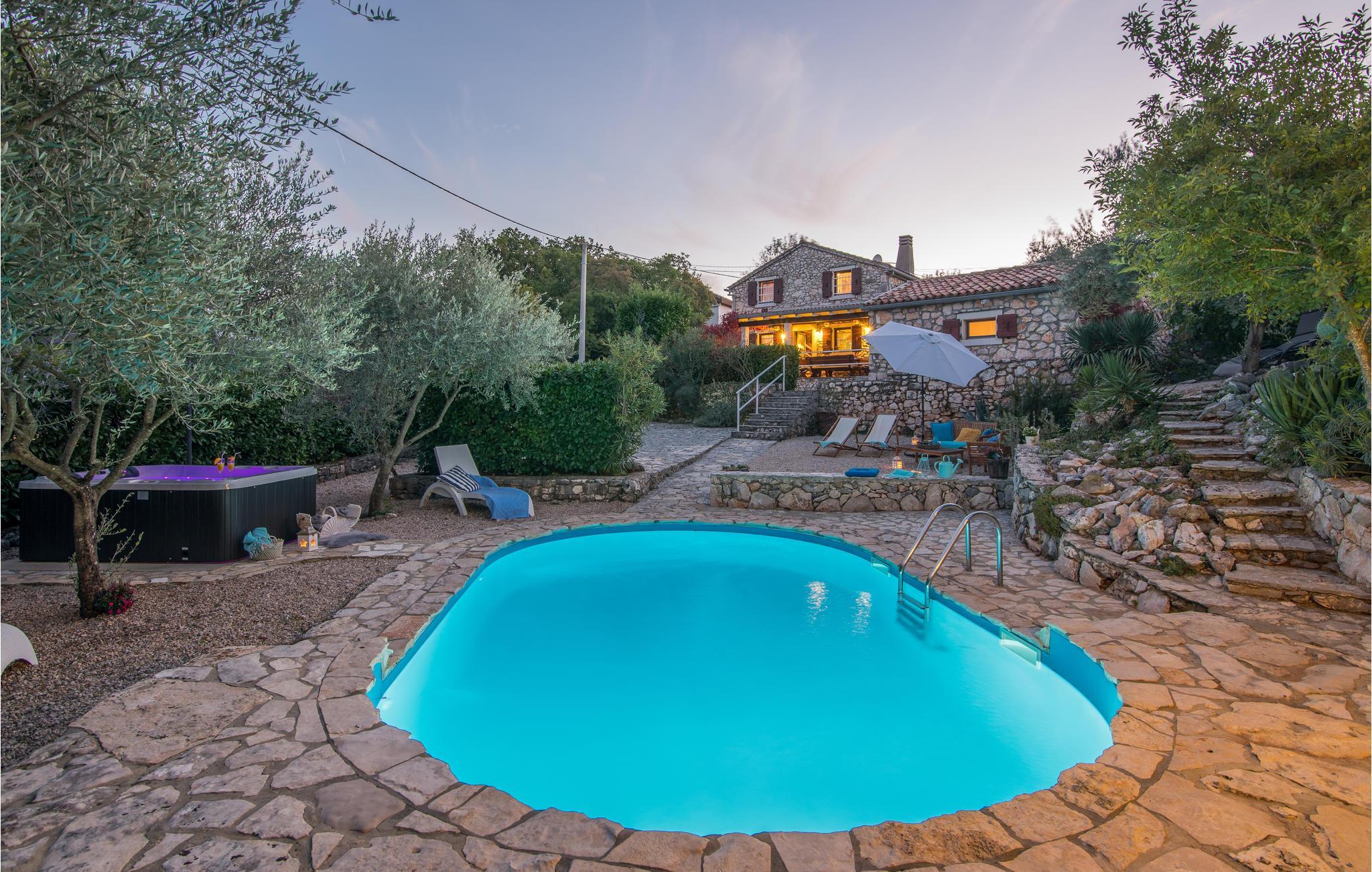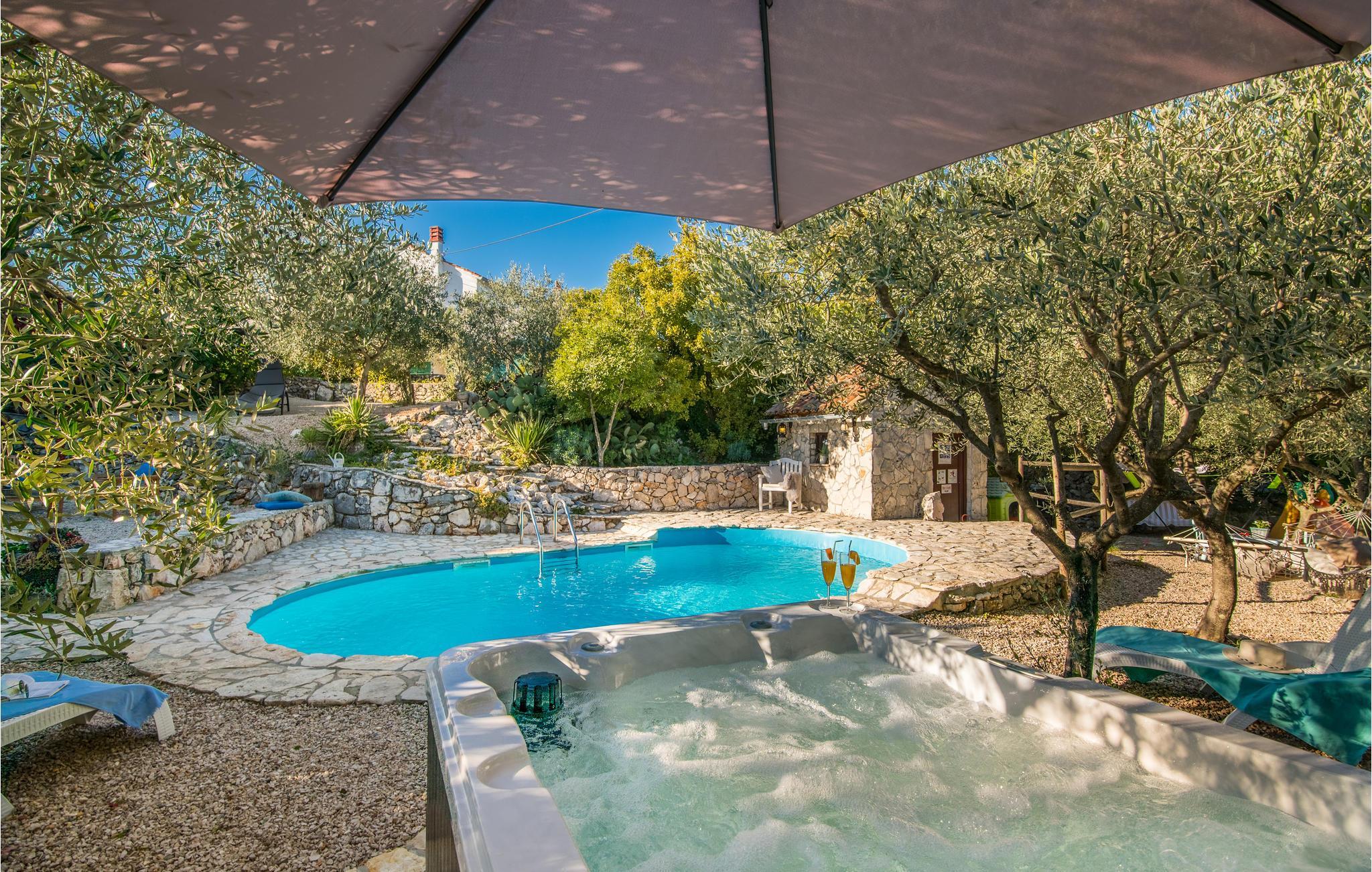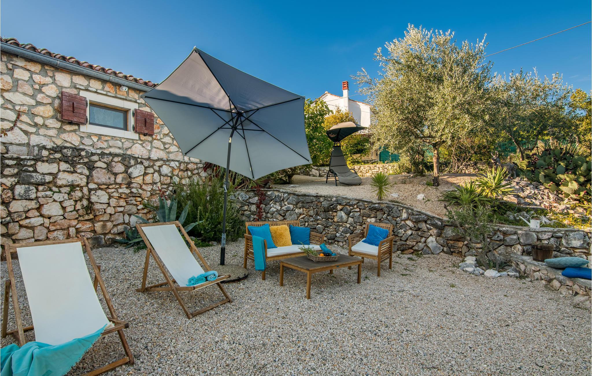 Dette flotte og traditionelt indrettede feriehus ligger midt på øen Krk. På den overdækkede terrasse er der hyggelige træmøbler, her kan I se børnene lege og nyde husets rolige omgivelser. Slap af med jeres familie ved siden af den dejlige pool. I et lille hus ved siden af er der et soveværelse med plads til to personer og et badeværelse. Grunden er indhegnet. Med bilen kommer I hurtigt til strandene i nærheden, mudderbadene i Kimno, gemte bugter, byerne Silo, Vrbnik og Malinska samt byen Krk med sit livlige natteliv i højsæsonen. Besøg de mange strande, øen tilbyder.