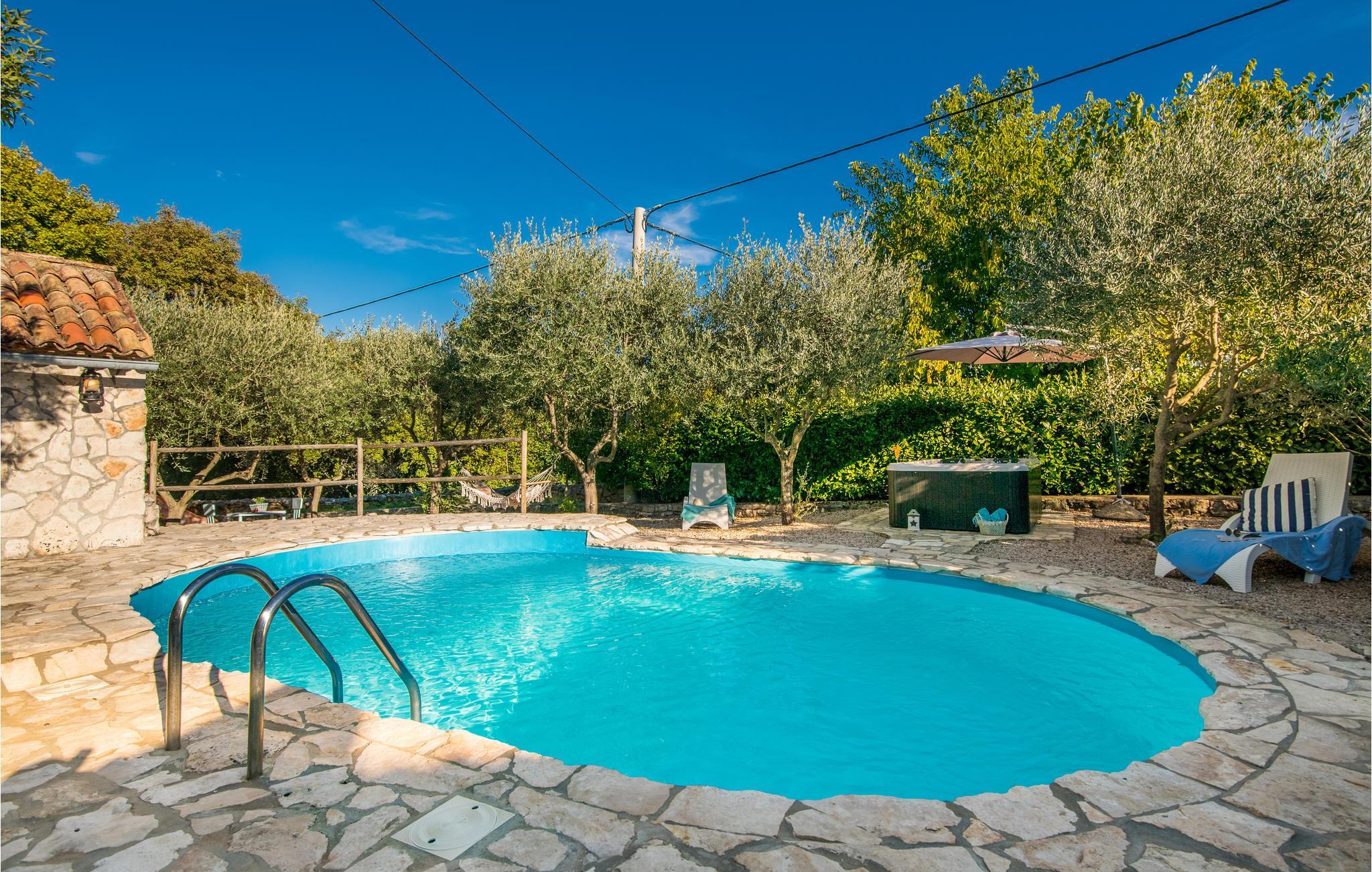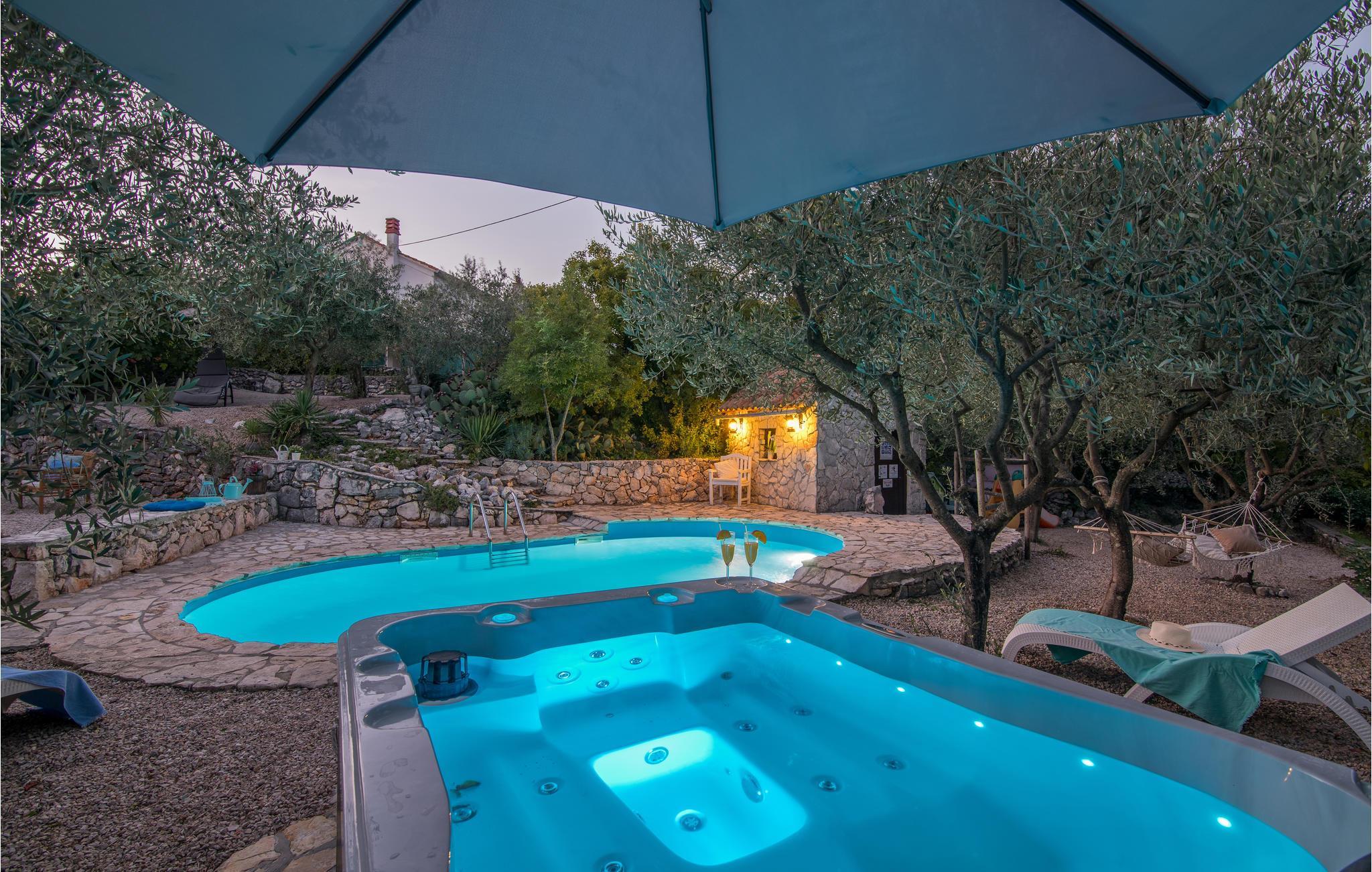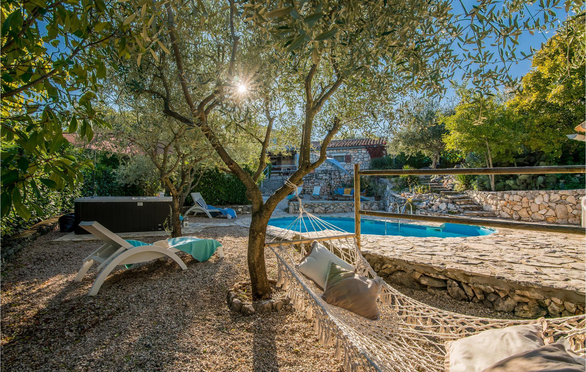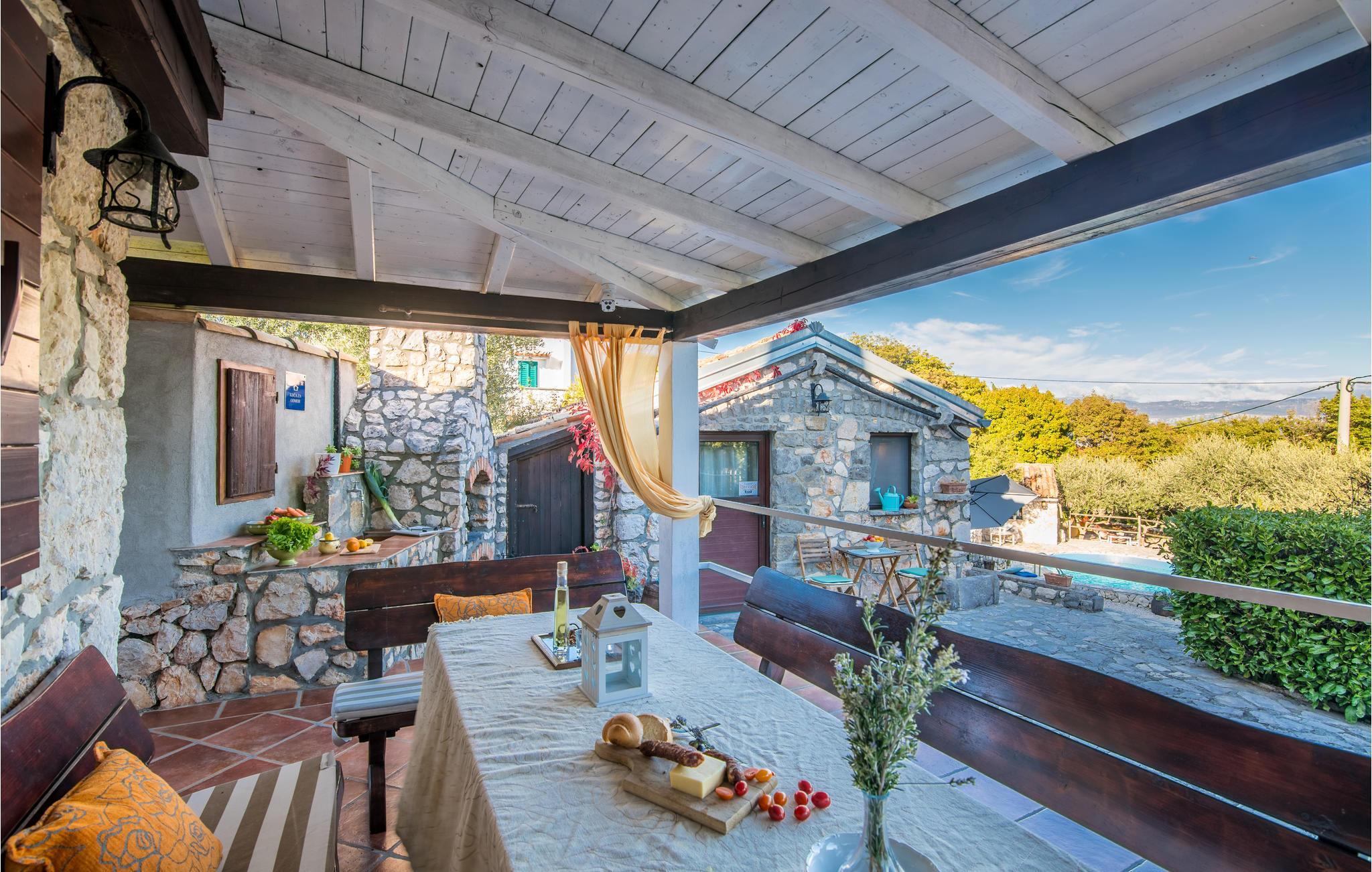 Dette flotte og traditionelt indrettede feriehus ligger midt på øen Krk. På den overdækkede terrasse er der hyggelige træmøbler, her kan I se børnene lege og nyde husets rolige omgivelser. Slap af med jeres familie ved siden af den dejlige pool. I et lille hus ved siden af er der et soveværelse med plads til to personer og et badeværelse. Grunden er indhegnet. Med bilen kommer I hurtigt til strandene i nærheden, mudderbadene i Kimno, gemte bugter, byerne Silo, Vrbnik og Malinska samt byen Krk med sit livlige natteliv i højsæsonen. Besøg de mange strande, øen tilbyder.