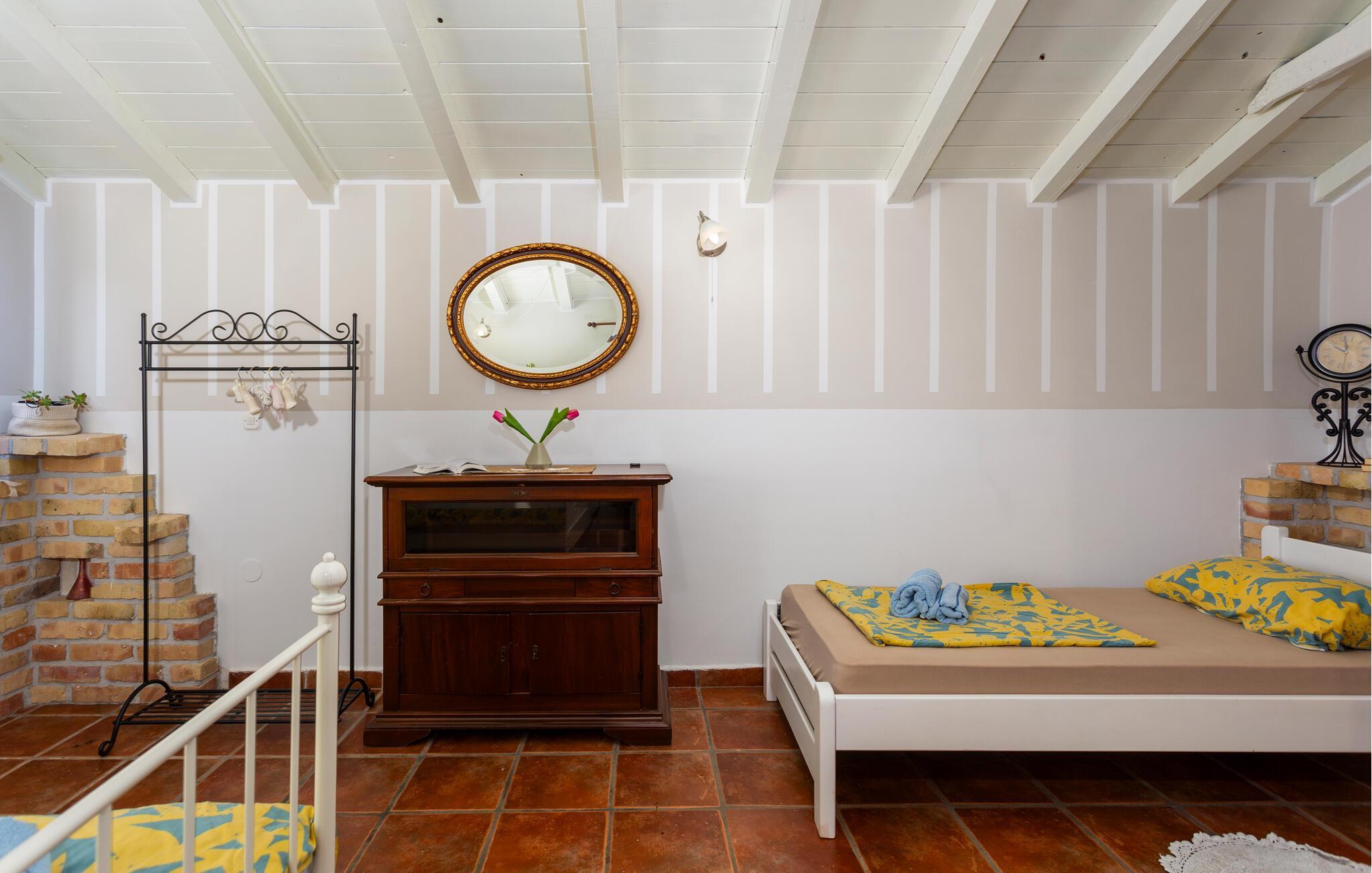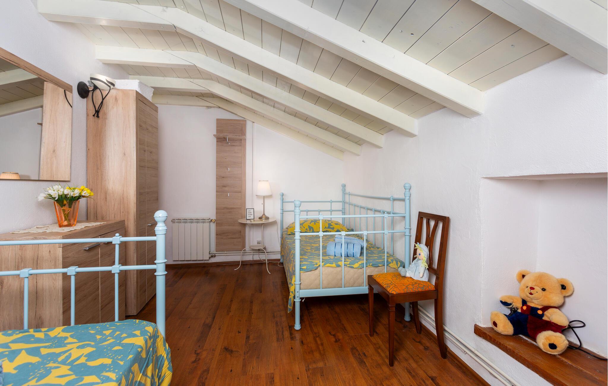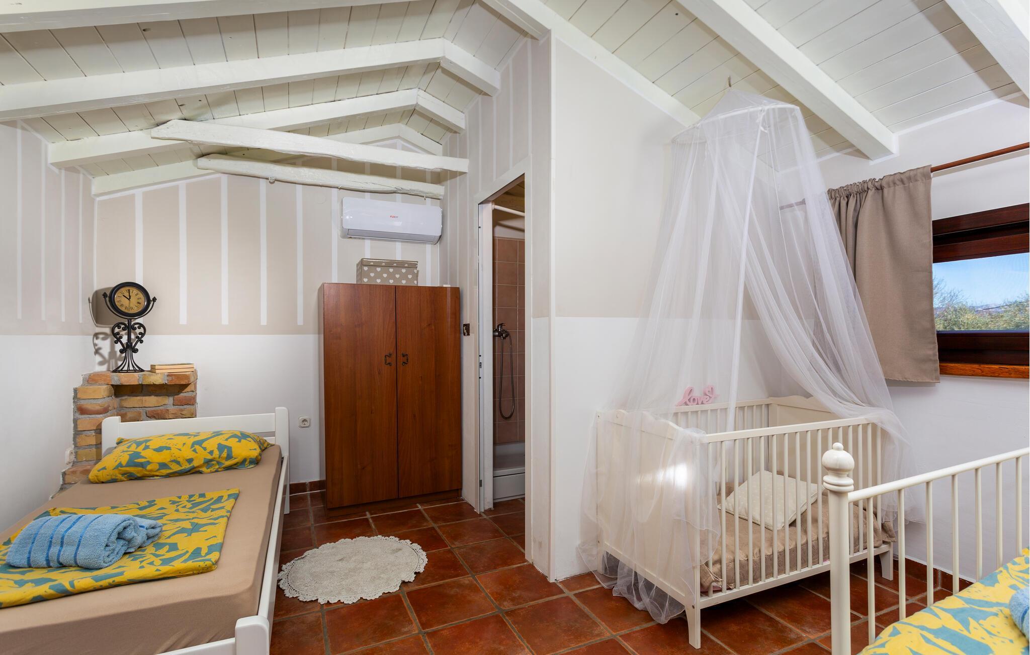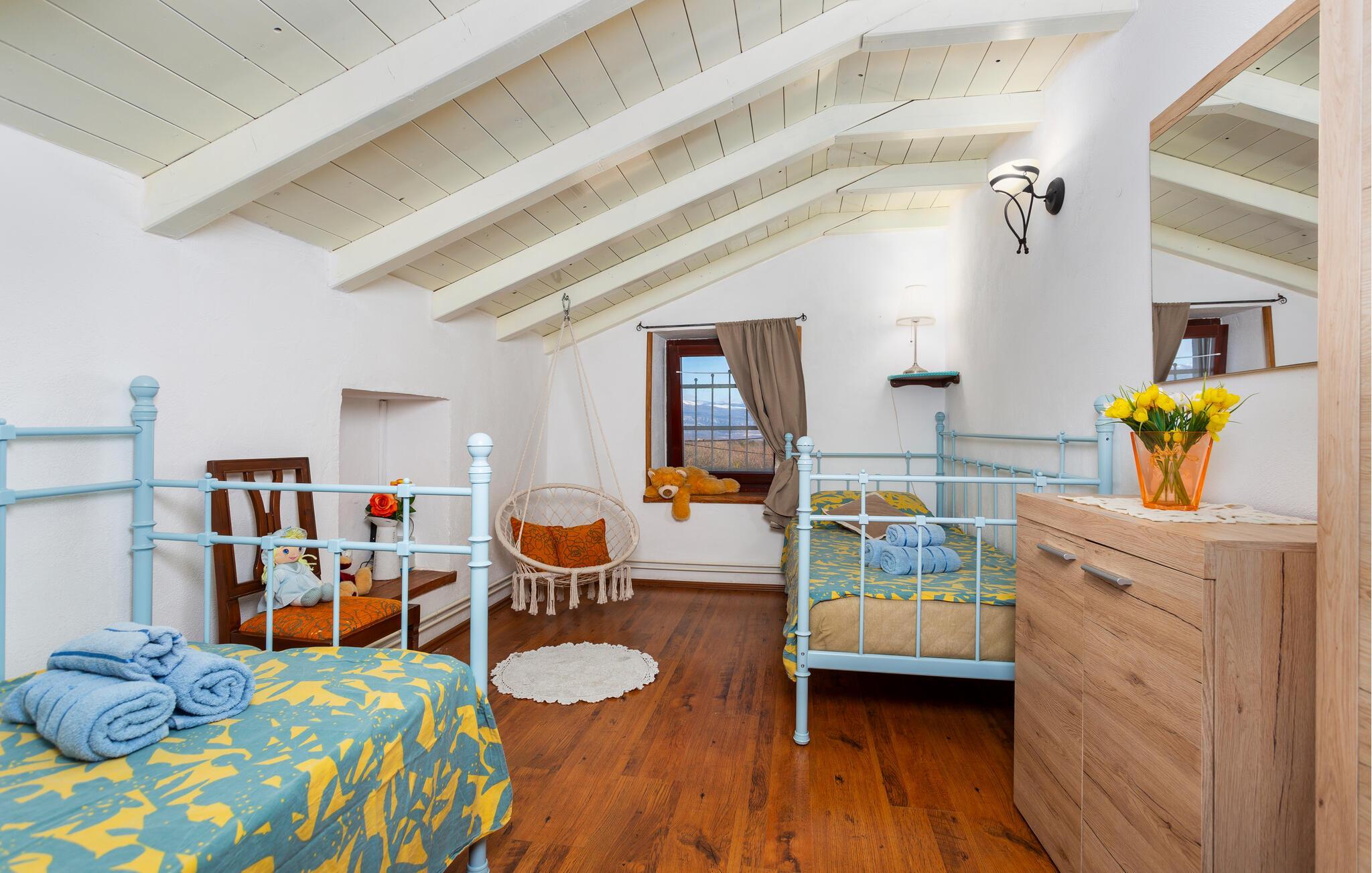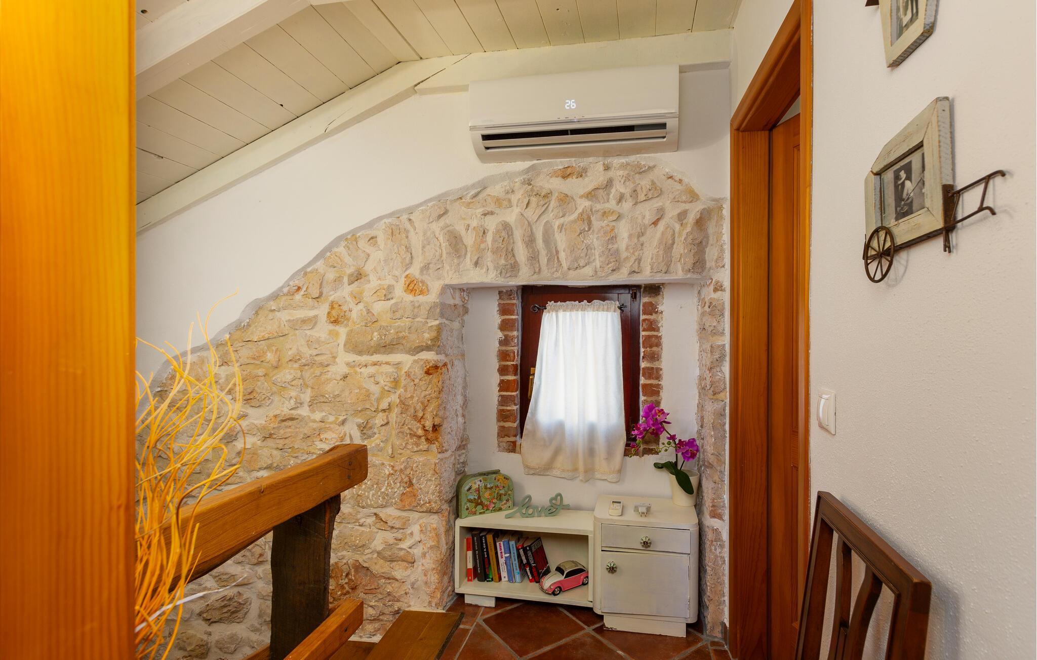 Dette flotte og traditionelt indrettede feriehus ligger midt på øen Krk. På den overdækkede terrasse er der hyggelige træmøbler, her kan I se børnene lege og nyde husets rolige omgivelser. Slap af med jeres familie ved siden af den dejlige pool. I et lille hus ved siden af er der et soveværelse med plads til to personer og et badeværelse. Grunden er indhegnet. Med bilen kommer I hurtigt til strandene i nærheden, mudderbadene i Kimno, gemte bugter, byerne Silo, Vrbnik og Malinska samt byen Krk med sit livlige natteliv i højsæsonen. Besøg de mange strande, øen tilbyder.