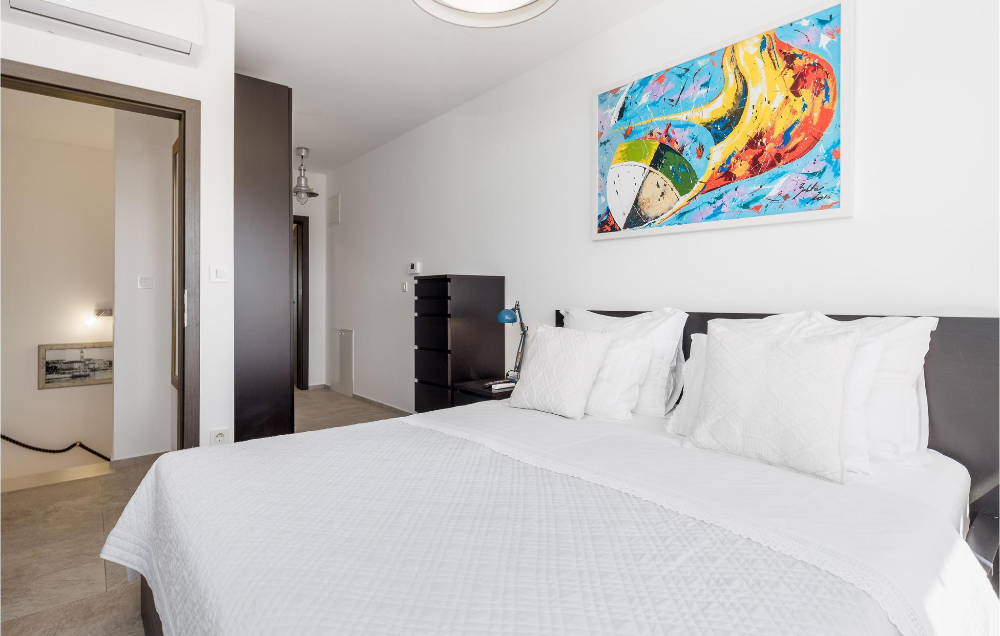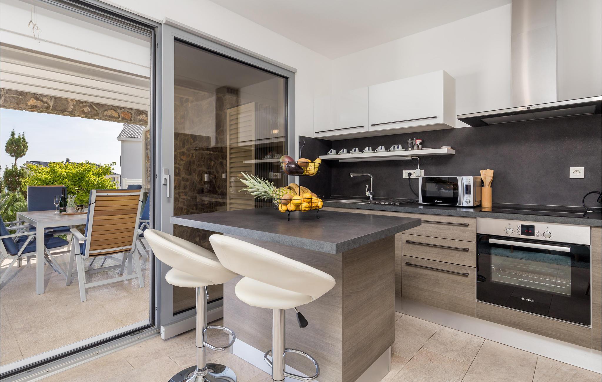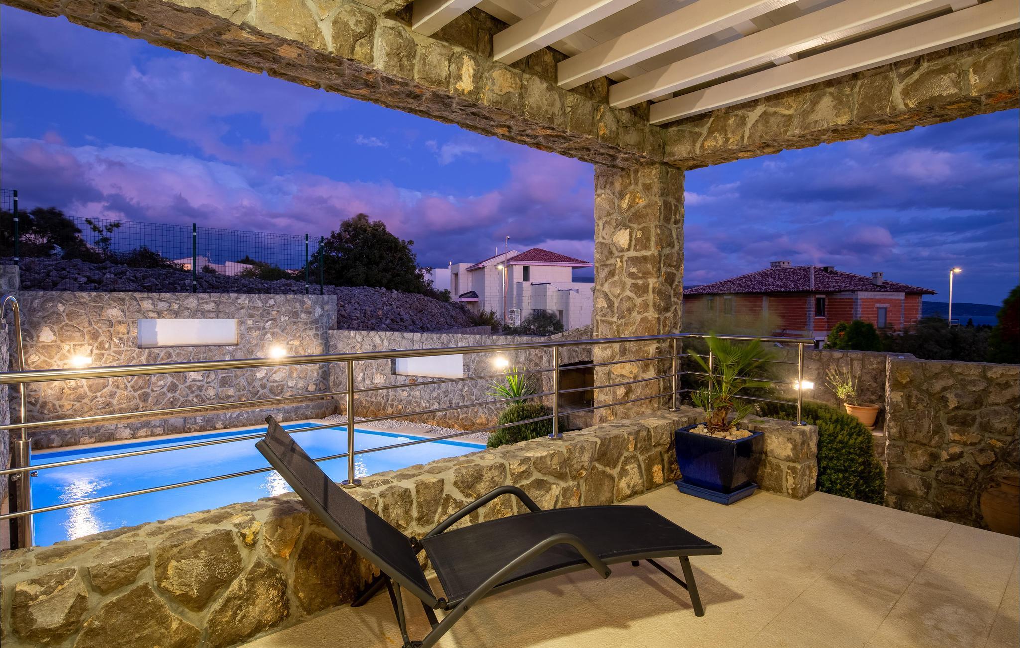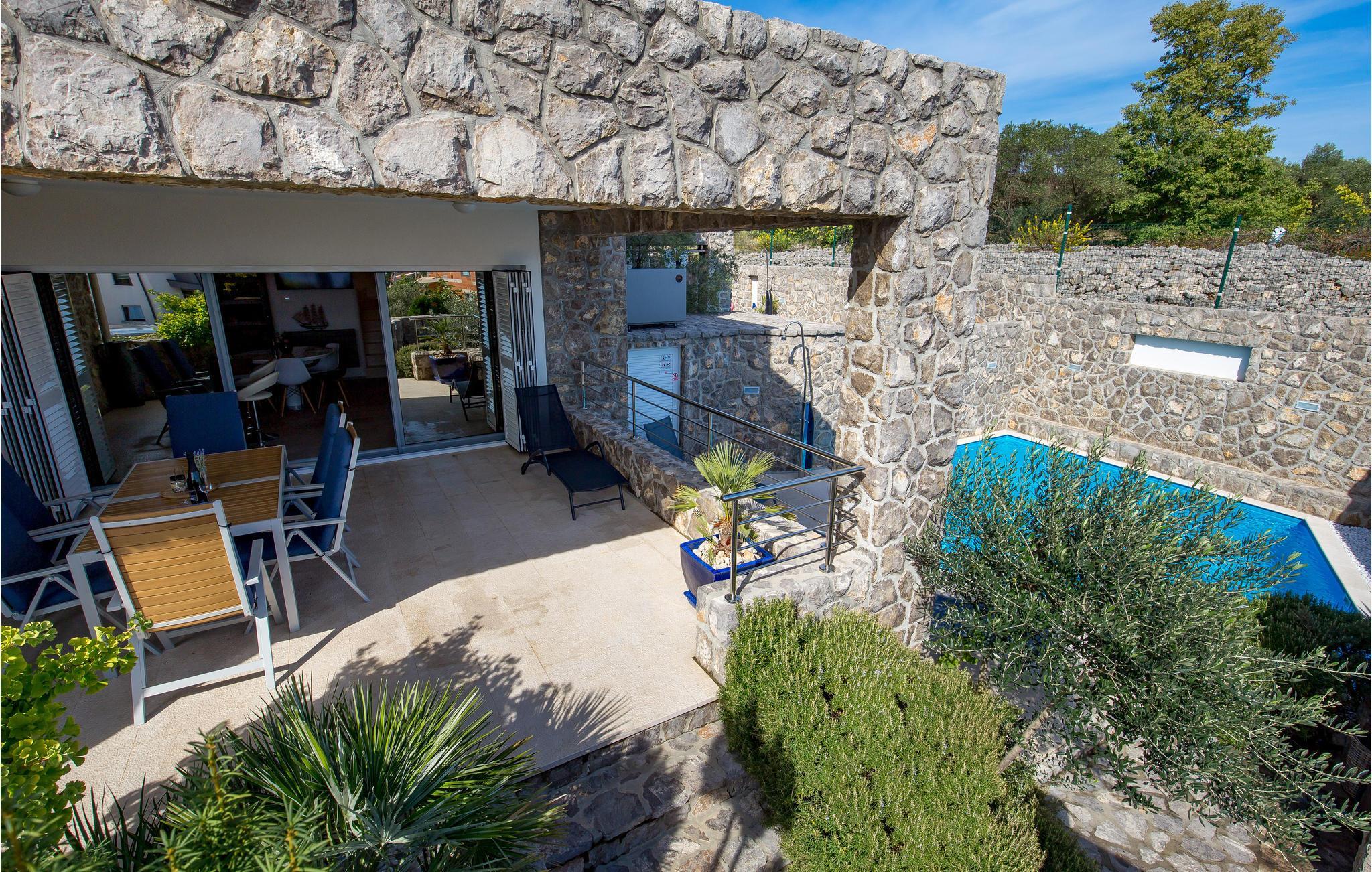 Dette skønne feriehus ligger i feriebyen Krk, på øen af samme navn, der er en del af Kvarner-øgruppen. Huset ligger ovenfor den historiske by Krk, med en skøn udsigt over havet. Husets indre er meget moderne, indrettet med interessante billeder og små fine detaljer. Lige foran stuen er der en overdækket terrasse med en pool der kan opvarmes efter ønske, en plæne til solbad og en grill. I huset er der klimaanlæg og gulvvarme og det rummer i stueplan et stort soveværelse, hyggelig stue med køkken og et badeværelse, mens der er to yderligere soveværelse med badeværelser en suite på første sal. Den interessante ø Krk er fuld af kulturhistorie som I kan se eksempler på overalt. Nyd badelivet på de skønne strande, besøg det berømte Vrbnik med talrige vingodser og den skønne ø Košljun og forkæl jer selv med det fremragende mediterrane køkken og de førsteklasses lokale vine.