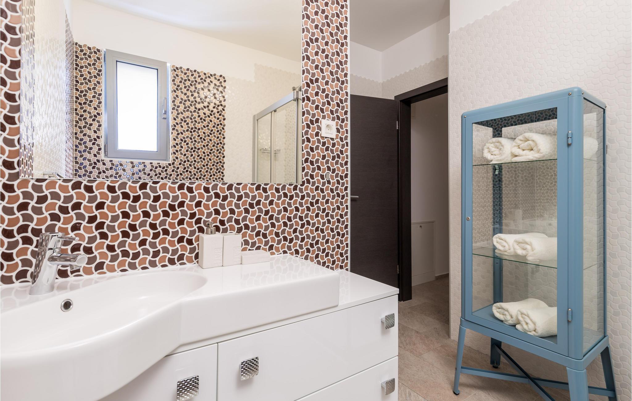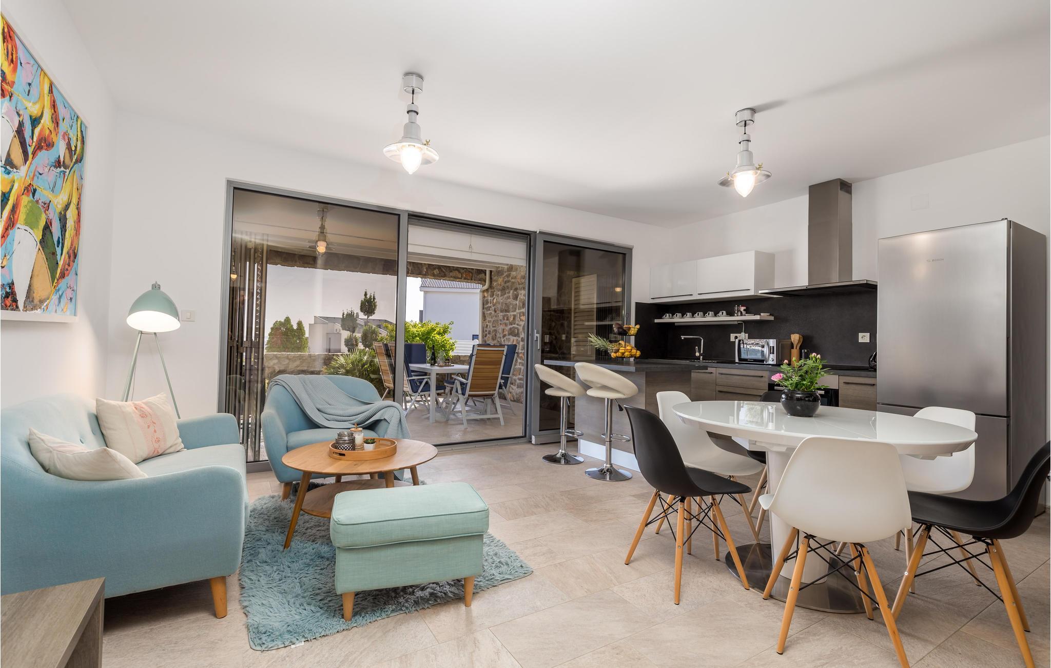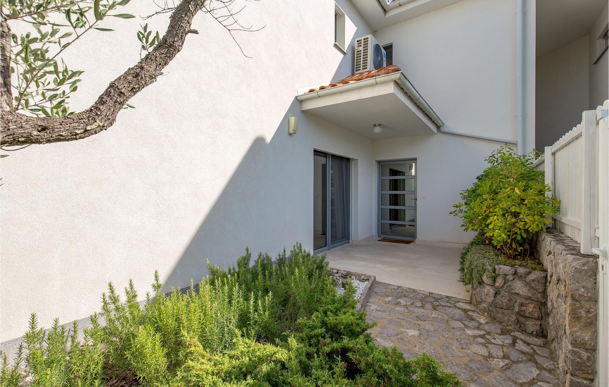 Dette skønne feriehus ligger i feriebyen Krk, på øen af samme navn, der er en del af Kvarner-øgruppen. Huset ligger ovenfor den historiske by Krk, med en skøn udsigt over havet. Husets indre er meget moderne, indrettet med interessante billeder og små fine detaljer. Lige foran stuen er der en overdækket terrasse med en pool der kan opvarmes efter ønske, en plæne til solbad og en grill. I huset er der klimaanlæg og gulvvarme og det rummer i stueplan et stort soveværelse, hyggelig stue med køkken og et badeværelse, mens der er to yderligere soveværelse med badeværelser en suite på første sal. Den interessante ø Krk er fuld af kulturhistorie som I kan se eksempler på overalt. Nyd badelivet på de skønne strande, besøg det berømte Vrbnik med talrige vingodser og den skønne ø Košljun og forkæl jer selv med det fremragende mediterrane køkken og de førsteklasses lokale vine.