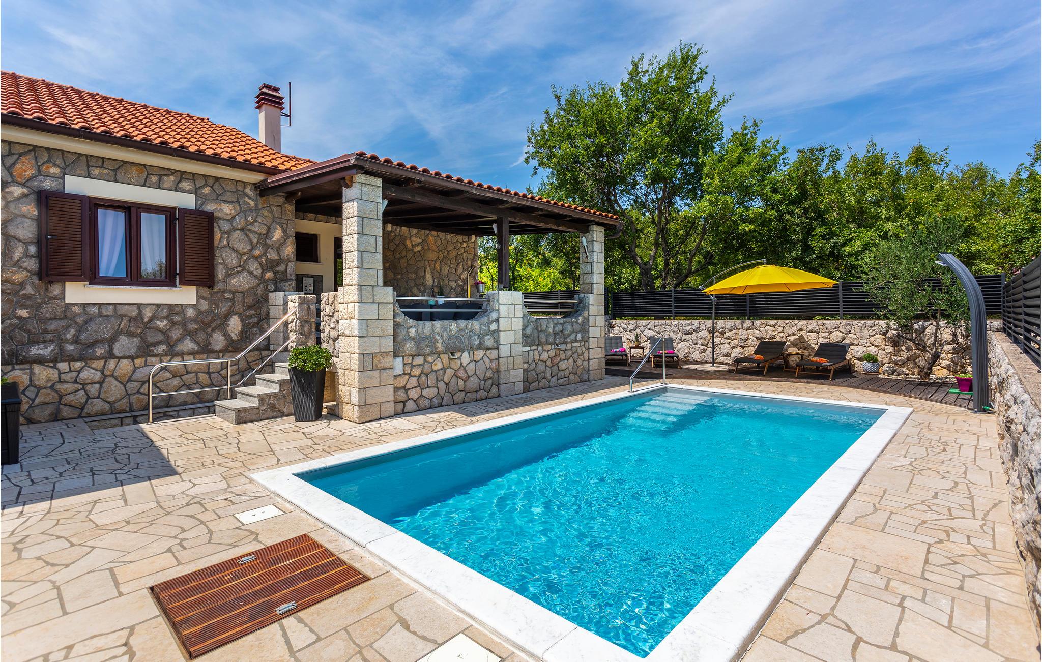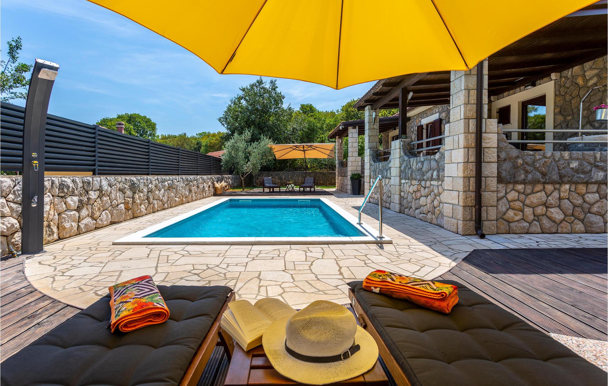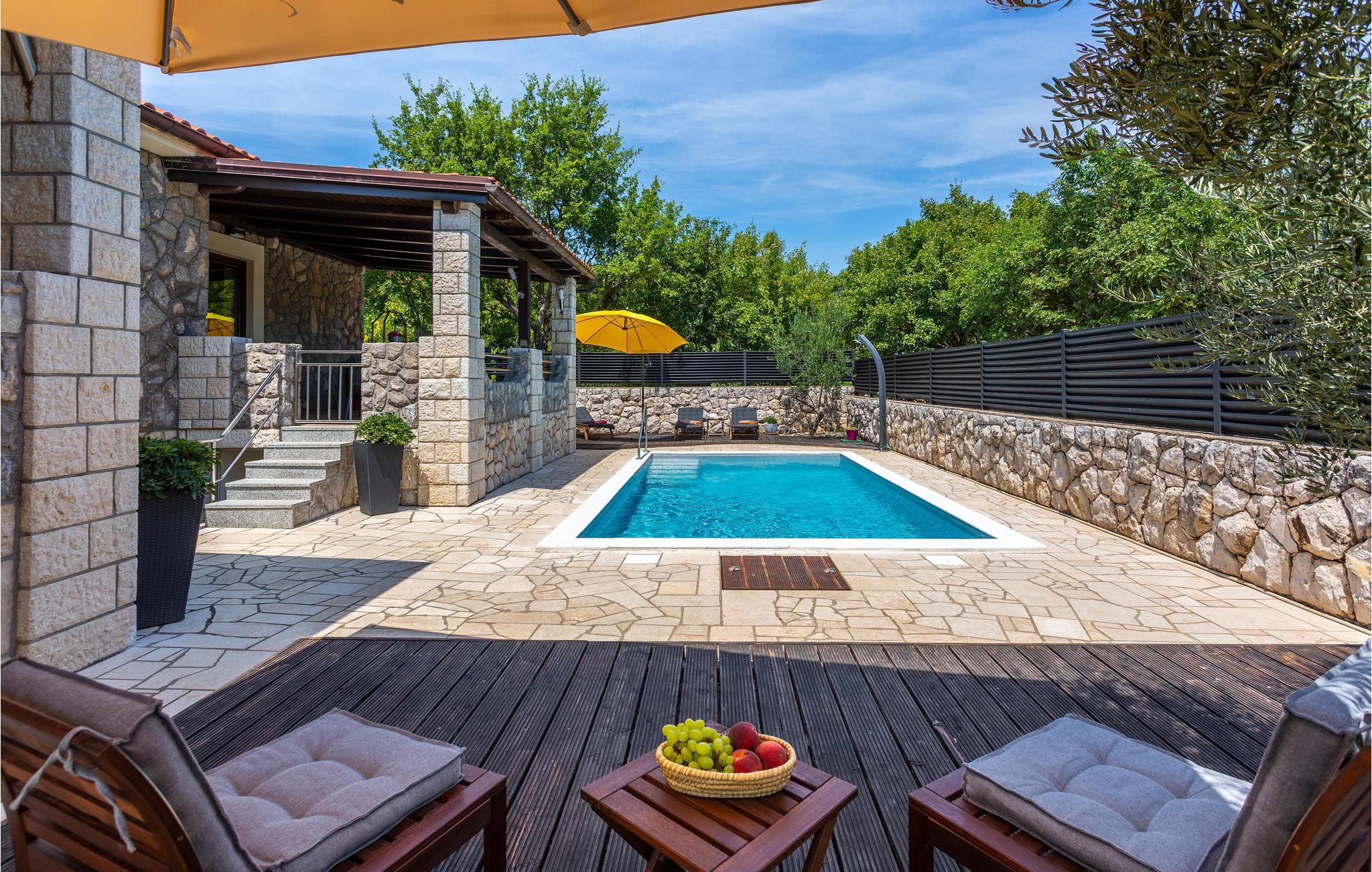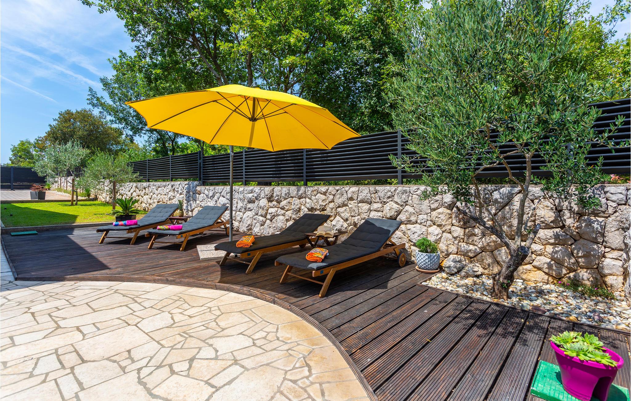 Der er en swimmingpool med liggestole i den indhegnede grønne have, hvor I helt sikkert vil bruge det meste af jeres tid. Afhængigt af solen kan I vælge mellem forskellige terrasser. Grillmesteren kan vise sine evner på en murstengrill.
