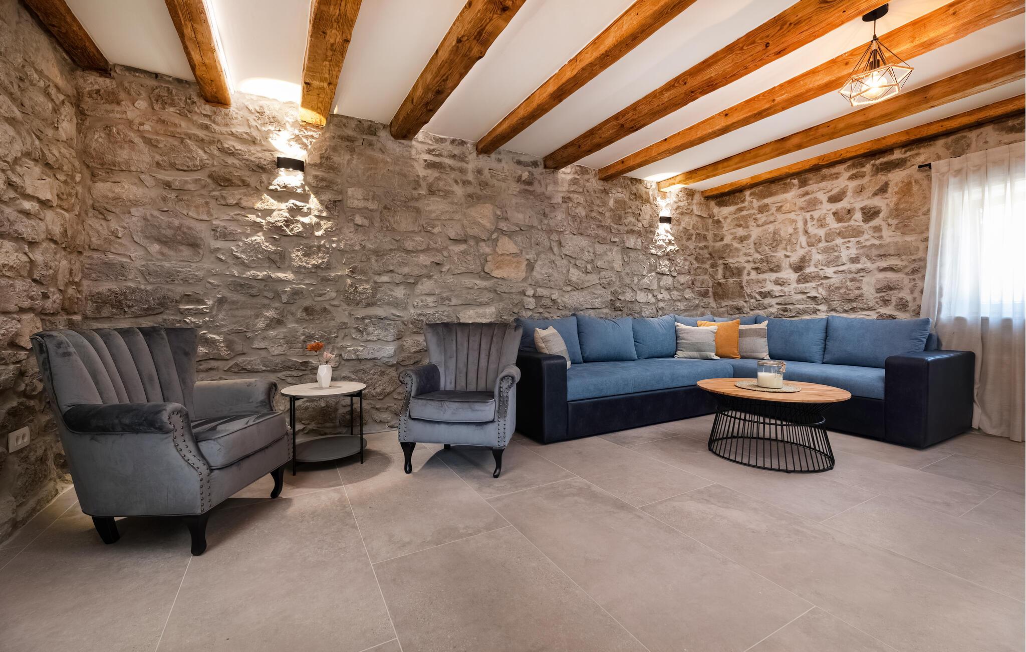 Huset ligger i smukke, rolige omgivelser i landsbyen Lakmartin tæt på strandene og hovedbyen på øen. Med sine mange kvadratmeter og flotte indretning over tre etager er det den ideelle feriebolig for jer, der gerne vil rejse med den store familie eller måske en vennefamilie. Interiøret byder på et vellykket mix af rustikke stenvægge, stærke farver og moderne faciliteter, der gør jeres feriehverdag til en leg. Lad blot amatørkokkene trylle i det veludstyrede køkken, mens andre dækker op til den store middag ved spisebordet.