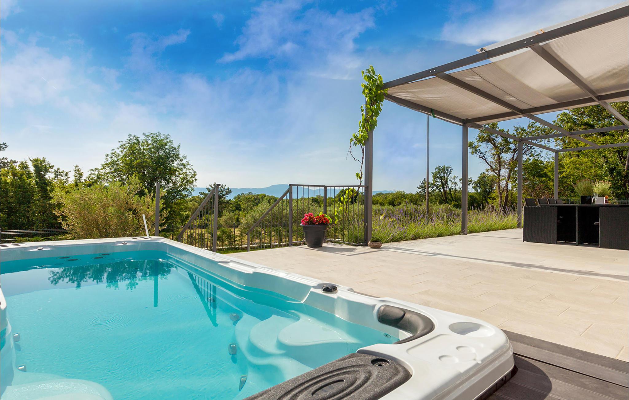 Den delvist overdækkede terrasse giver jer ikke kun et fantastisk sted at slappe af i solen, men også en vidunderlig udsigt til havet. Nedenunder kan I benytte jer af soldækket og den opvarmede fællespool med modstrømssystem og integreret spabad til jeres wellness-stunder. Fælleshaven har skønne forhold til de milde sommeraftener med grillhygge.