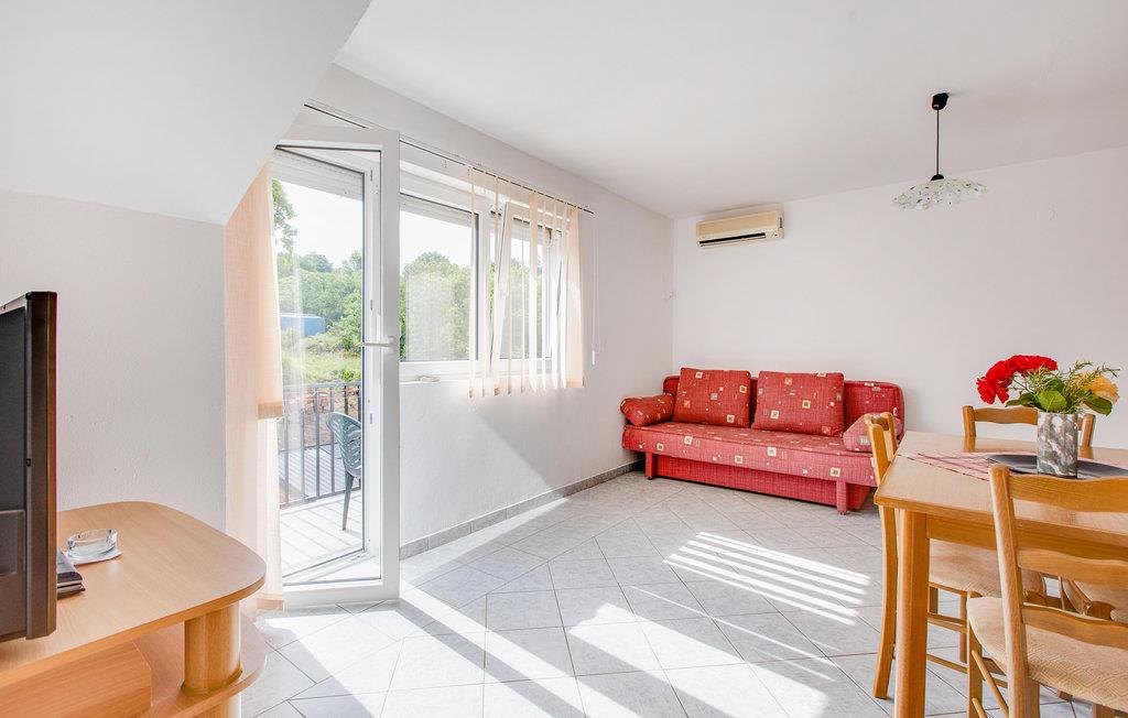Denne lille, funktionelt indrettede lejlighed venter sine gæster på 2. sal i et hus og tilbyder delvis havudsigt. Det giver plads til 4 personer, der er en dobbeltseng i soveværelset, yderligere 2 senge kan findes i stuen. Et kæledyr er velkomne. Aircondition sikrer behagelige temperaturer på varme sommerdage.