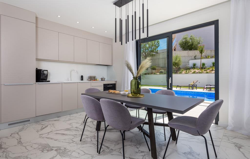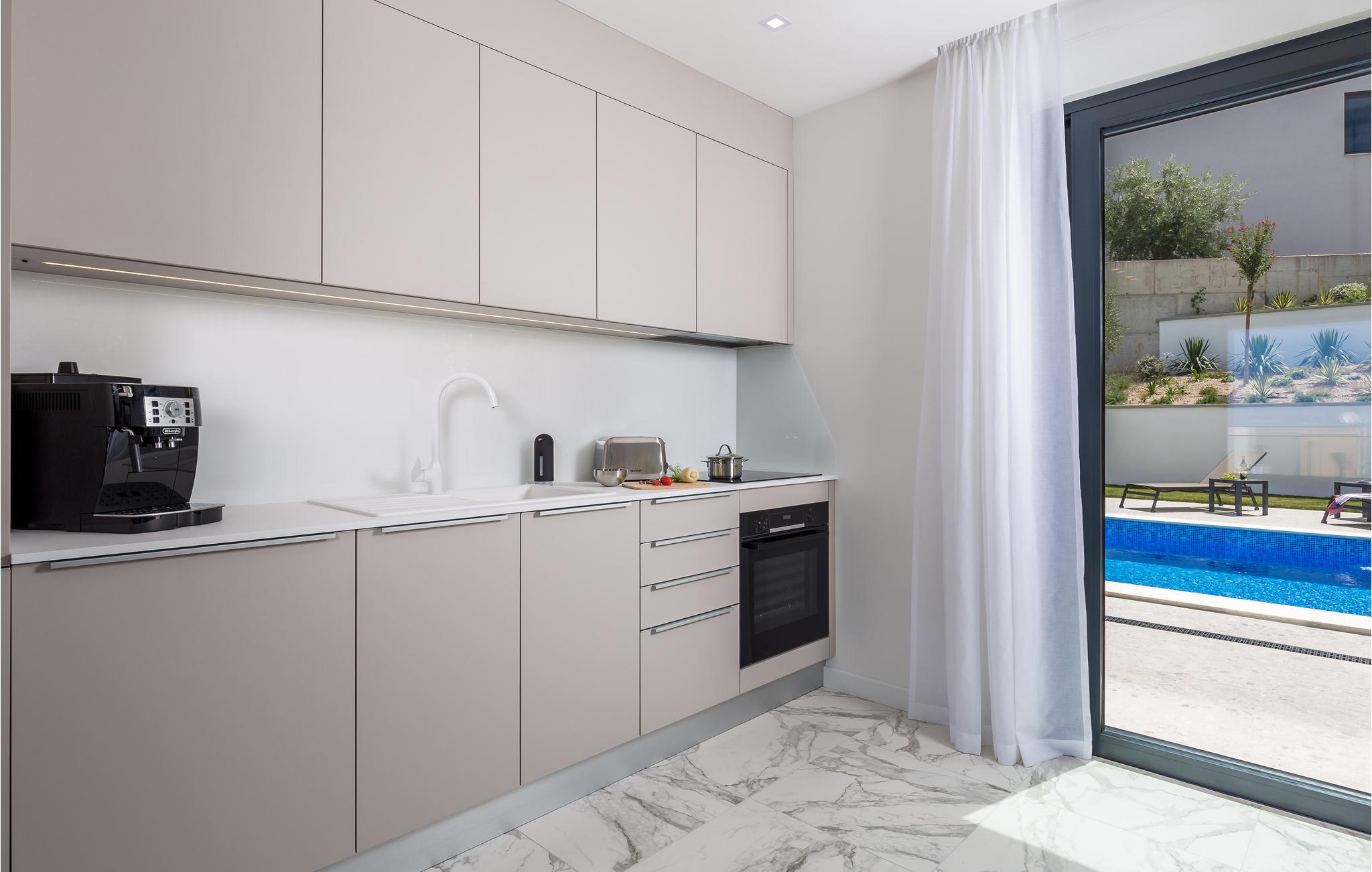 Det store, lyse køkken giver jer plads til at tilberede lækre måltider sammen. Om morgenen kan I lave en lækker kop kaffe her og nyde den på den rummelige balkon med havudsigt. Planlæg dagens aktiviteter og udflugter for den kommende ferie. Nyd morgenmaden, som består af lokal frugt og grøntsager på balkonen. Alternativt kan I nyde det private haveområde med en stor pool. Her kan jeres børn have det sjovt hele dagen, eller I kan svømme i fred tidligt om morgenen, mens de andre stadig sover. I stuen kan I slappe af om aftenen i den store sofa og se en film sammen.