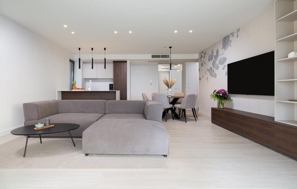 Velkommen til den indbydende lejlighed, hvor der venter jer en særdeles komfortabel indretning. De lyse lokaler og elegante møbler gør lejligheden til en oplagt destination for gæster, der værdsætter kvalitet og komfort på ferien. Her kan I nyde jeres måltider med en smuk udsigt over det fri gennem gulv-til-loft- vinduerne og se frem til mange hyggelige aftener i en stilfuld og behagelig atmosfære.
