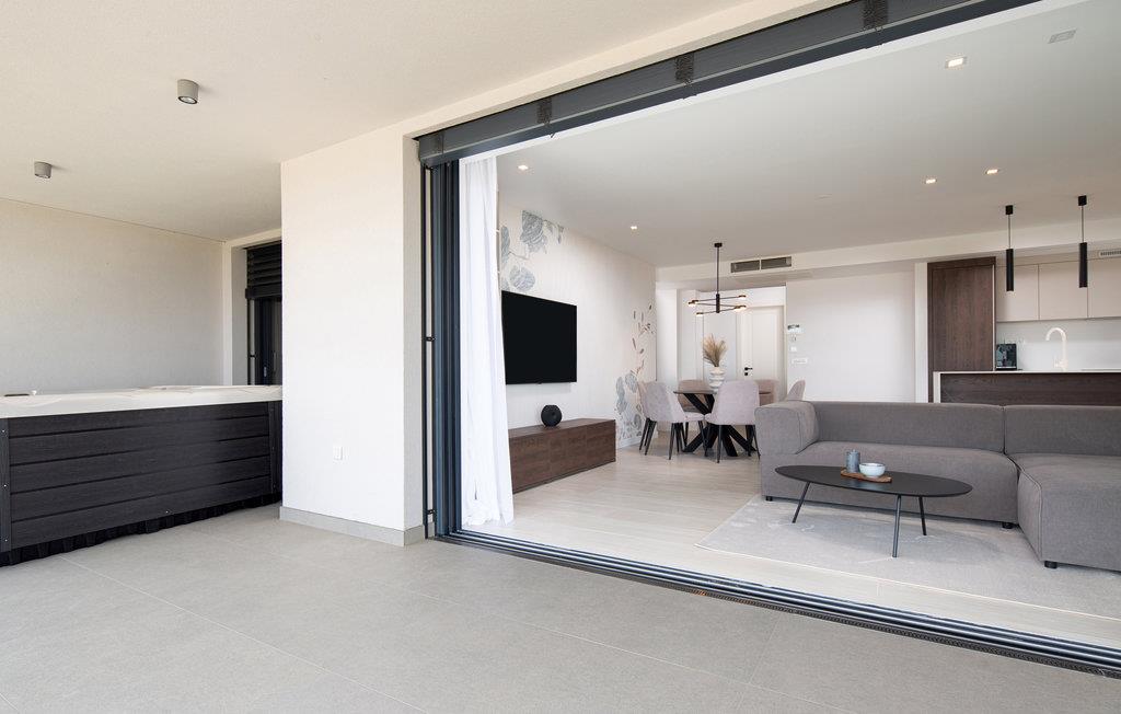 Velkommen til den indbydende lejlighed, hvor der venter jer en særdeles komfortabel indretning. De lyse lokaler og elegante møbler gør lejligheden til en oplagt destination for gæster, der værdsætter kvalitet og komfort på ferien. Her kan I nyde jeres måltider med en smuk udsigt over det fri gennem gulv-til-loft- vinduerne og se frem til mange hyggelige aftener i en stilfuld og behagelig atmosfære.