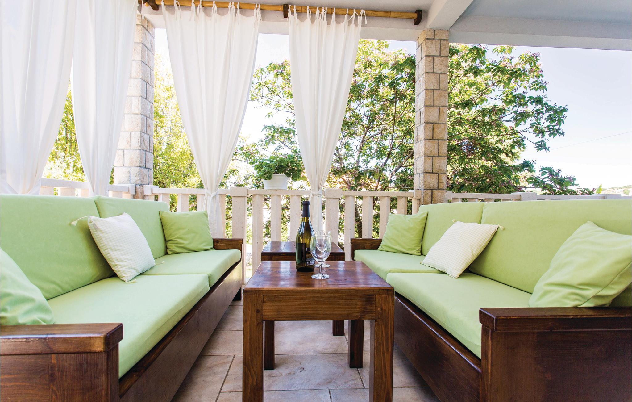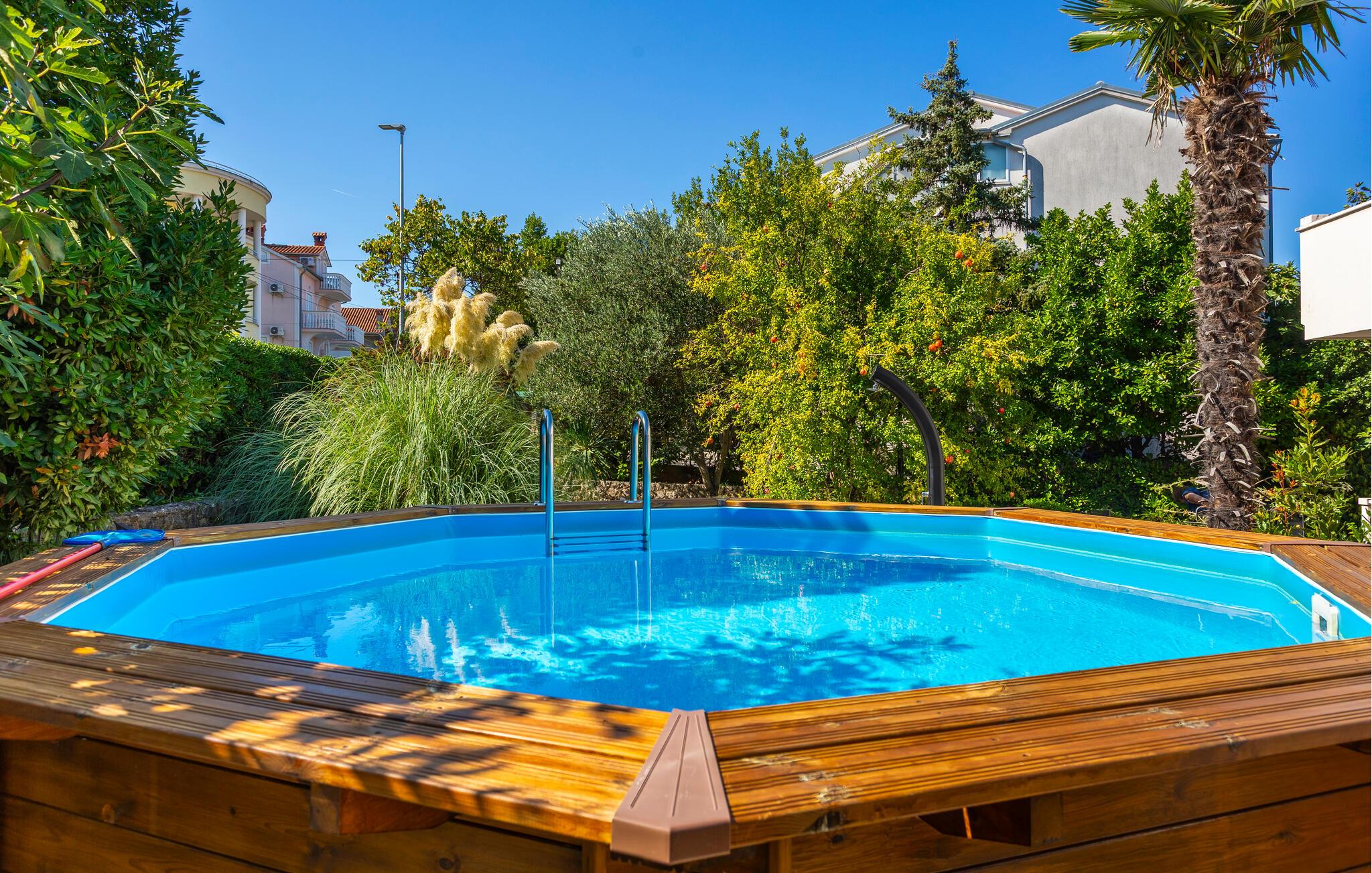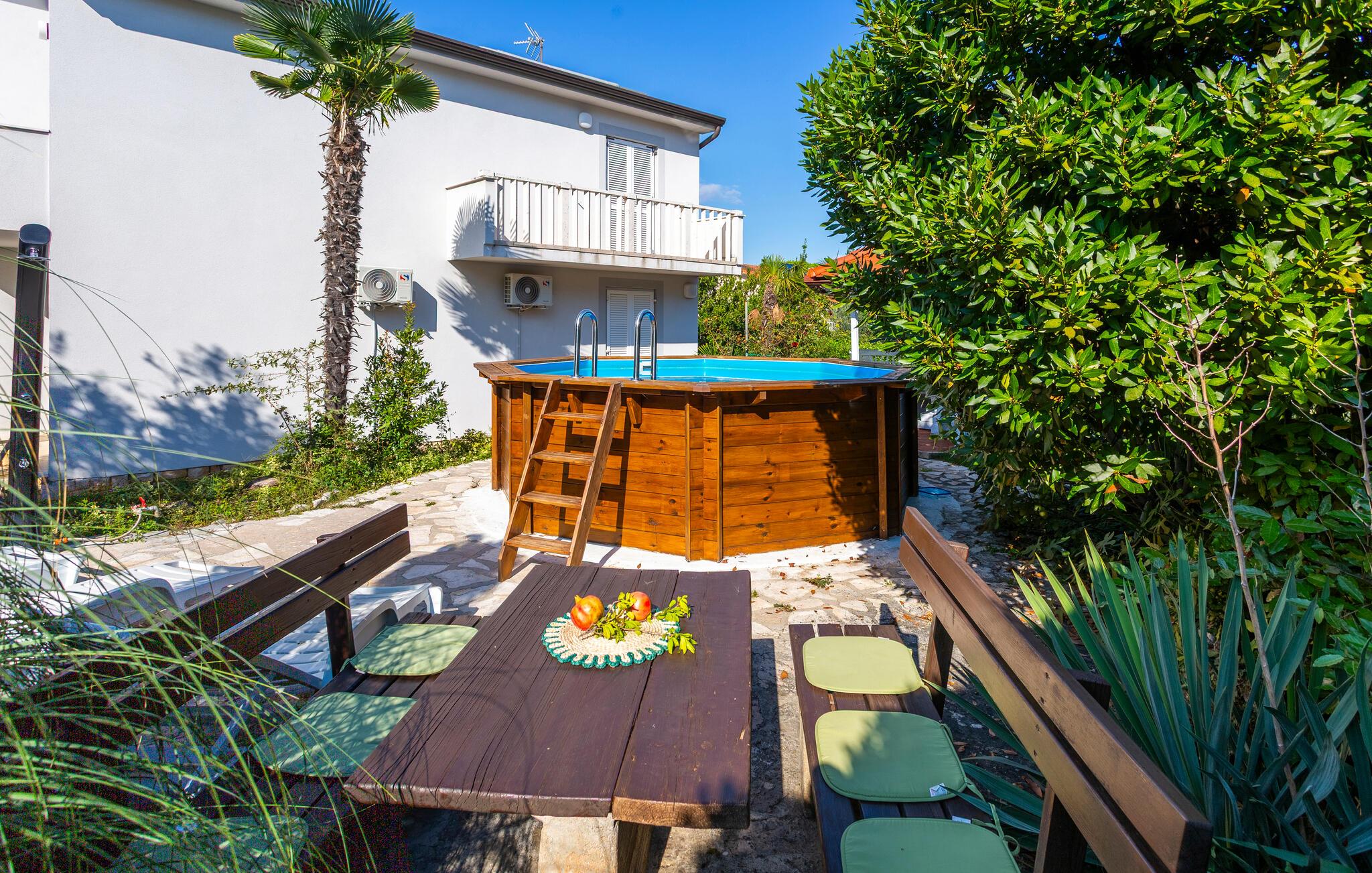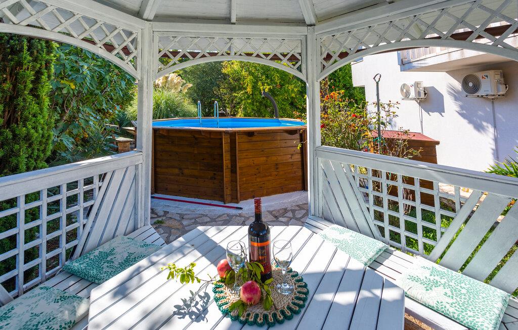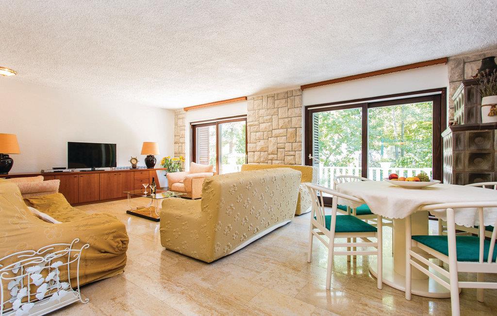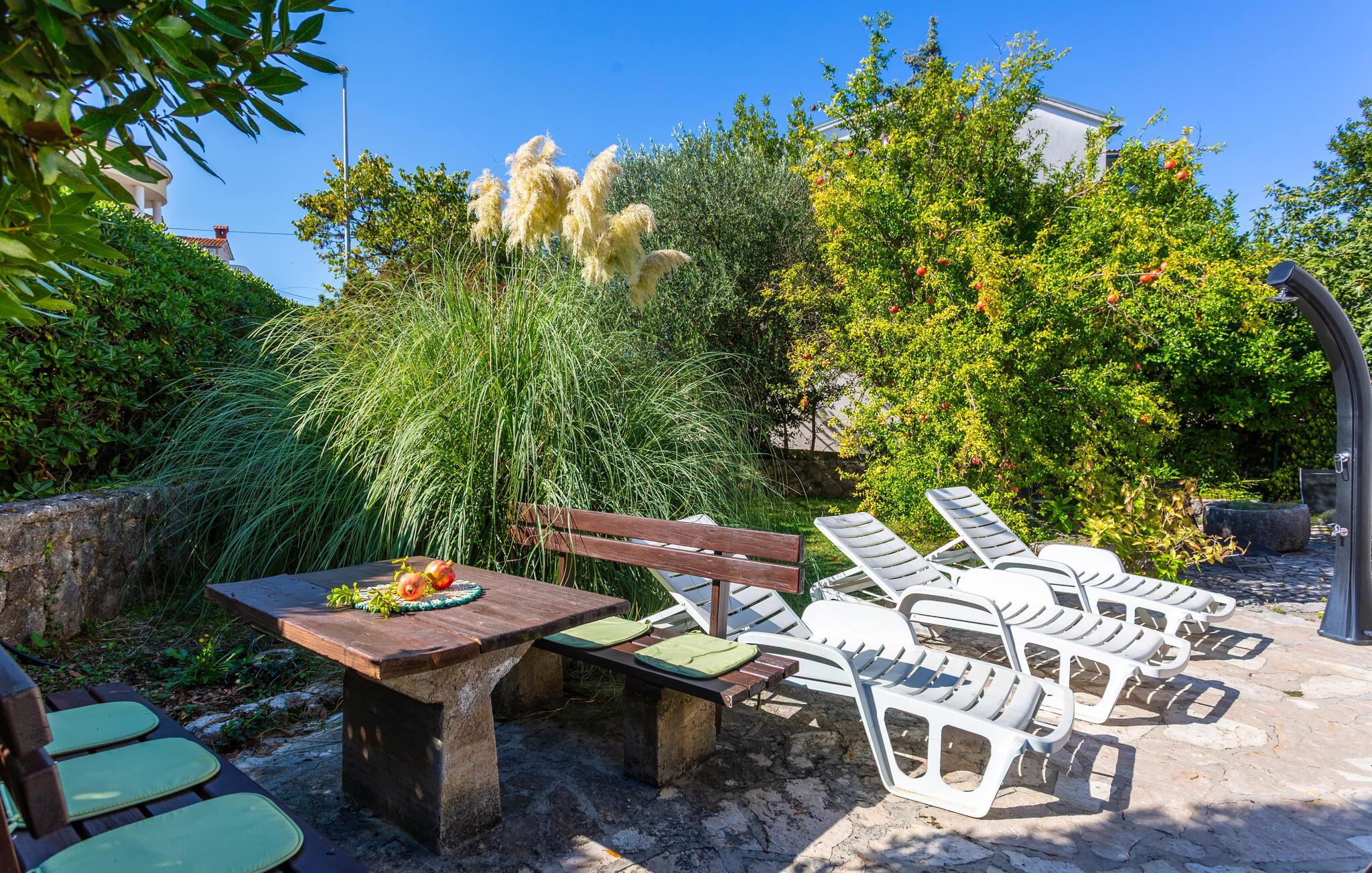 I den populære ferieby Malinska ligger dette feriehus, omgivet af en dejlig have. Det er ideelt til familier. Med overdækket terrasse og badebassin. Stueetagen har en rummelig dagligstue. I overetagen ligger soveværelserne og en lille dagligstue med udgang til den store terrasse. Herfra har I en skøn udsigt til havet. Bag huset ligger en gade. Men den overdådige, grønne have er imellem, og værelserne vender mod havet. Huset ligger i nærheden af byens centrum. I kan gå i vandet på de tre offentlige strande eller i de ensomme bugter. En mængde kulturelle arrangementer med folklore og folkefester sørger for underholdning. Ved siden af den lange og smukke promenade er der forskellige sportsanlæg.