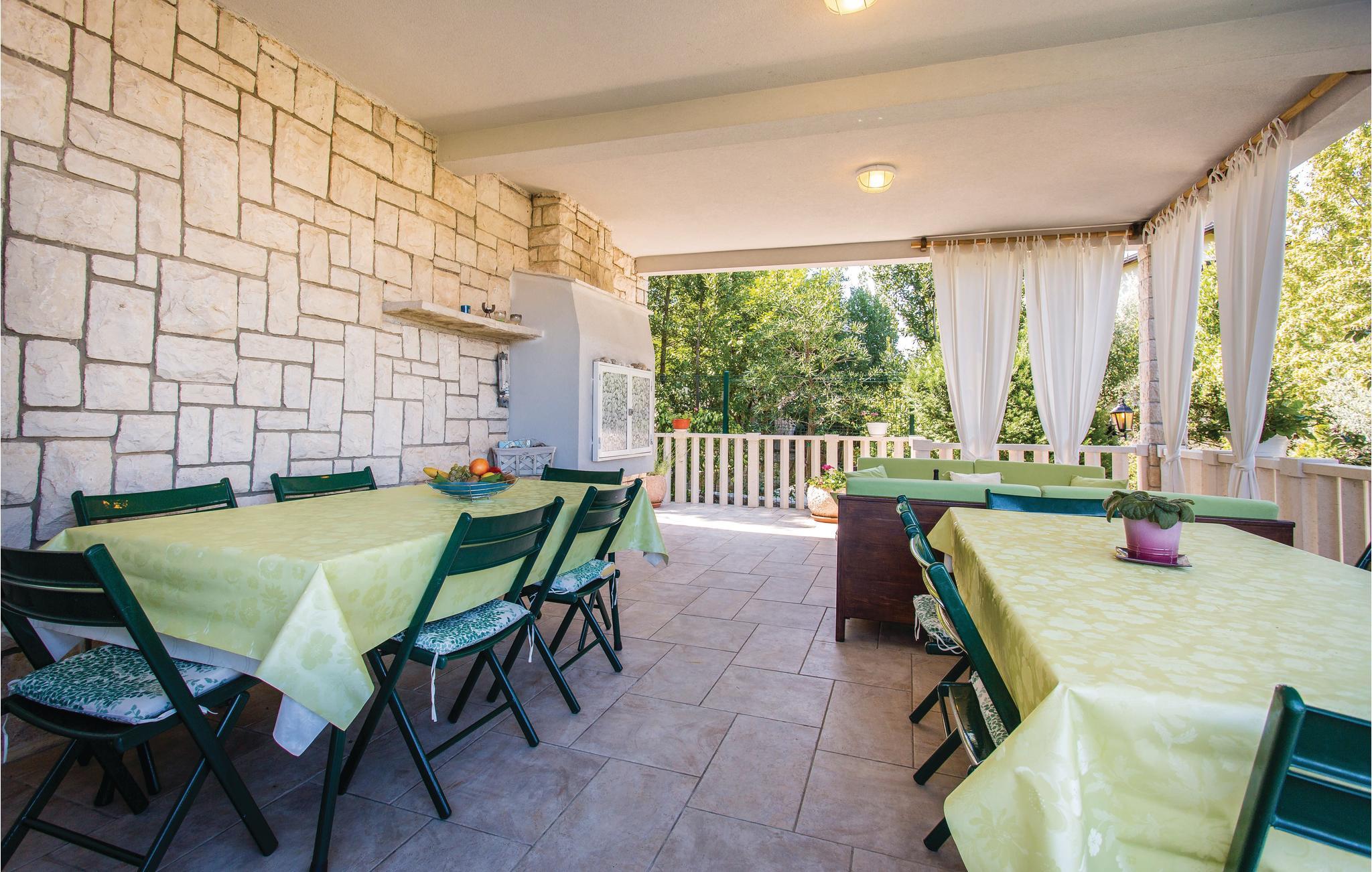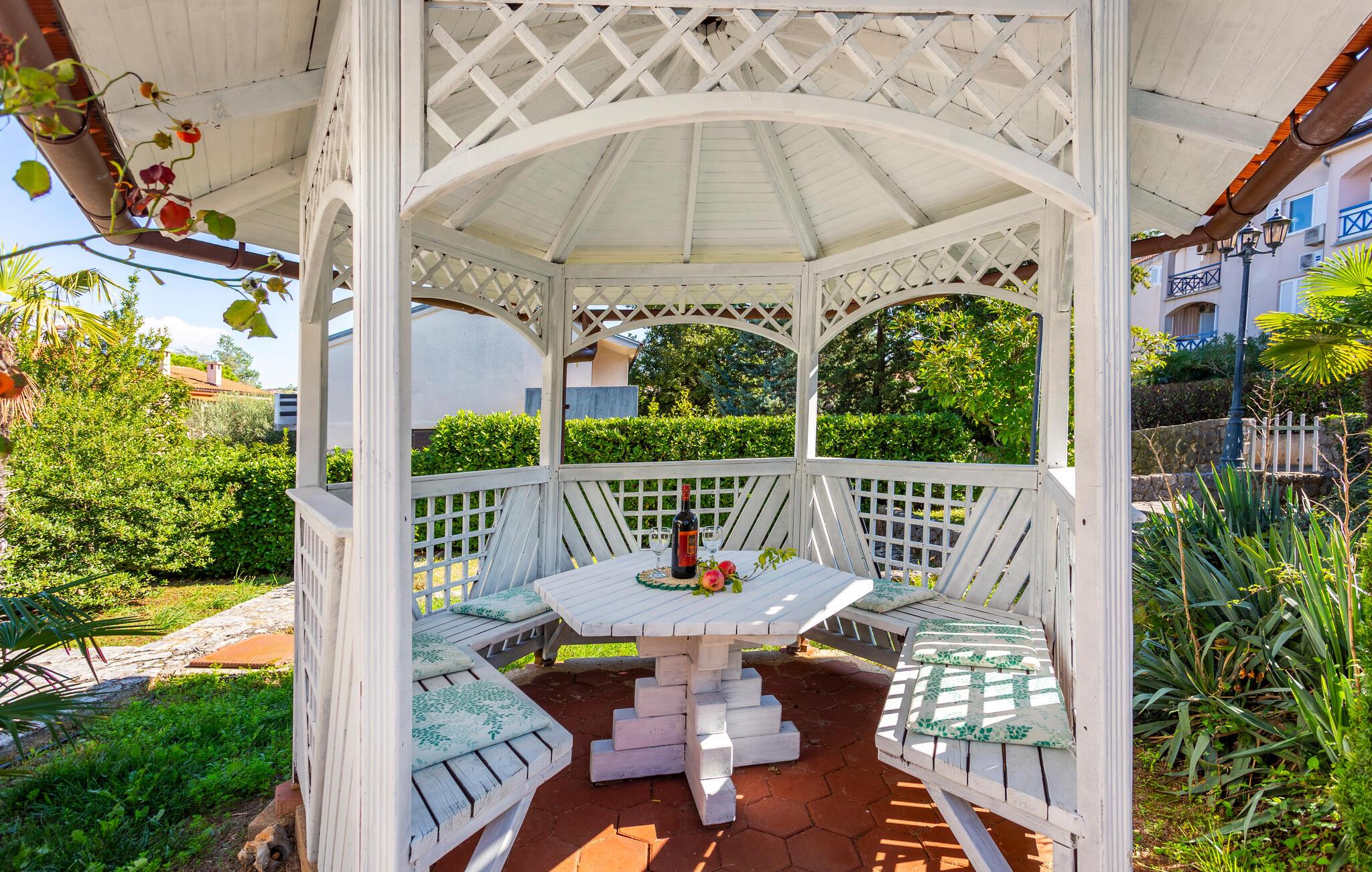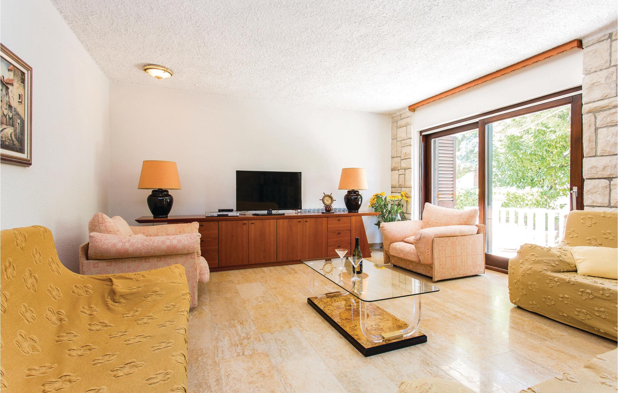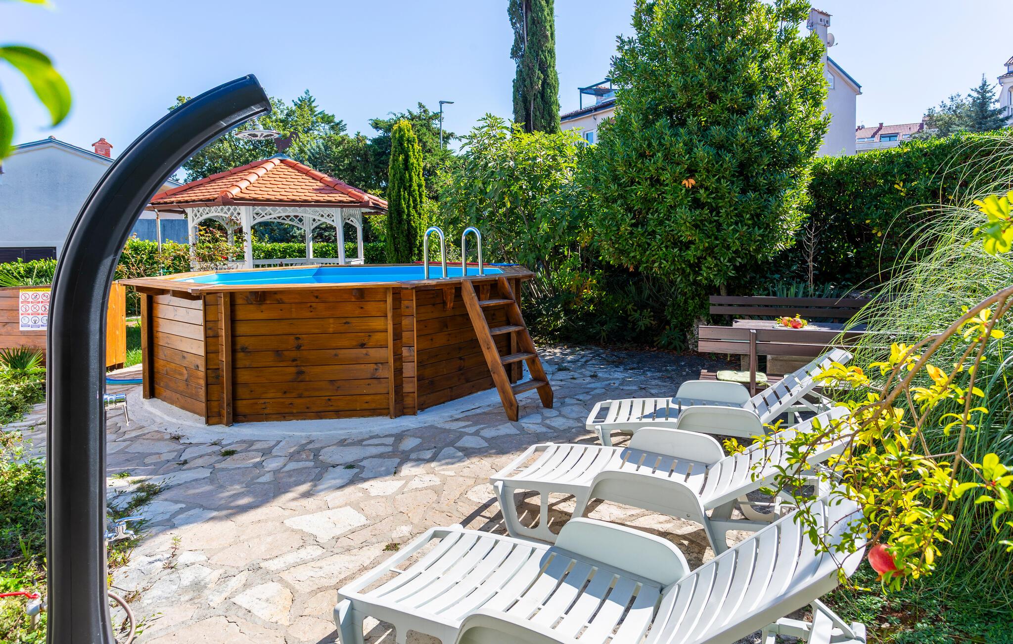 I den populære ferieby Malinska ligger dette feriehus, omgivet af en dejlig have. Det er ideelt til familier. Med overdækket terrasse og badebassin. Stueetagen har en rummelig dagligstue. I overetagen ligger soveværelserne og en lille dagligstue med udgang til den store terrasse. Herfra har I en skøn udsigt til havet. Bag huset ligger en gade. Men den overdådige, grønne have er imellem, og værelserne vender mod havet. Huset ligger i nærheden af byens centrum. I kan gå i vandet på de tre offentlige strande eller i de ensomme bugter. En mængde kulturelle arrangementer med folklore og folkefester sørger for underholdning. Ved siden af den lange og smukke promenade er der forskellige sportsanlæg.