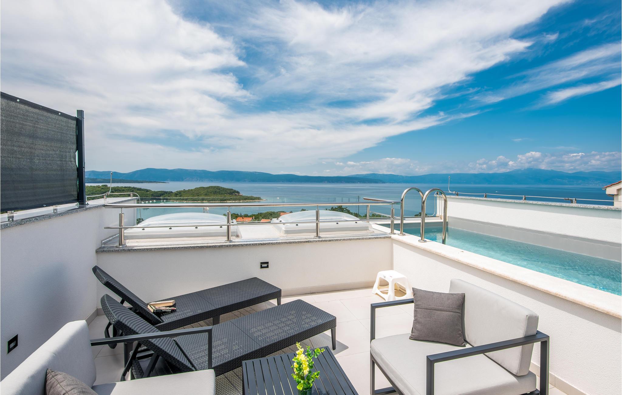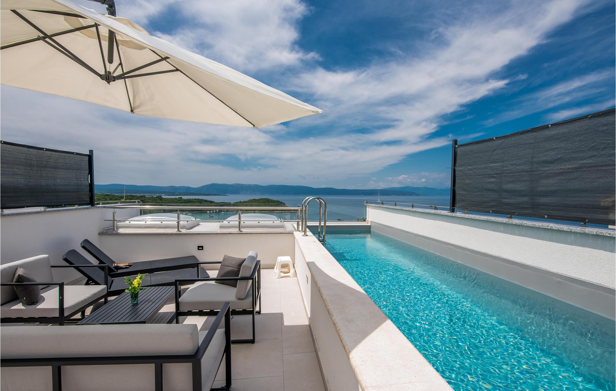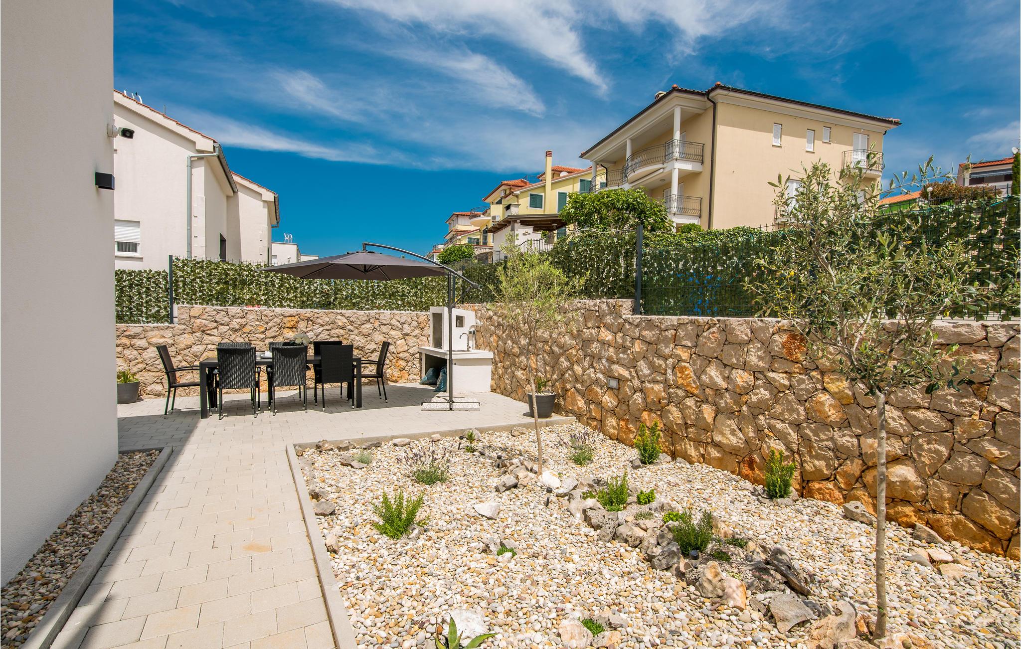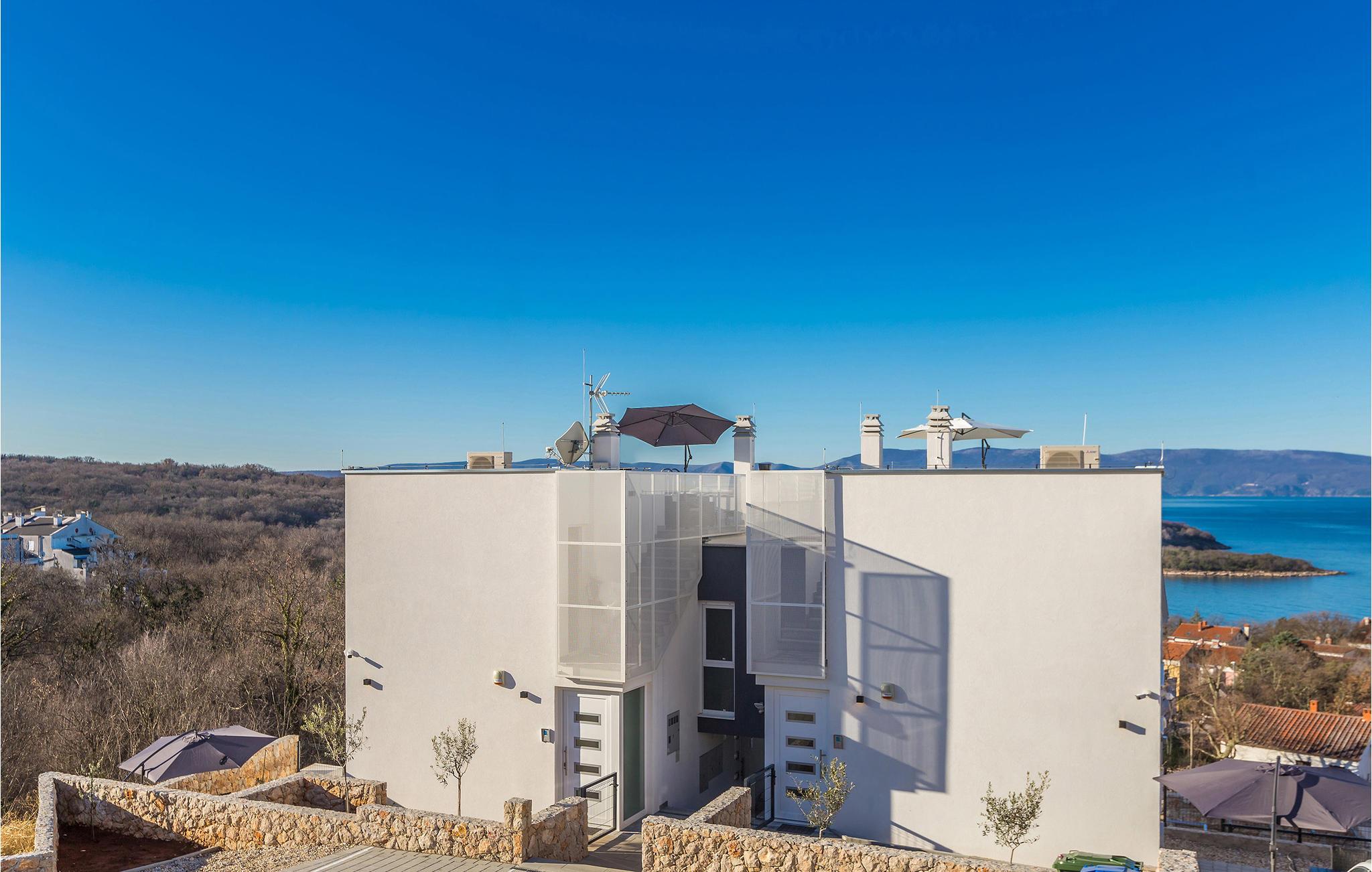 Huset består af en stueetage og en første sal samt en smuk tagterrasse med soldæk og pool. Indgangen til huset er på bagsiden af ??bygningen, hvor der er to parkeringspladser. Haven er indhegnet og ligger på samme niveau som stueetagen, hvor der er et soveværelse med eget badeværelse. I haven er der en murstensgrill med plads til udendørs madlavning. Ovenpå er der en rummelig stue med køkken og to soveværelser med badeværelser. På tagterrassen finder du et opholdsområde ved poolen og et soldæk med liggestole. Alle detaljer og udstyr inde og ude er omhyggeligt designet til at fylde dit ophold med fred, nydelse og afslapning. Stenstranden ligger ca. 300 m væk og kan nås til fods. På øen Krk kan de aktive feriegæster forvente en fantastisk ferie. Der er promenader, kilometerlange cykel- og løbestier, der fører gennem det smukke landskab; en ideel måde at opdage den fantastiske naturskønhed på.