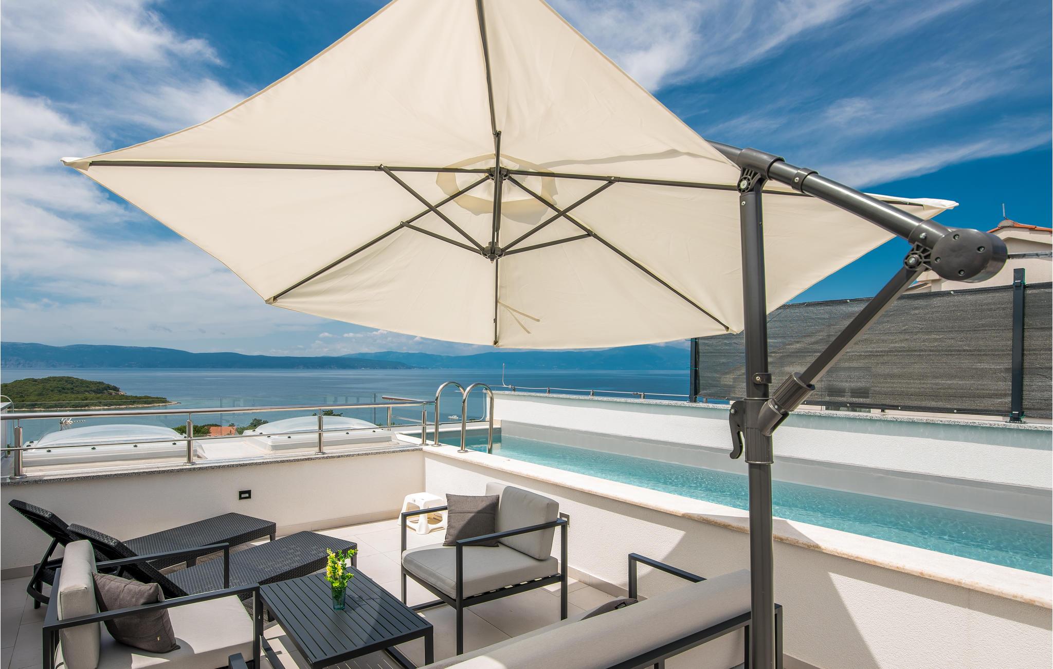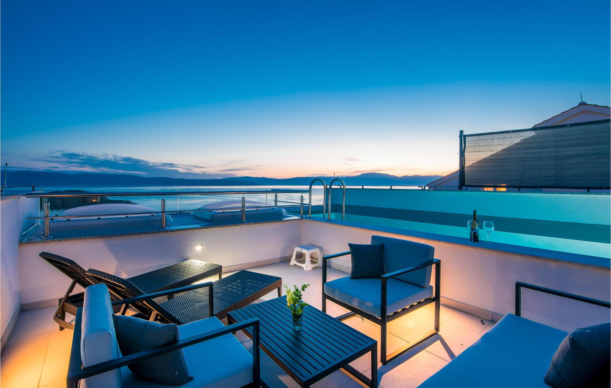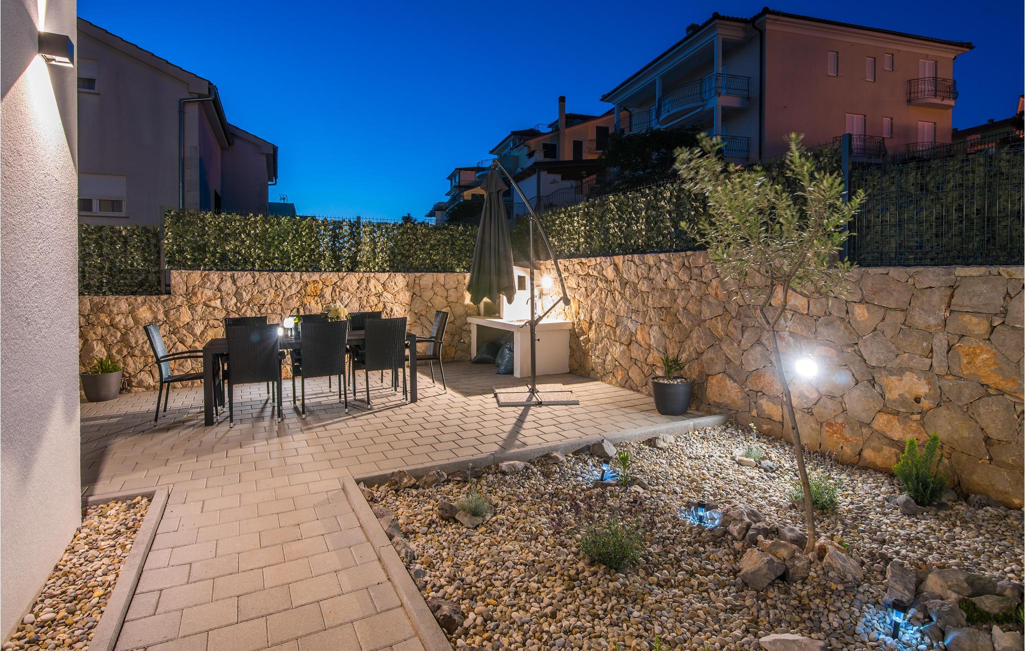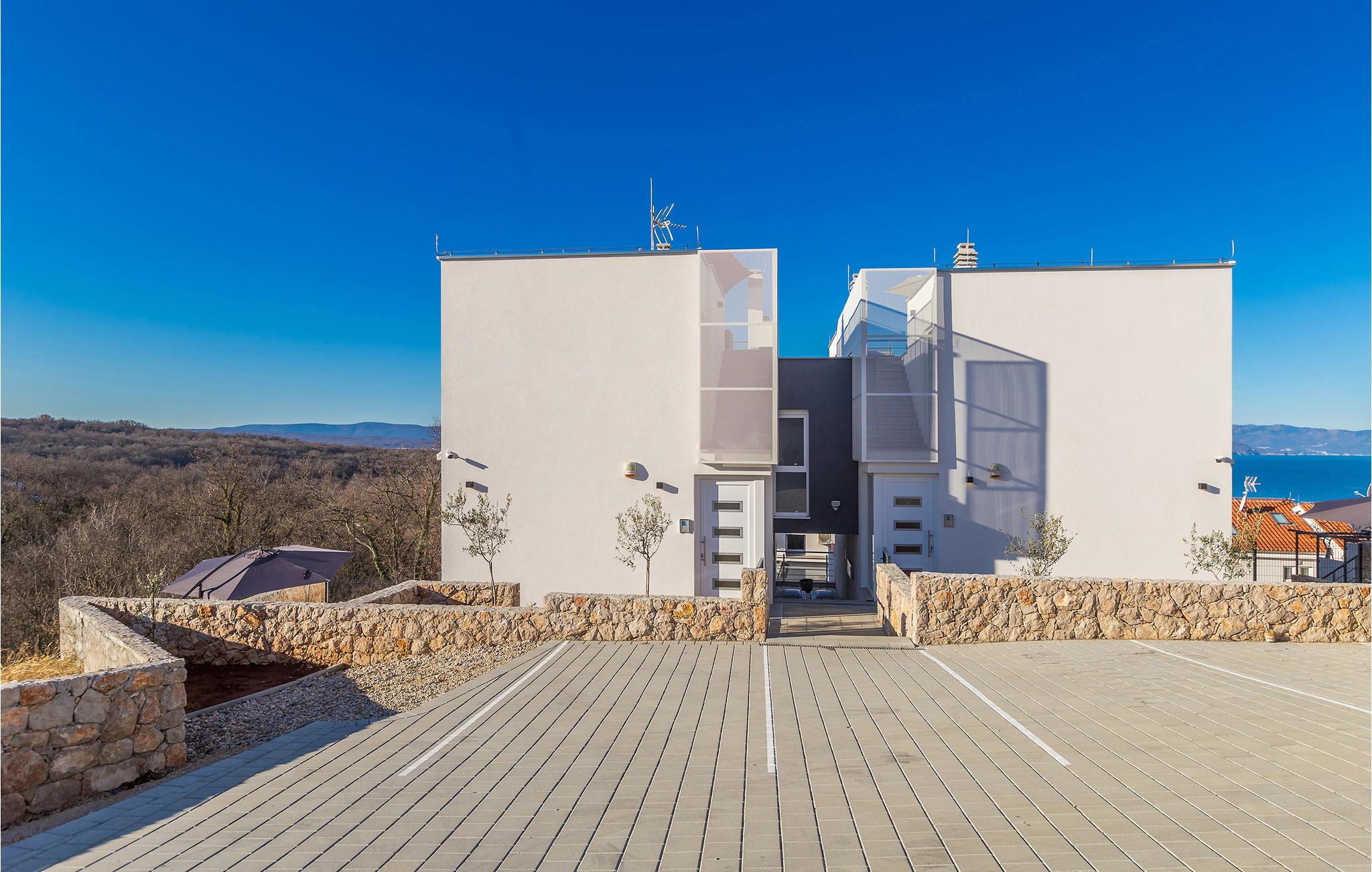 Huset består af en stueetage og en første sal samt en smuk tagterrasse med soldæk og pool. Indgangen til huset er på bagsiden af ??bygningen, hvor der er to parkeringspladser. Haven er indhegnet og ligger på samme niveau som stueetagen, hvor der er et soveværelse med eget badeværelse. I haven er der en murstensgrill med plads til udendørs madlavning. Ovenpå er der en rummelig stue med køkken og to soveværelser med badeværelser. På tagterrassen finder du et opholdsområde ved poolen og et soldæk med liggestole. Alle detaljer og udstyr inde og ude er omhyggeligt designet til at fylde dit ophold med fred, nydelse og afslapning. Stenstranden ligger ca. 300 m væk og kan nås til fods. På øen Krk kan de aktive feriegæster forvente en fantastisk ferie. Der er promenader, kilometerlange cykel- og løbestier, der fører gennem det smukke landskab; en ideel måde at opdage den fantastiske naturskønhed på.