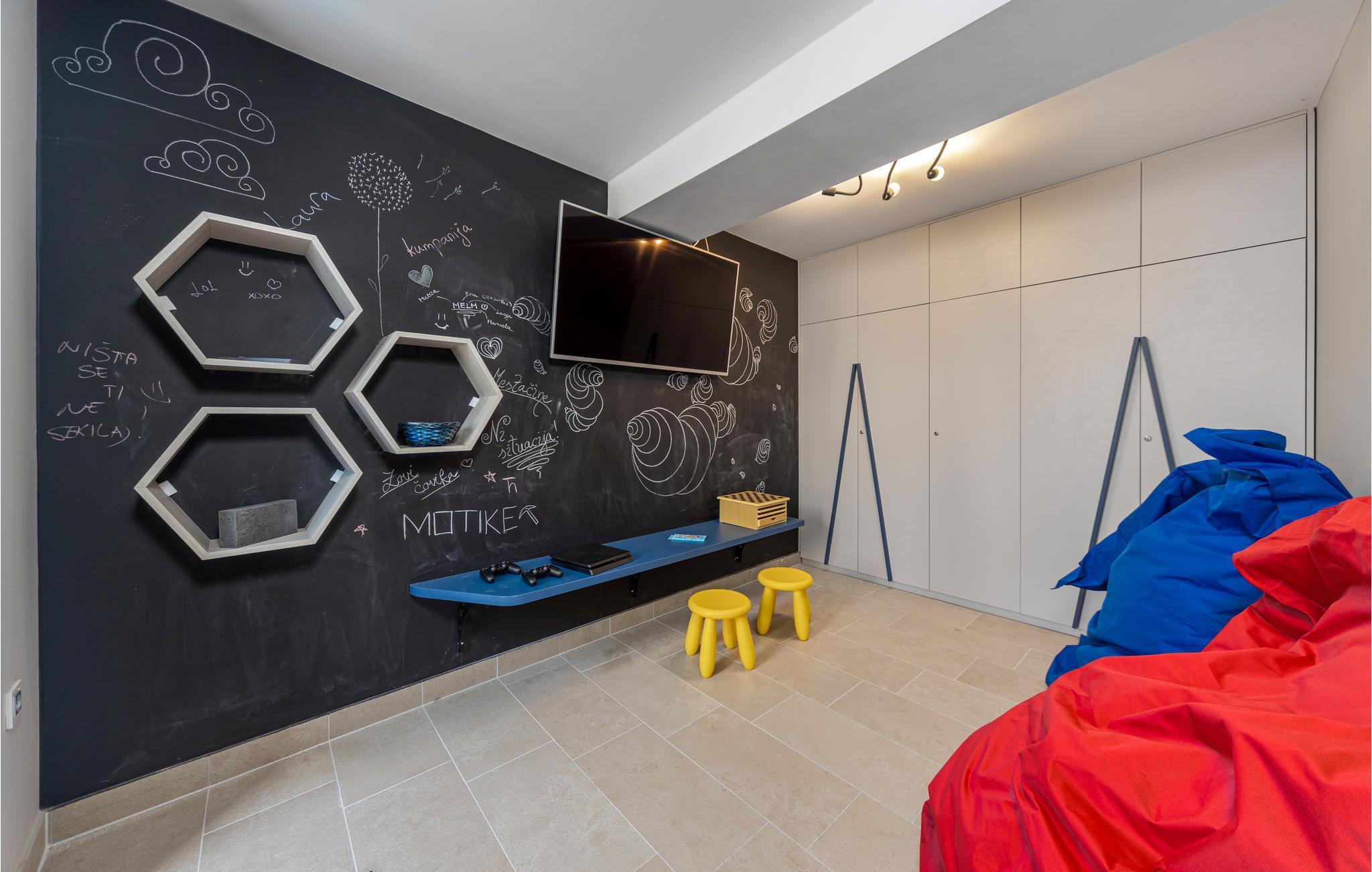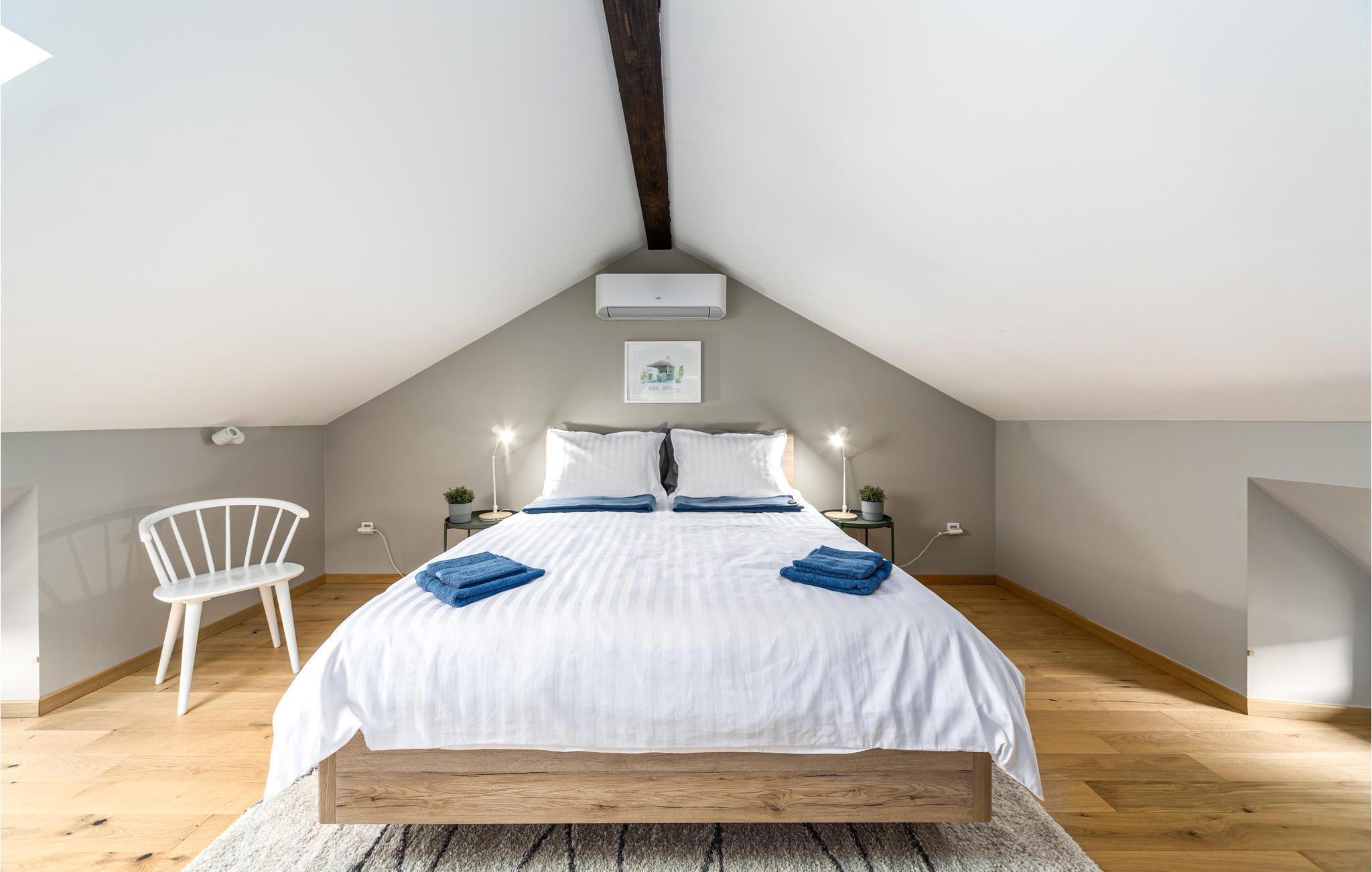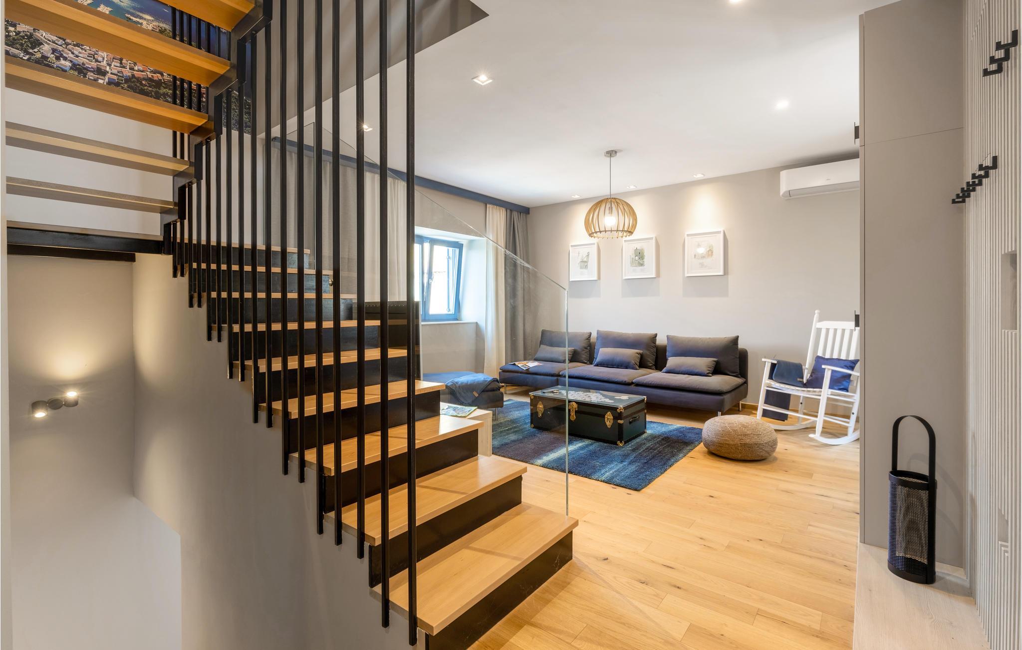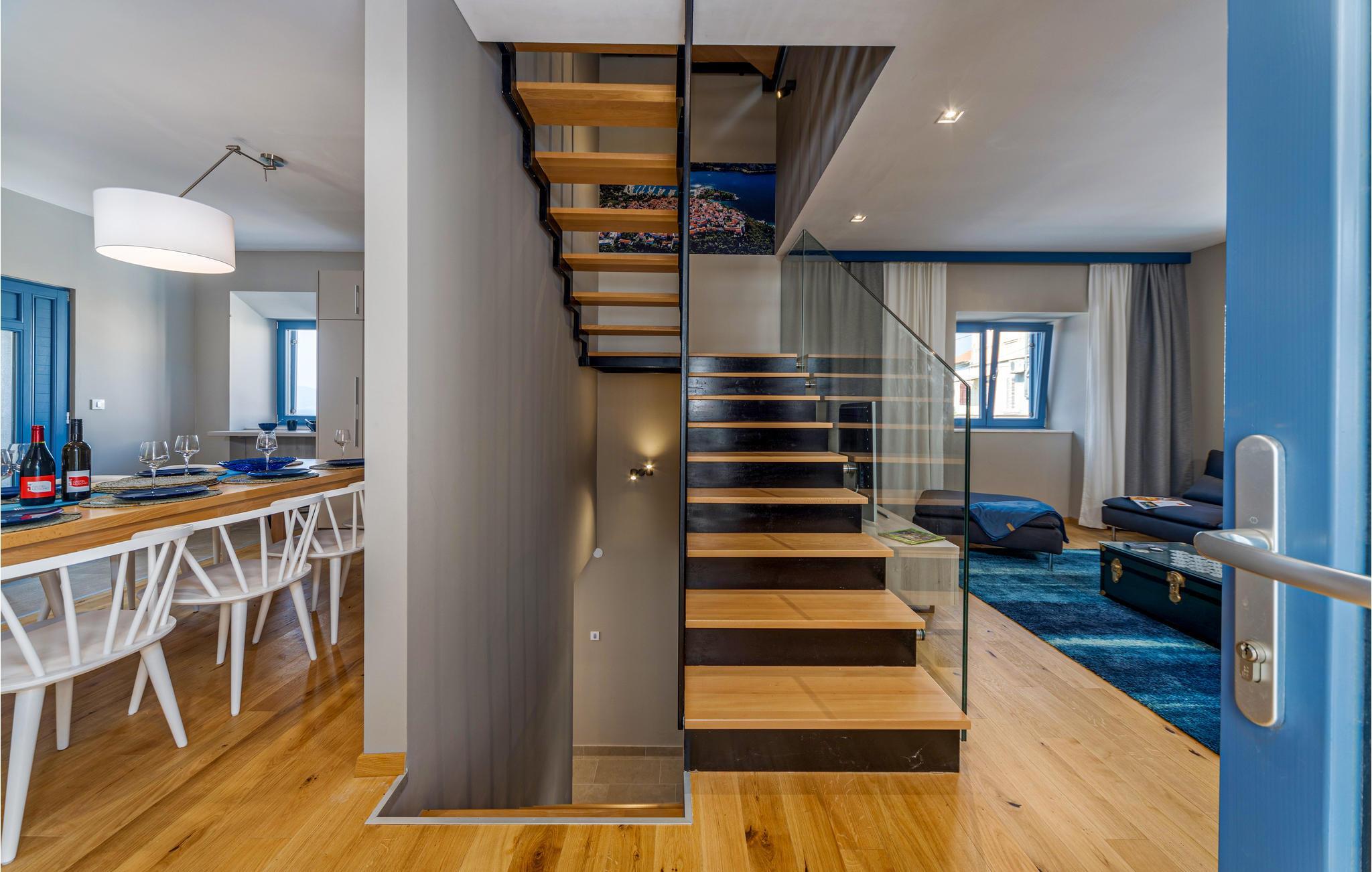 Huset har plads til 8 personer og et kæledyr. Det består af fire etager, der er forbundet med en intern trappe. I kælderen, som også er tilgængelig fra terrassen, er der et lille wellness-område med sauna og boblebad, et badeværelse og et rum, hvor børn kan lege og have det sjovt. Stuen og det veludstyrede køkken ligger i stueetagen, hvorfra man kommer til de to øverste etager med to soveværelser, hver med to badeværelser på første sal. Der er skråvægge ned til ca. 90 cm loftshøjde.