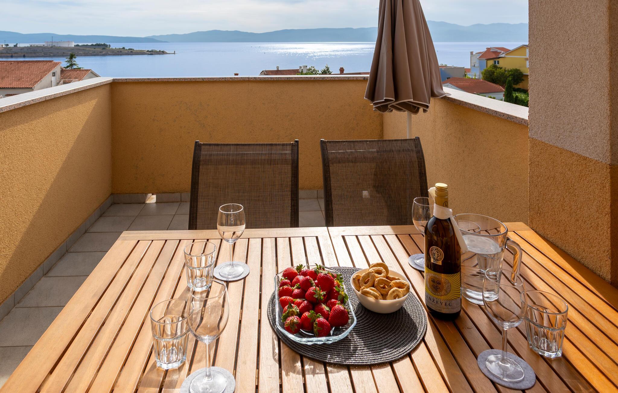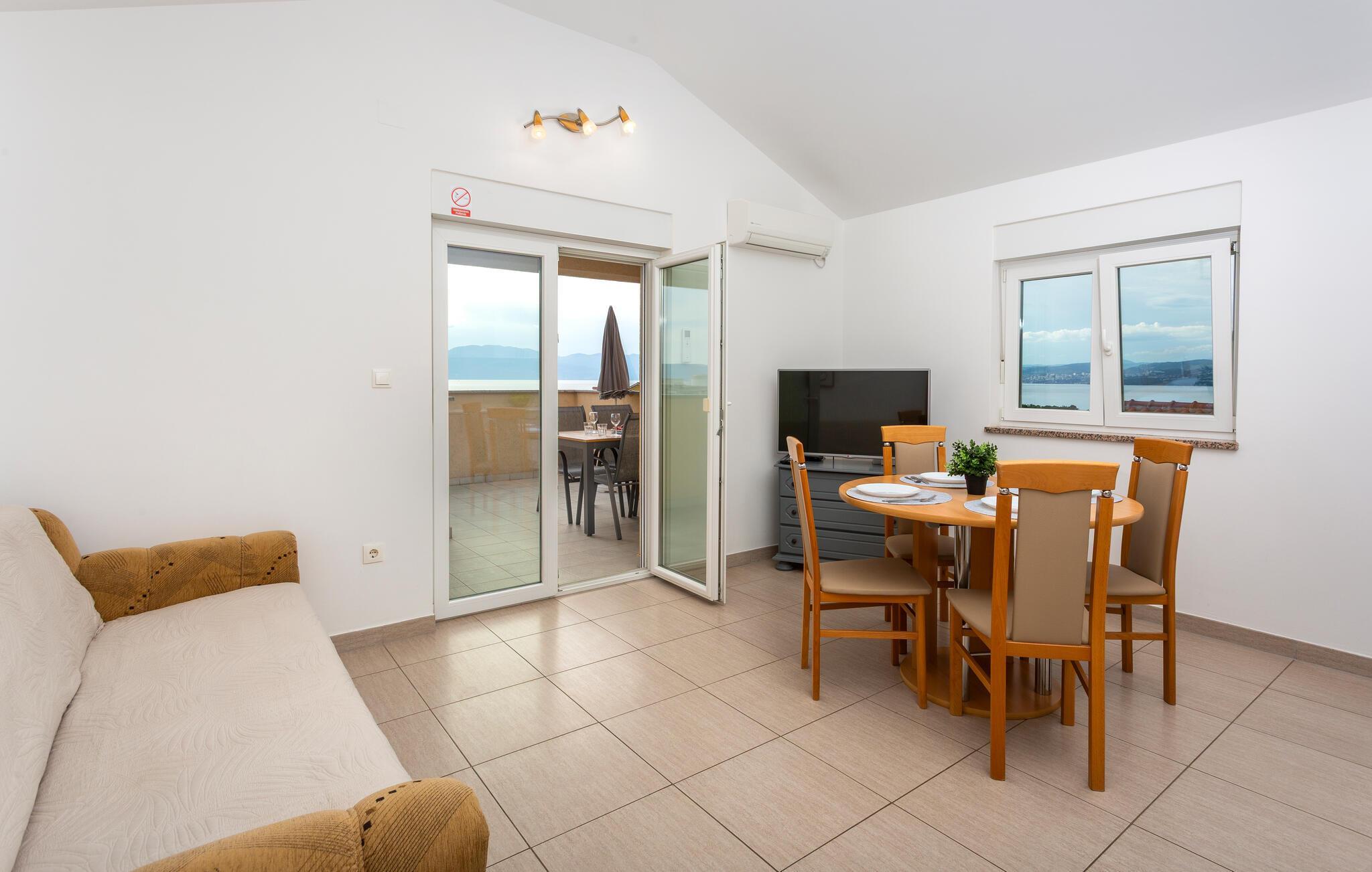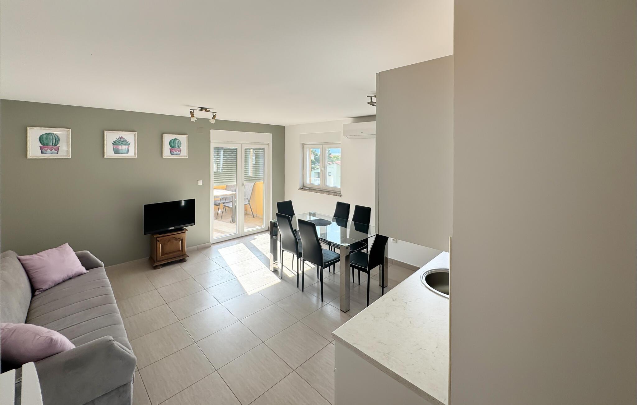 Denne lyse og stilfuldt indrettede ferielejlighed lægger op til at tage en afslappende pause ikke langt fra den fortryllende Adriaterhavskyst. Tilbered lækre retter i det moderne køkken og tag plads ved det elegante spisebord. Find jer godt til rette i sofaen med en spændende bog eller hel jer familien med en hyggelig spilleaften.