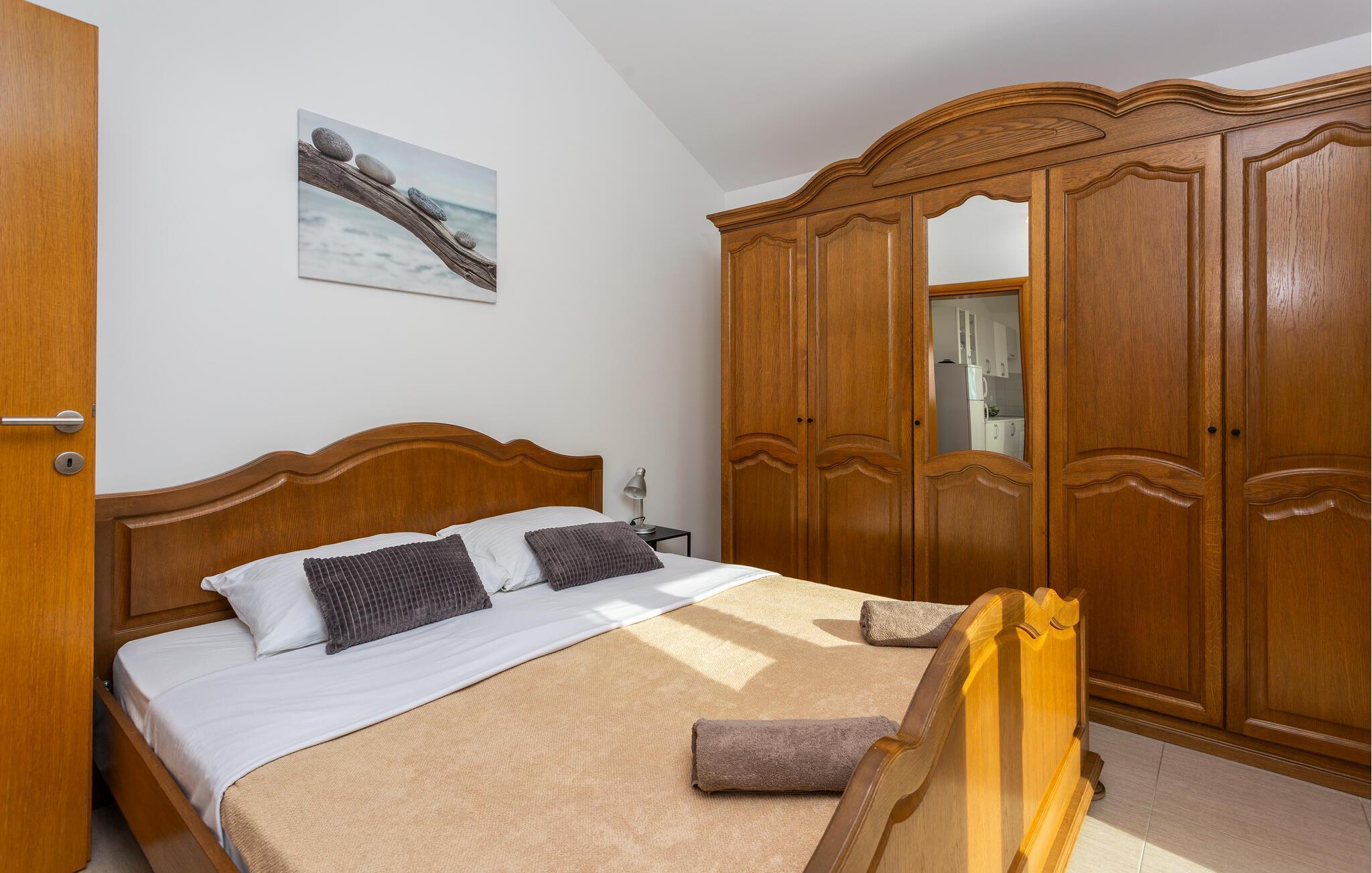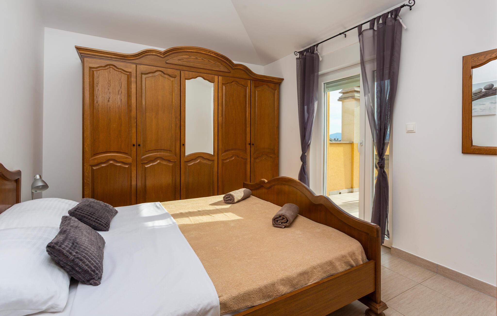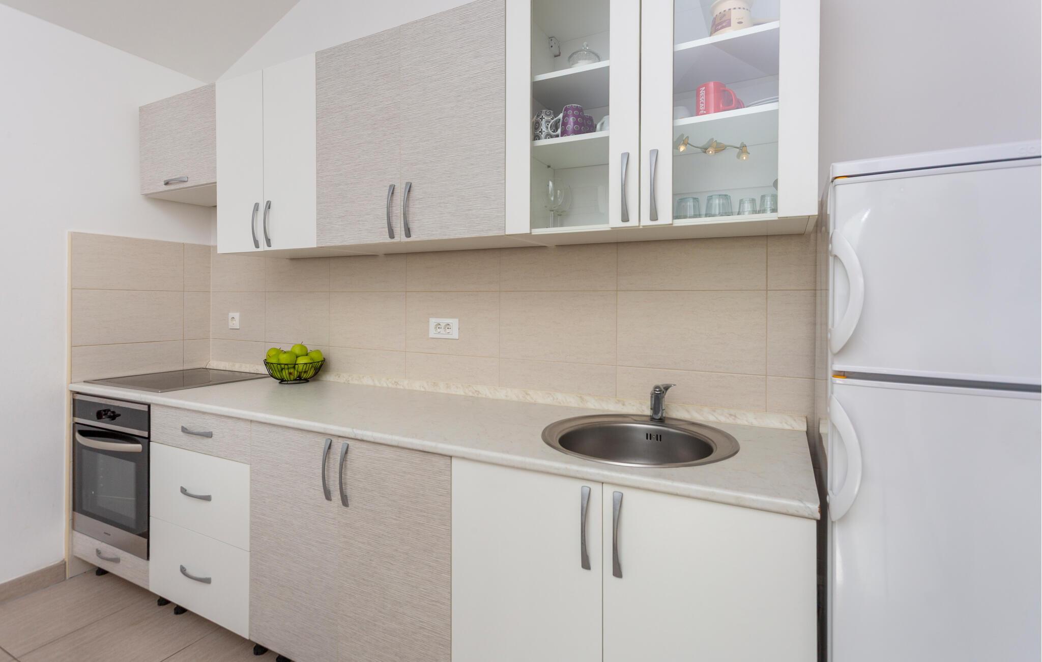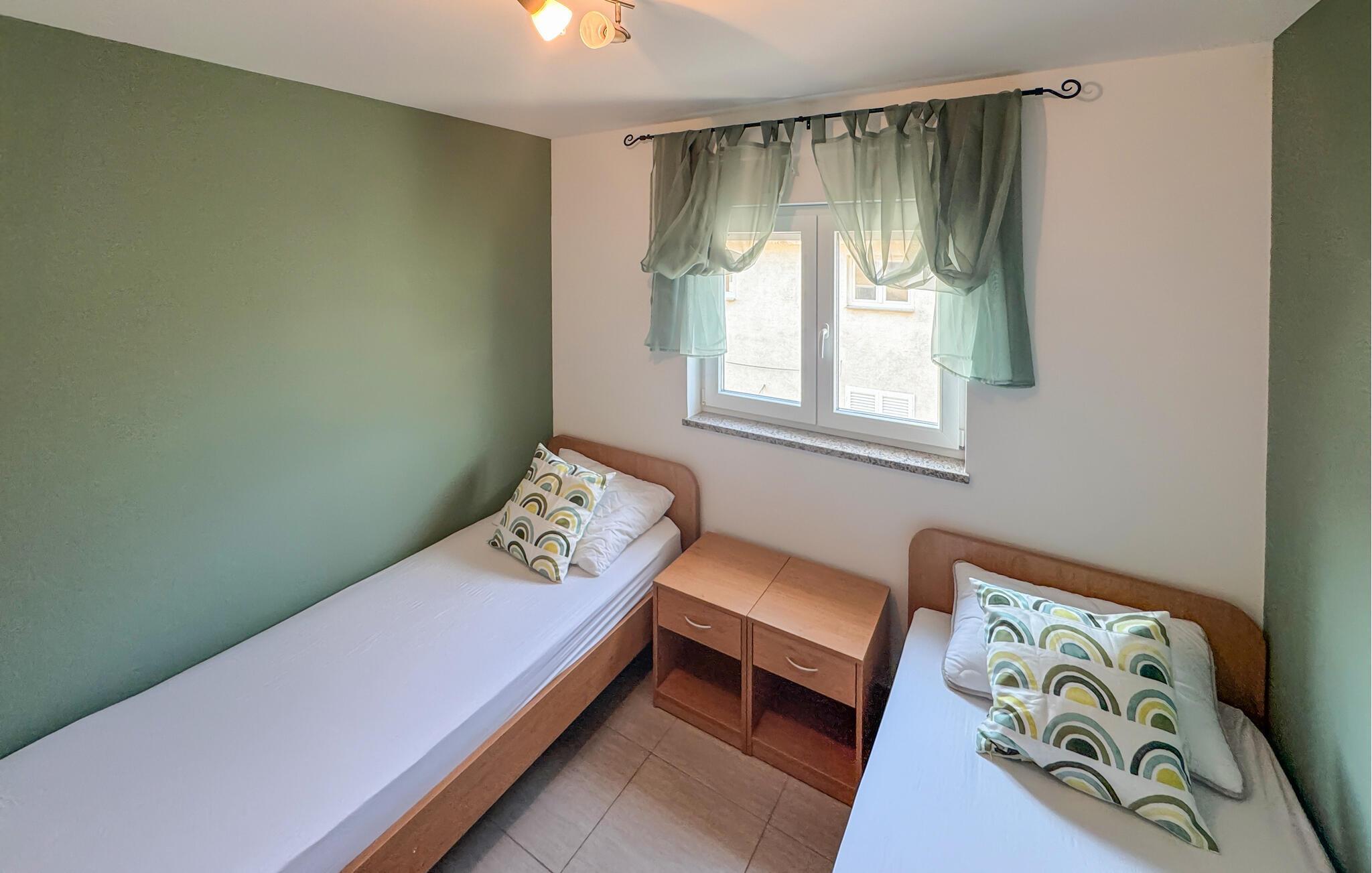 Denne lyse og stilfuldt indrettede ferielejlighed lægger op til at tage en afslappende pause ikke langt fra den fortryllende Adriaterhavskyst. Tilbered lækre retter i det moderne køkken og tag plads ved det elegante spisebord. Find jer godt til rette i sofaen med en spændende bog eller hel jer familien med en hyggelig spilleaften.