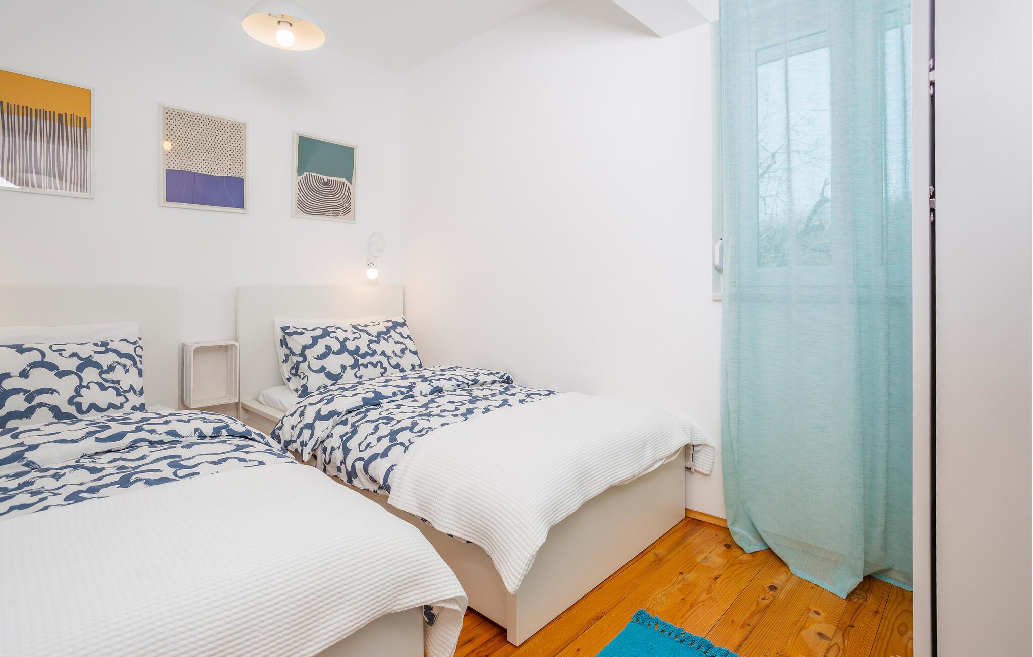 I kan være otte gæster i huset og fordele jer i de tre soveværelser samt stuen, hvor der er to ekstra sengepladser.