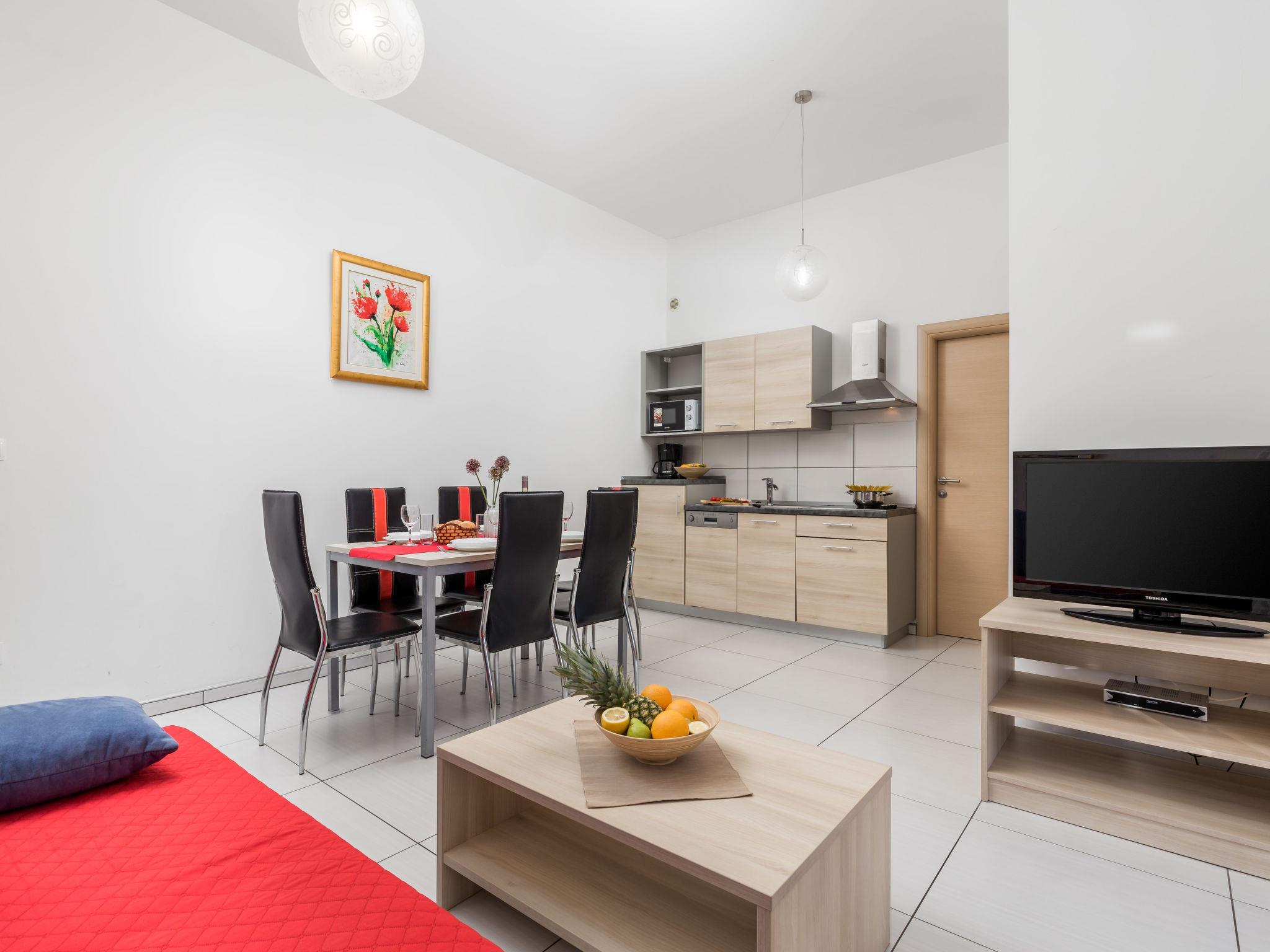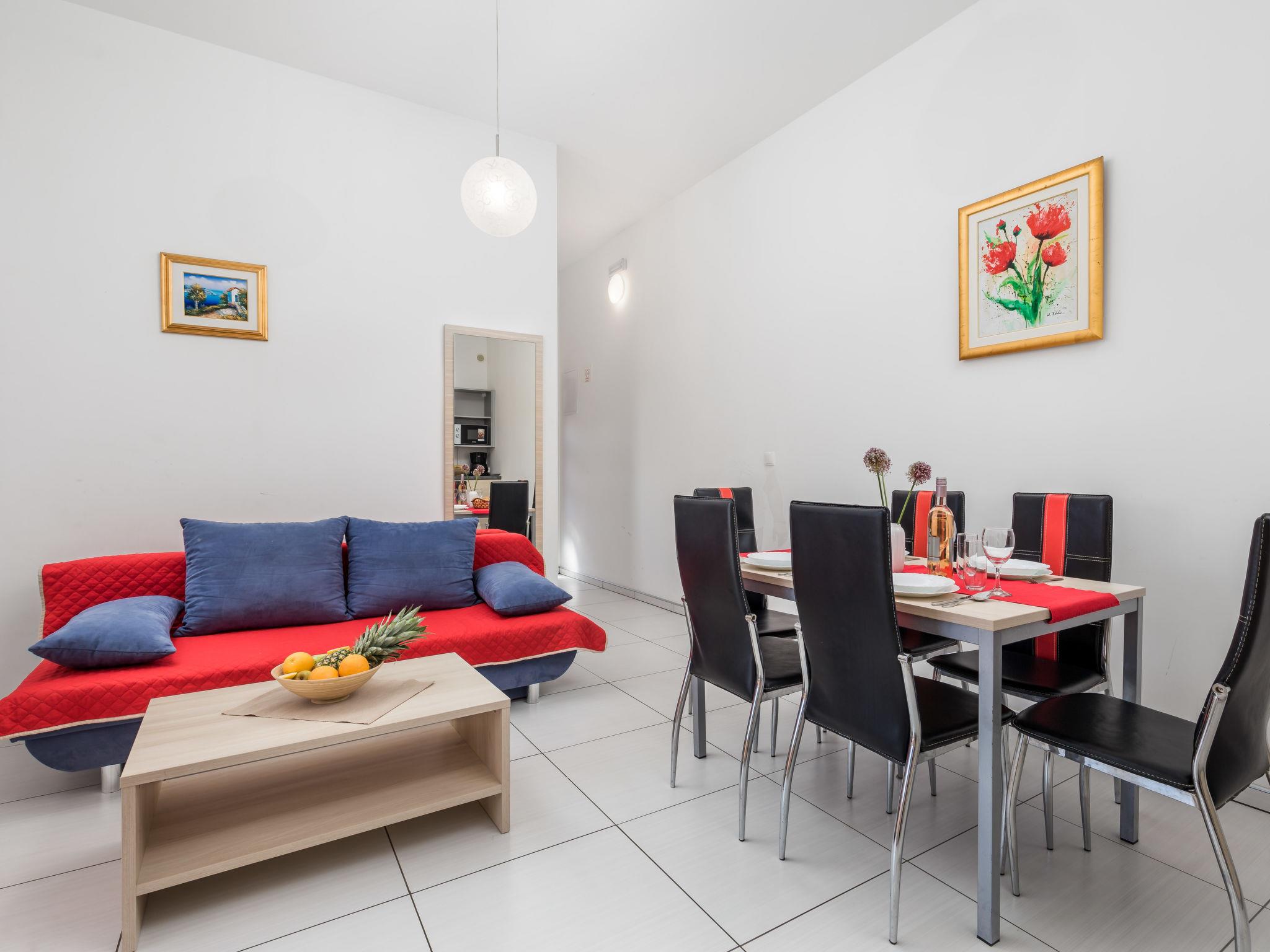 3-room apartment 43 m2, south facing position. Living/dining room 17 m2 with 1 sofabed, satellite TV and air conditioning. Exit to the terrace. 1 room with 1 double bed (2 x 80 cm, length 200 cm). 1 room with 2 beds (90 cm, length 200 cm). Open kitchen (dishwasher, 4 ceramic glass hob hotplates, microwave, electric coffee machine). Shower/WC. Terrace 14 m2, roofed. Terrace furniture. View of the swimming pool.