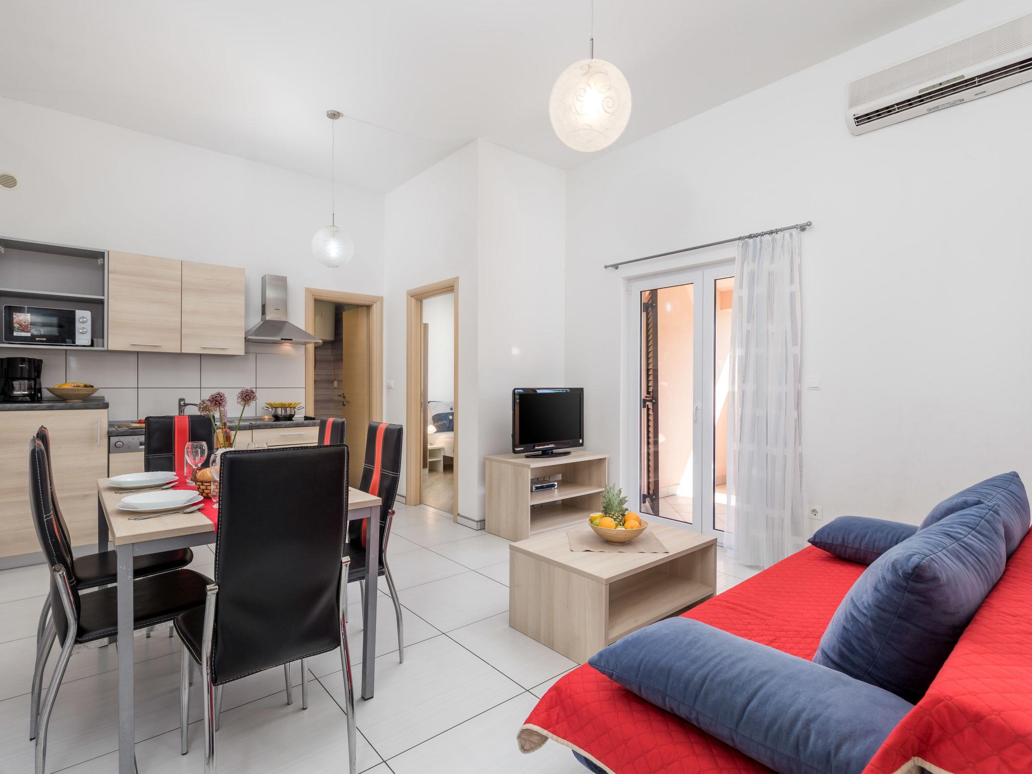 3-room apartment 43 m2 on 2nd floor, south facing position. Living/dining room 17 m2 with 1 sofabed, satellite TV and air conditioning. Exit to the balcony. 1 room with 1 double bed (2 x 80 cm, length 200 cm). 1 room with 2 beds (90 cm, length 200 cm). Open kitchen (dishwasher, 4 ceramic glass hob hotplates, microwave, electric coffee machine). Shower/WC. Balcony 14 m2. Balcony furniture. View of the swimming pool and the countryside.