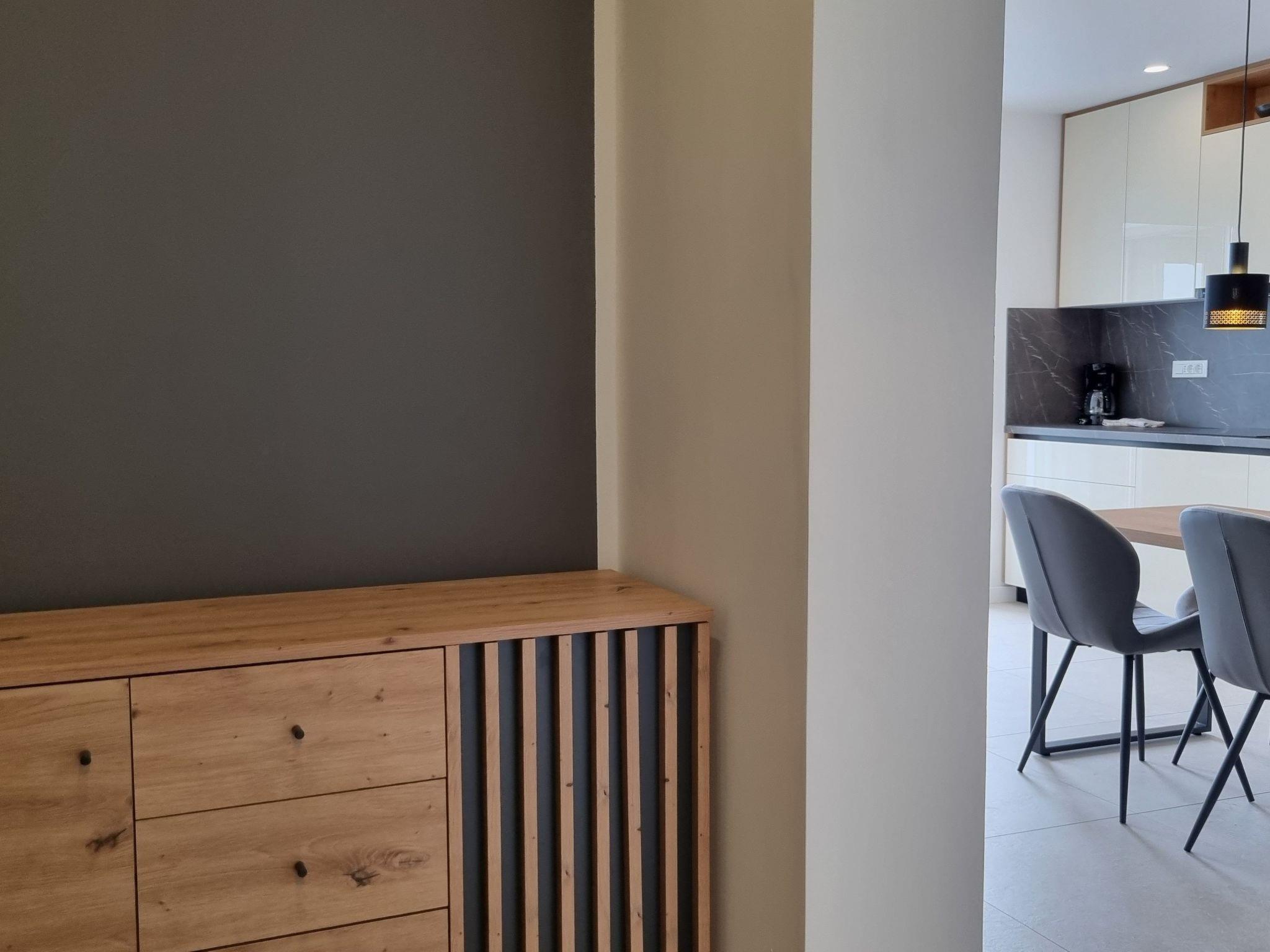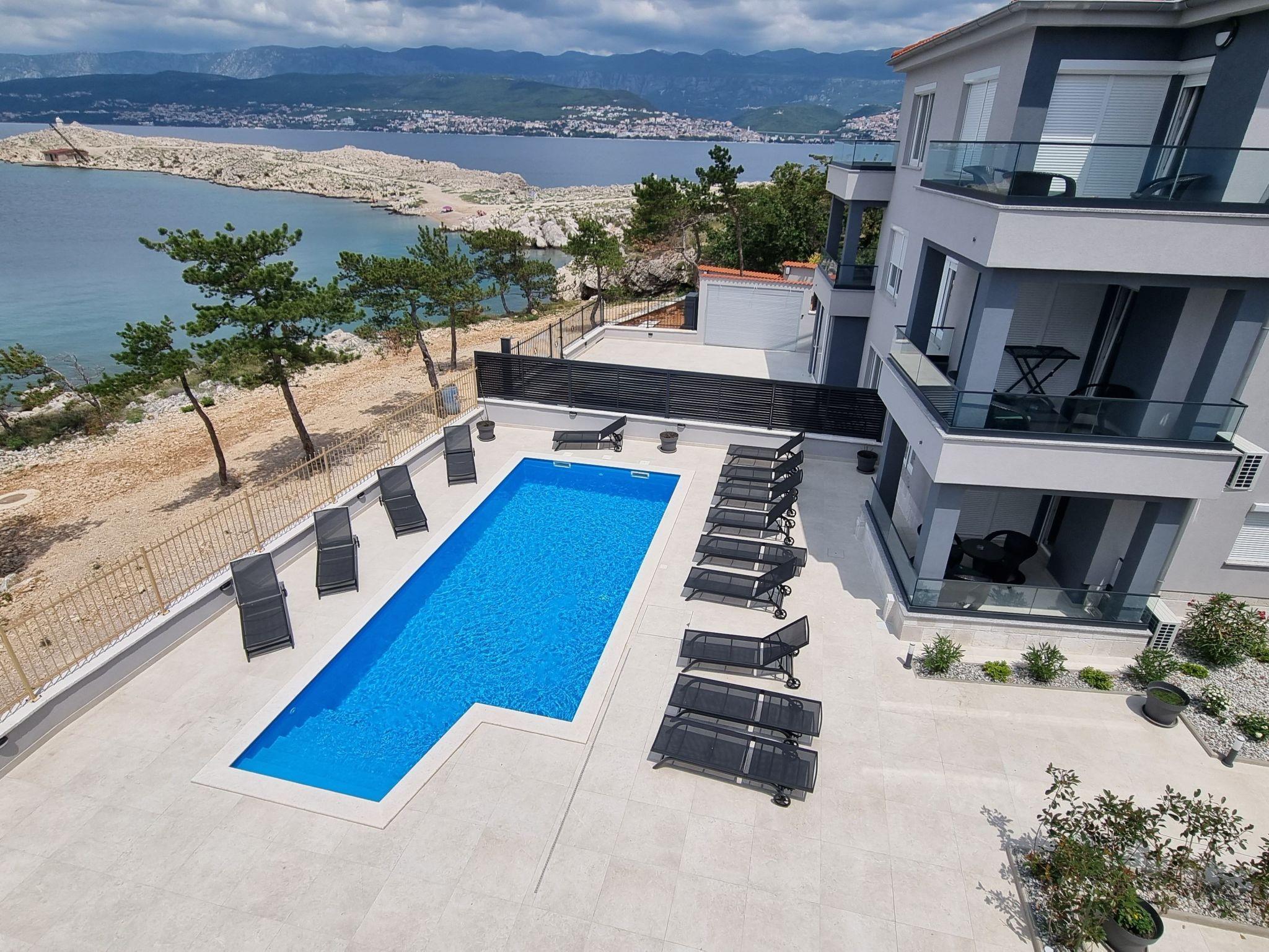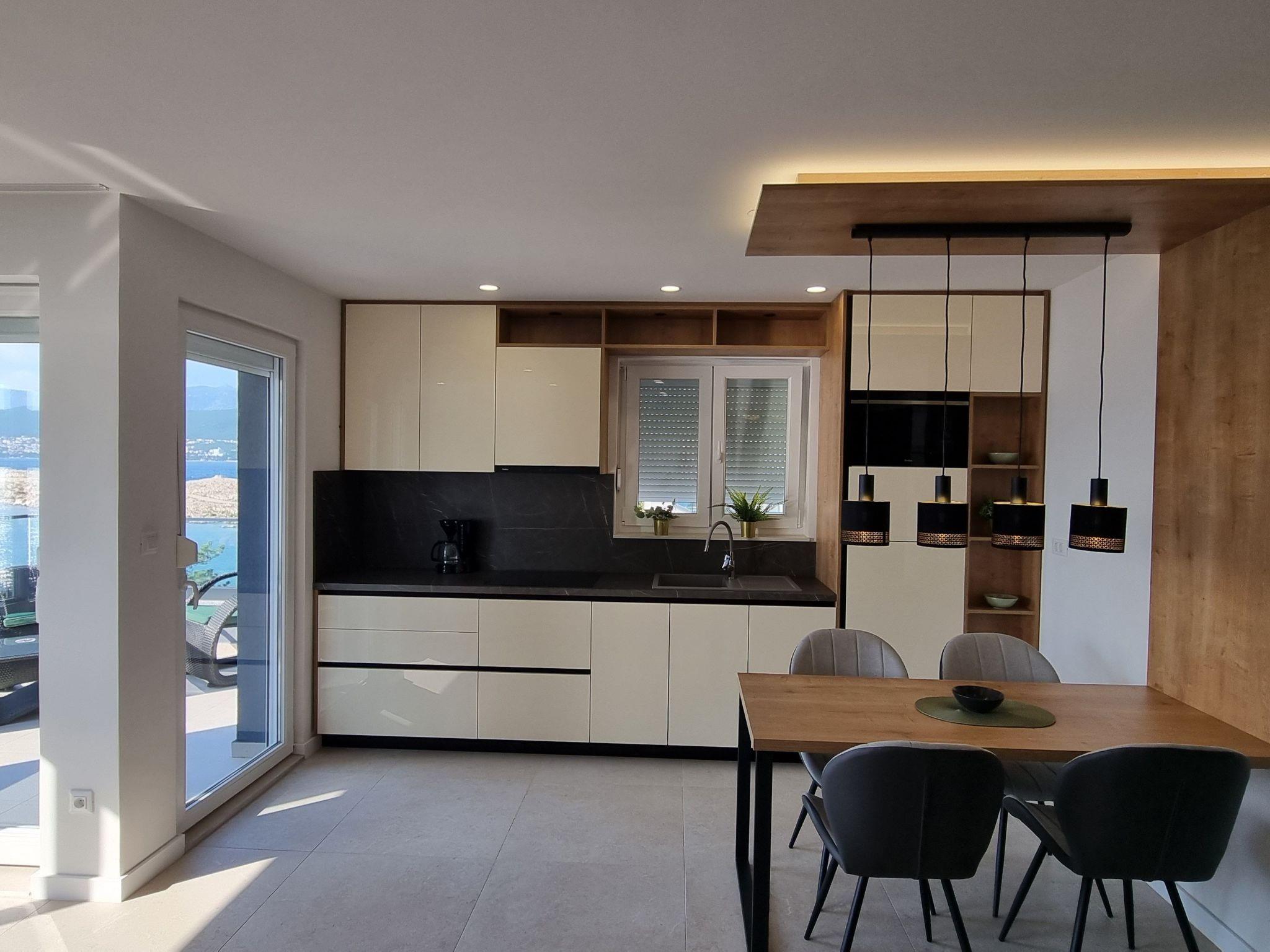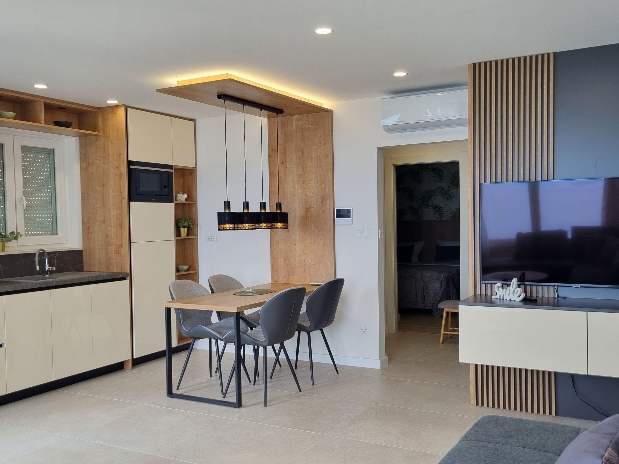 This luxurious and modern flat is located in a quiet apartment complex just 30 metres from the sea, surrounded by nature, many bays, pebble beaches and hiking trails. It offers a communal saltwater pool (36 m2), which is open from May to October and whose temperatures usually reach 20-26 °C. The flat is located on the 2nd floor and has a bedroom with a double bed, a modern kitchen with induction hob, fridge-freezer, kettle, coffee machine, toaster, microwave and dishwasher. The bathroom has a shower and toilet. The dining area and living room offer a cosy space with a sofa and smart TV, while free WiFi is available throughout the building.