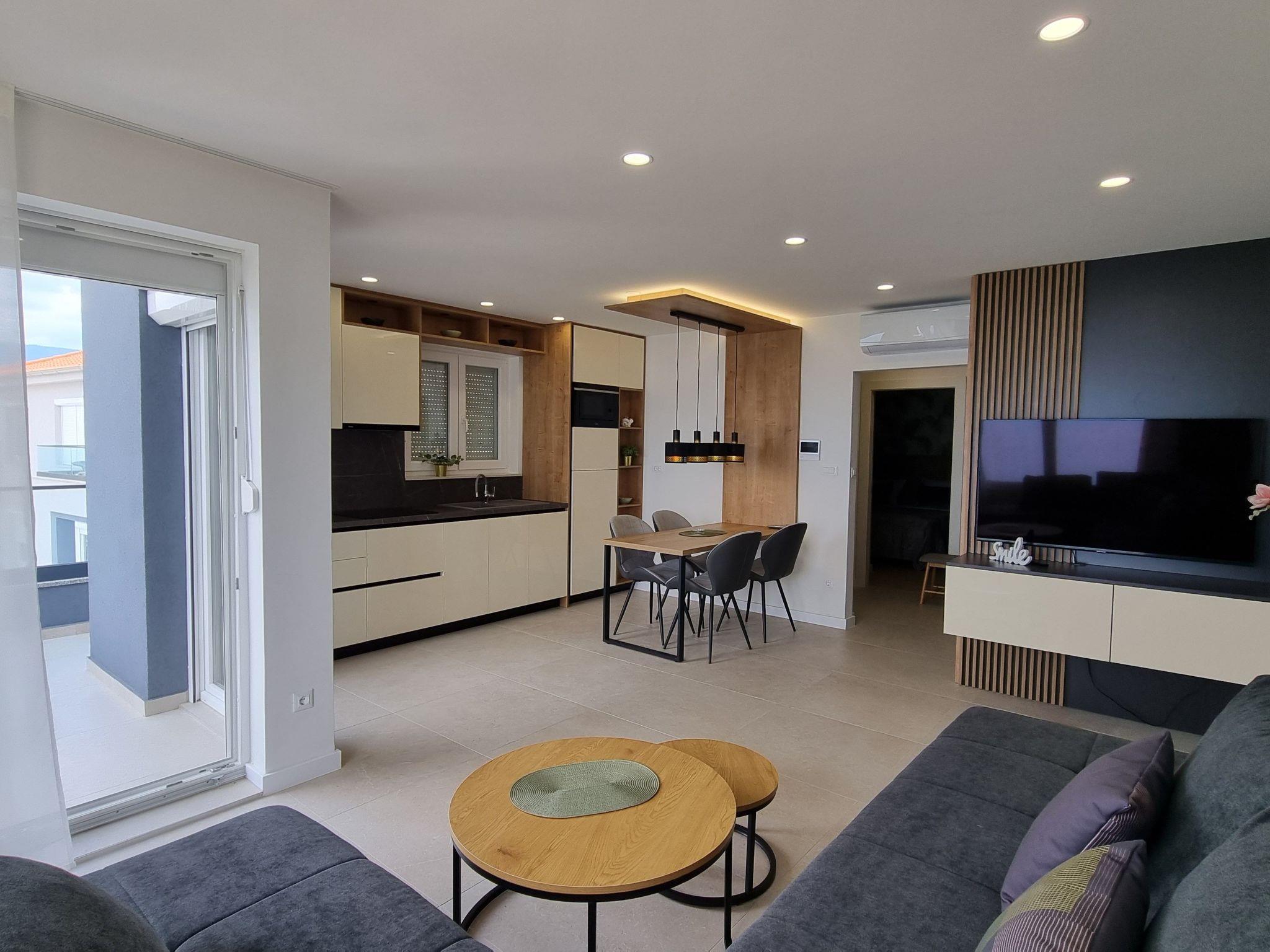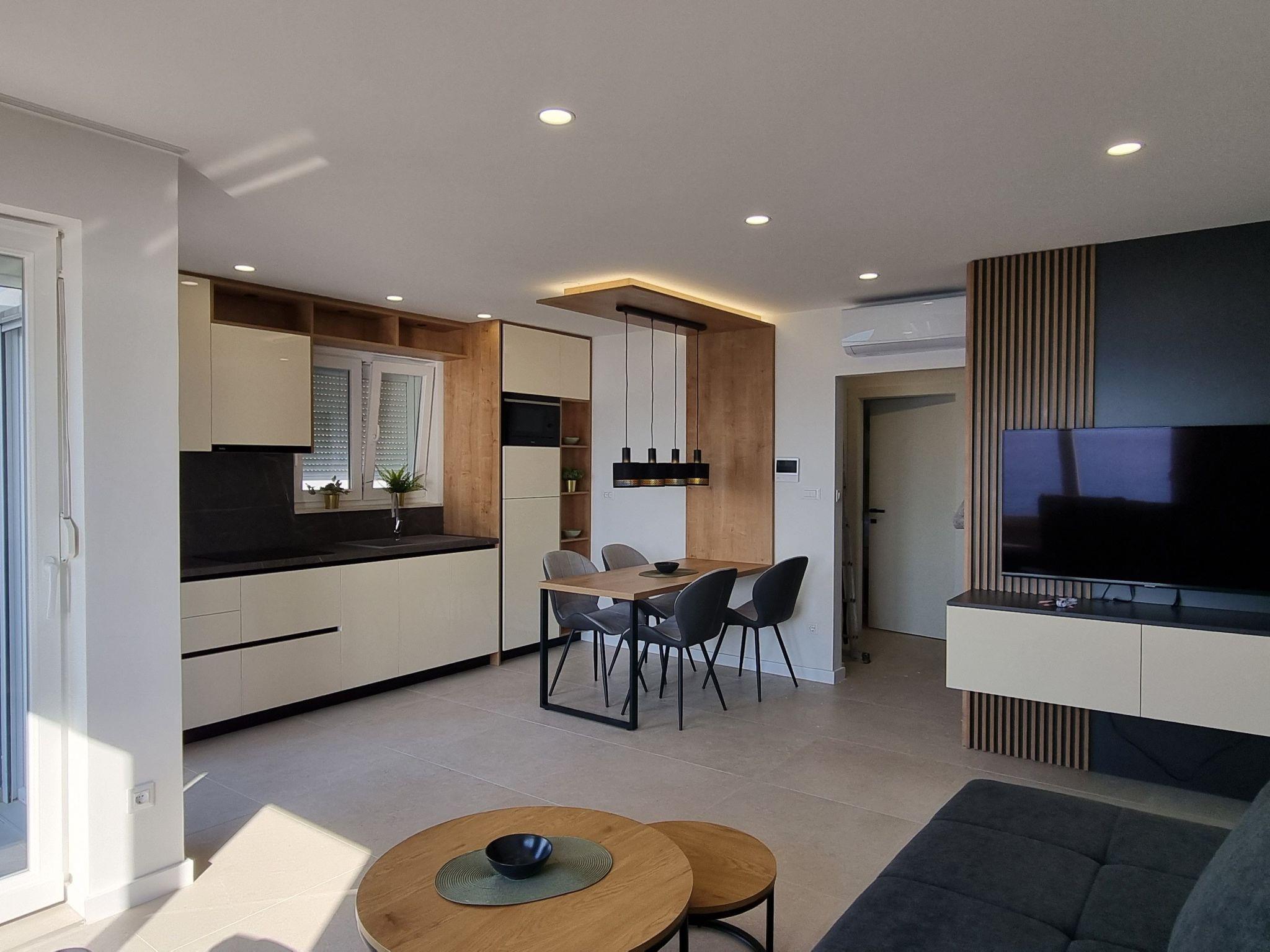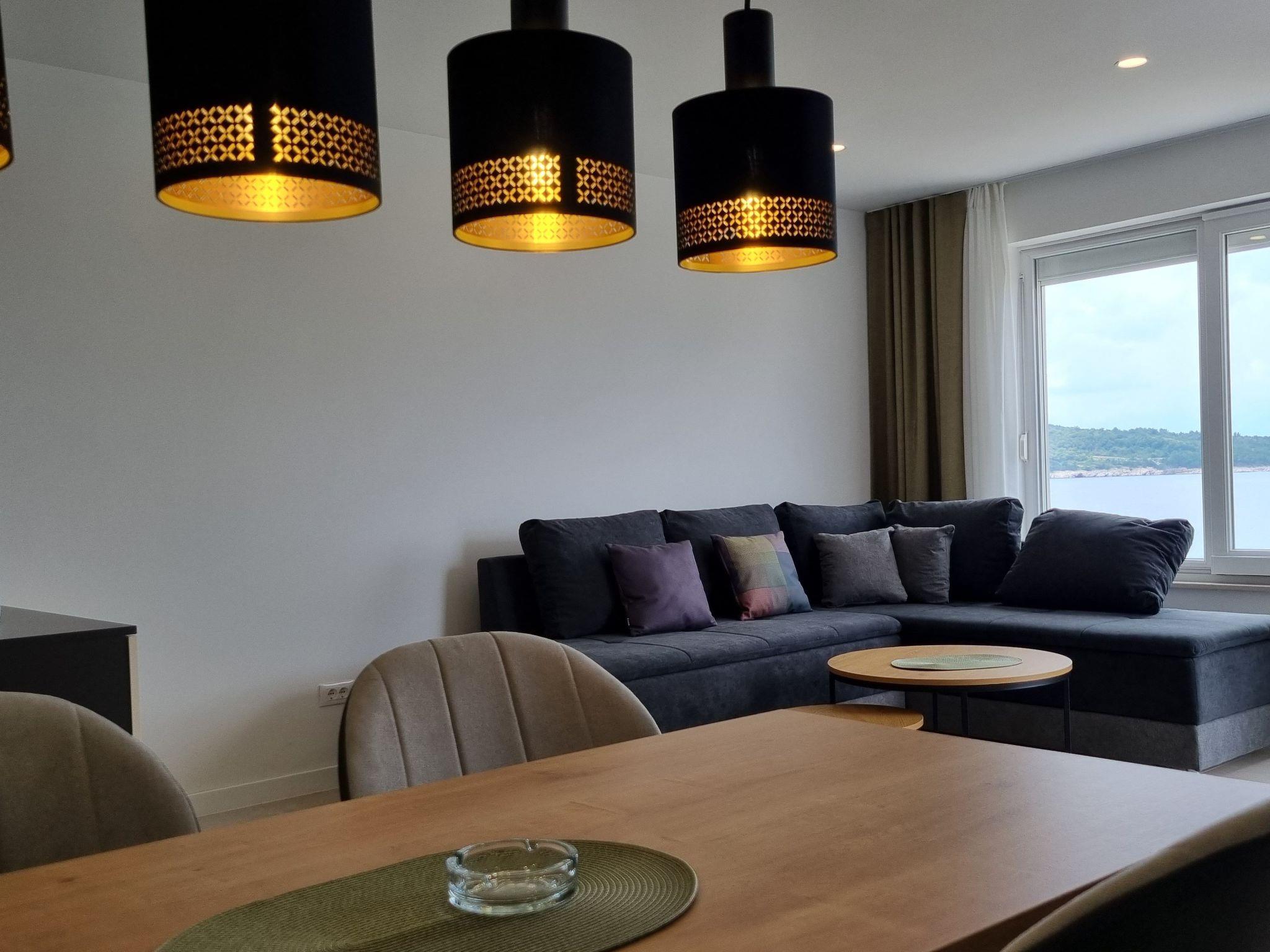 This luxurious and modern flat is located in a quiet apartment complex just 30 metres from the sea, surrounded by nature, many bays, pebble beaches and hiking trails. It offers a communal saltwater pool (36 m2), which is open from May to October and whose temperatures usually reach 20-26 °C. The flat is located on the 2nd floor and has a bedroom with a double bed, a modern kitchen with induction hob, fridge-freezer, kettle, coffee machine, toaster, microwave and dishwasher. The bathroom has a shower and toilet. The dining area and living room offer a cosy space with a sofa and smart TV, while free WiFi is available throughout the building.