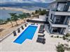 The balcony (10 m2) offers a beautiful view of the pool and the sea. The pool area on the ground floor is equipped with sun loungers, parasols and an outdoor shower and offers direct access to the sea for comfortable swimming. A communal laundry room on the ground floor includes a washing machine, washing capsules/detergent and an iron for guest use.