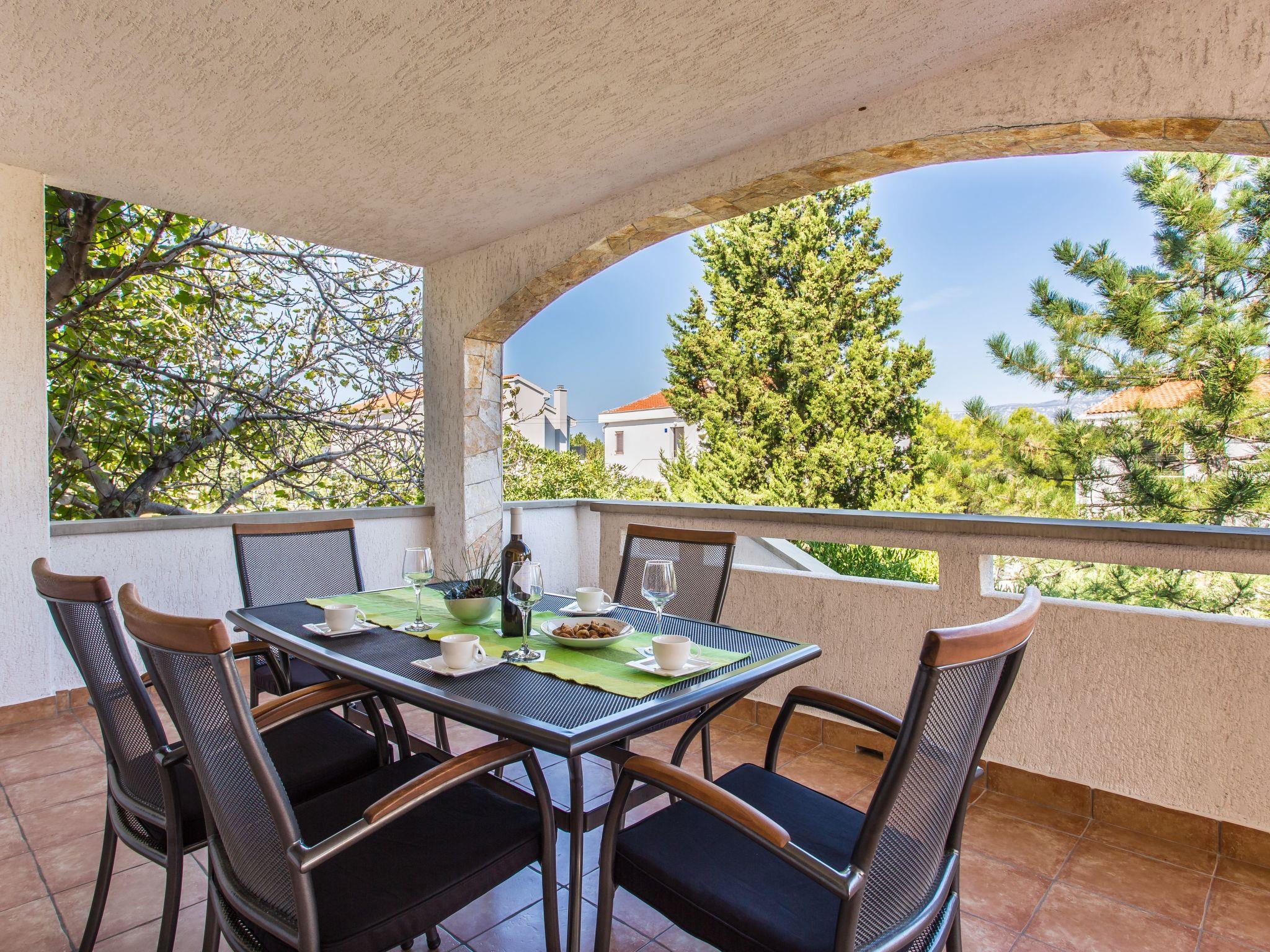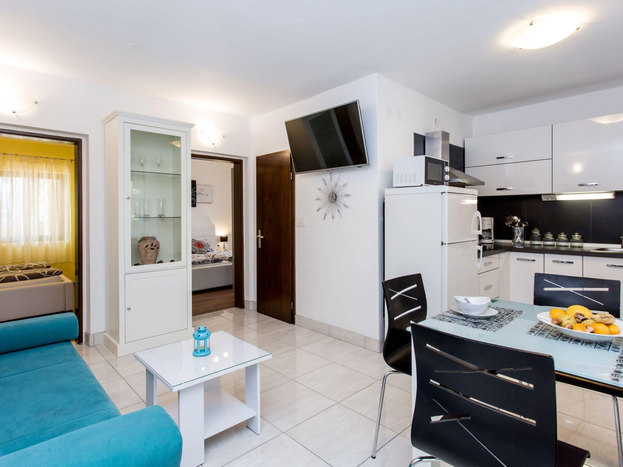 The kitchen is fully and modernly equipped, including a 4-burner ceramic hob, a fridge with freezer compartment, a coffee machine, a kettle, a microwave, a toaster, a hand blender and a dishwasher. The kitchen also has a dining area connected to the living area, where you will find a TV with satellite and cable channels and air conditioning for your comfort.
