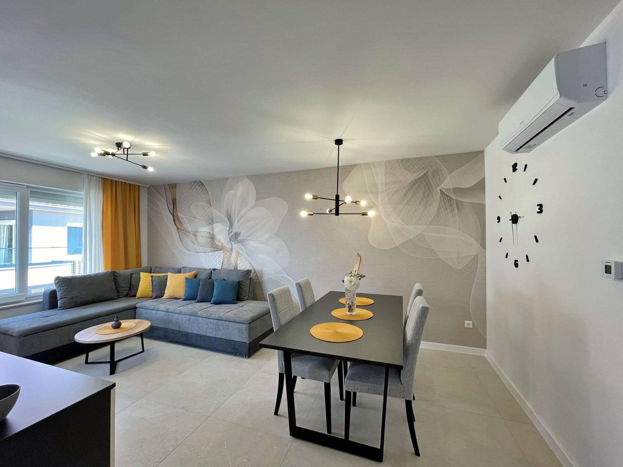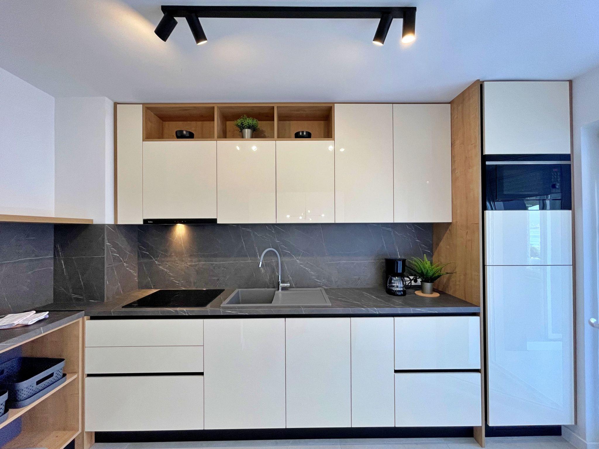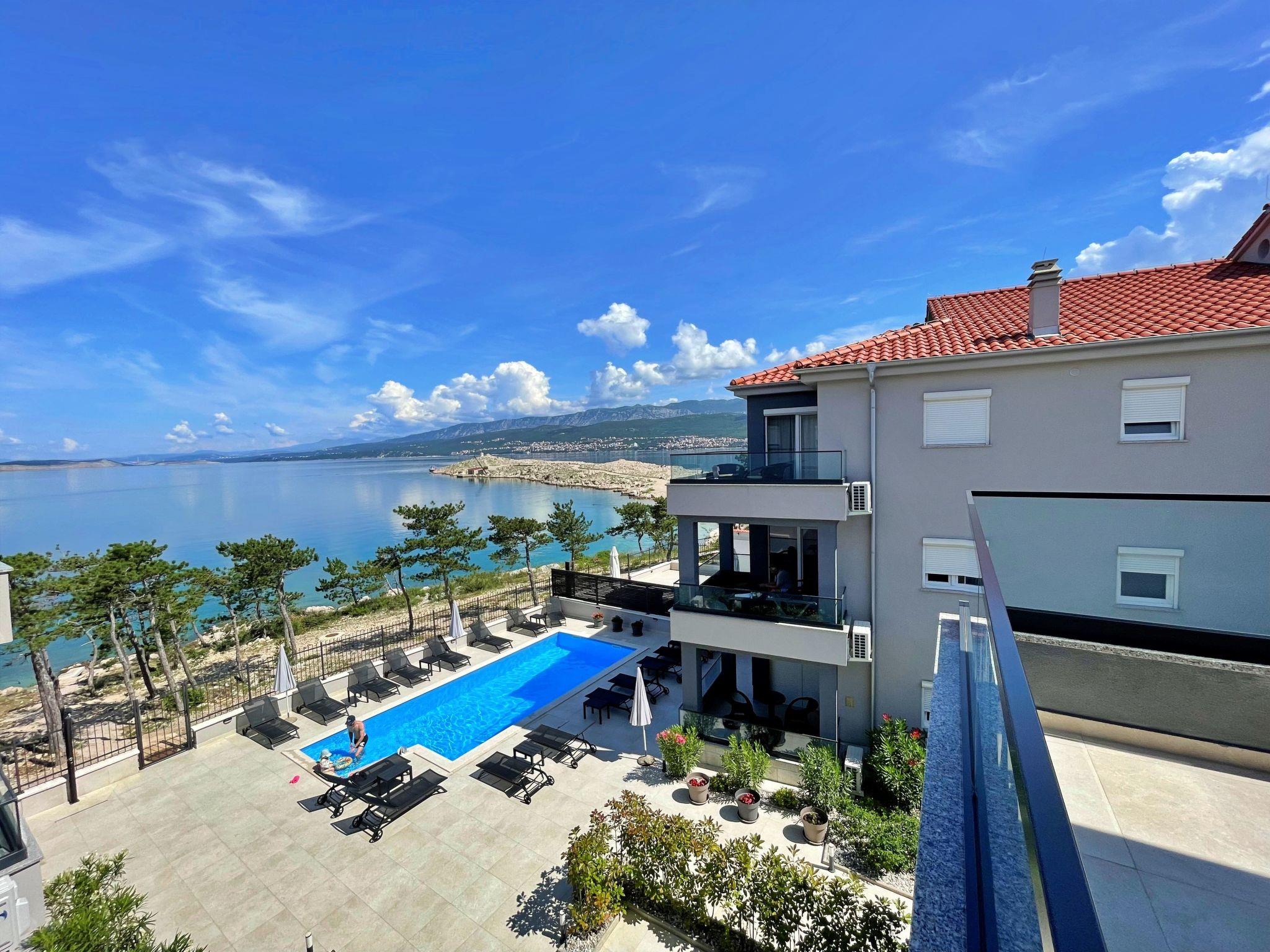 This luxurious, modern seafront flat is located in a quiet apartment complex just 30 metres from the sea, surrounded by nature, secluded coves, pebble beaches and hiking trails. It offers a communal saltwater pool (36 m2), which is open from May to October and whose temperatures usually reach 20-26 °C. The flat is located on the 2nd floor and has two bedrooms, each with a double bed, a modern kitchen with induction hob, fridge-freezer, kettle, coffee machine, toaster, microwave and dishwasher. The bathroom has a shower and toilet. The dining area and living room offer a cosy space with a sofa and smart TV, while free WiFi is available throughout the building.