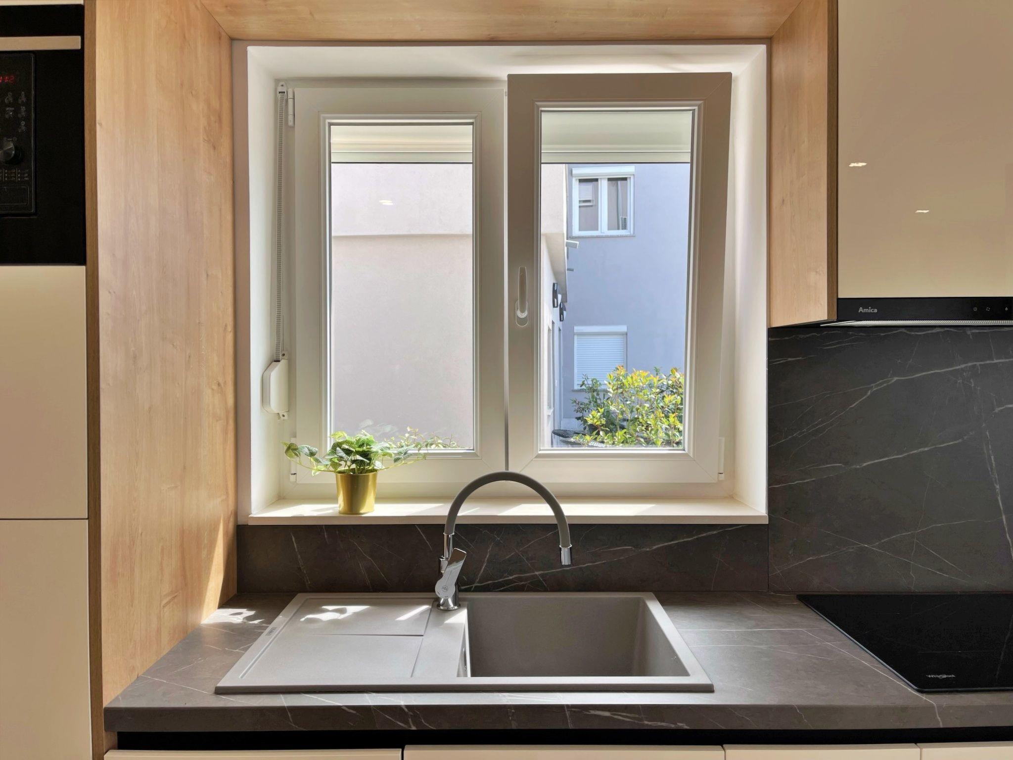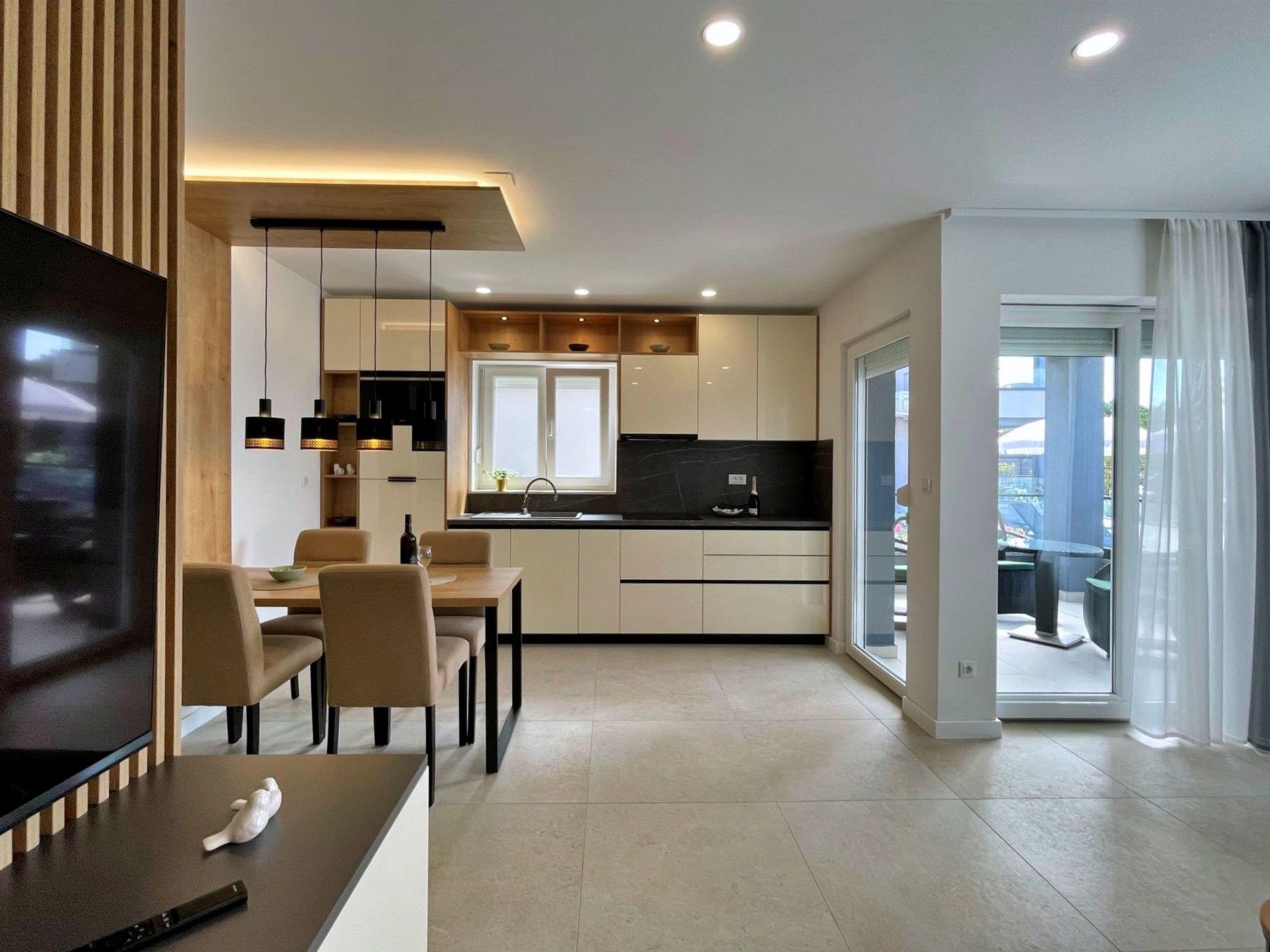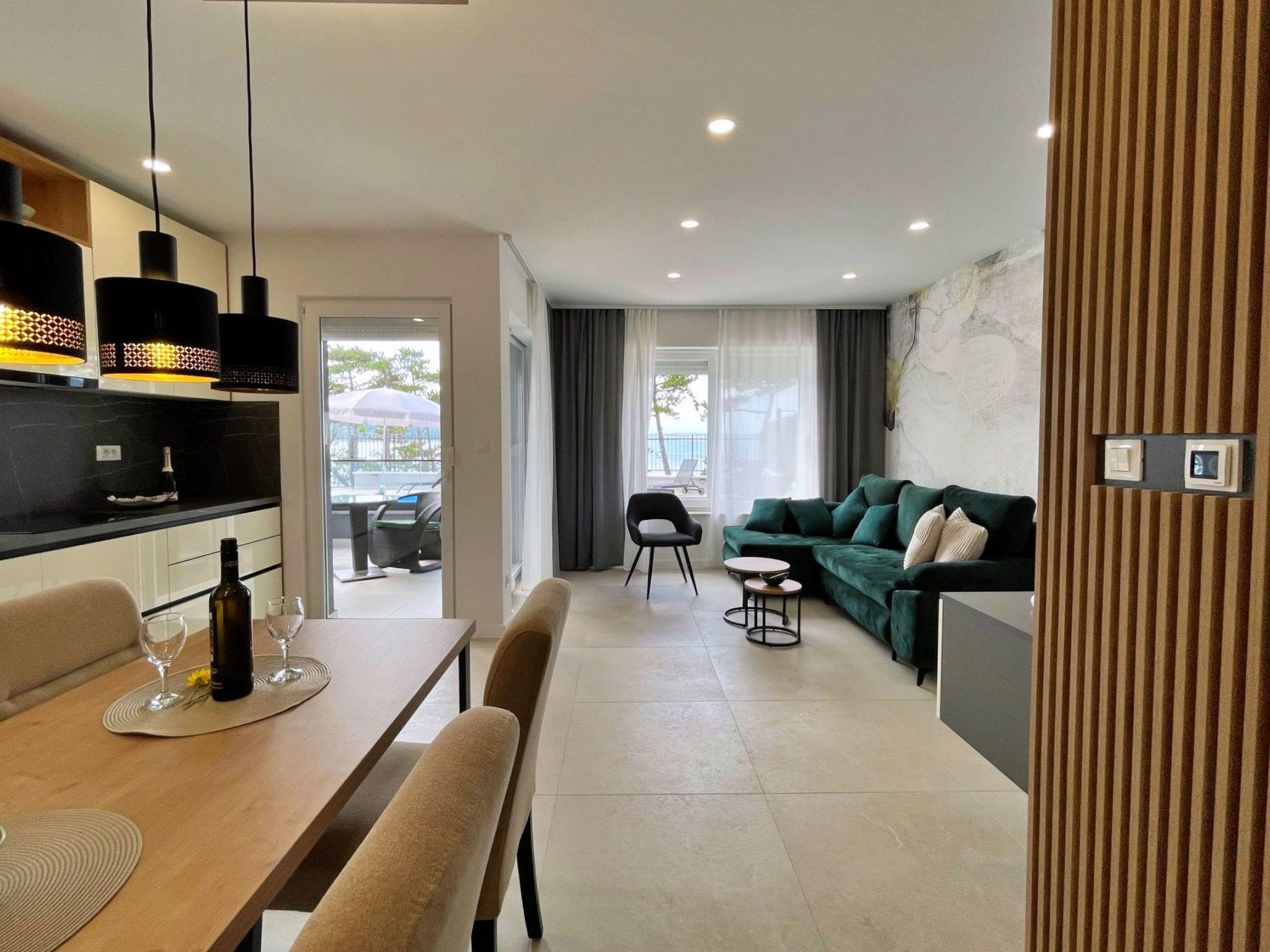 This luxurious and modern flat is located in a quiet apartment complex just 30 metres from the sea, surrounded by nature, many bays, pebble beaches and hiking trails. It offers a communal saltwater pool (36 m2), which is open from May to October and whose temperature usually reaches 20-26 °C. The flat is located on the ground floor and has a bedroom with a double bed, a modern kitchen with induction hob, fridge-freezer, kettle, coffee machine, toaster, microwave and dishwasher. The bathroom has a shower and toilet. The dining area and living room offer a cosy space with a sofa and smart TV, while free WiFi is available throughout the building.