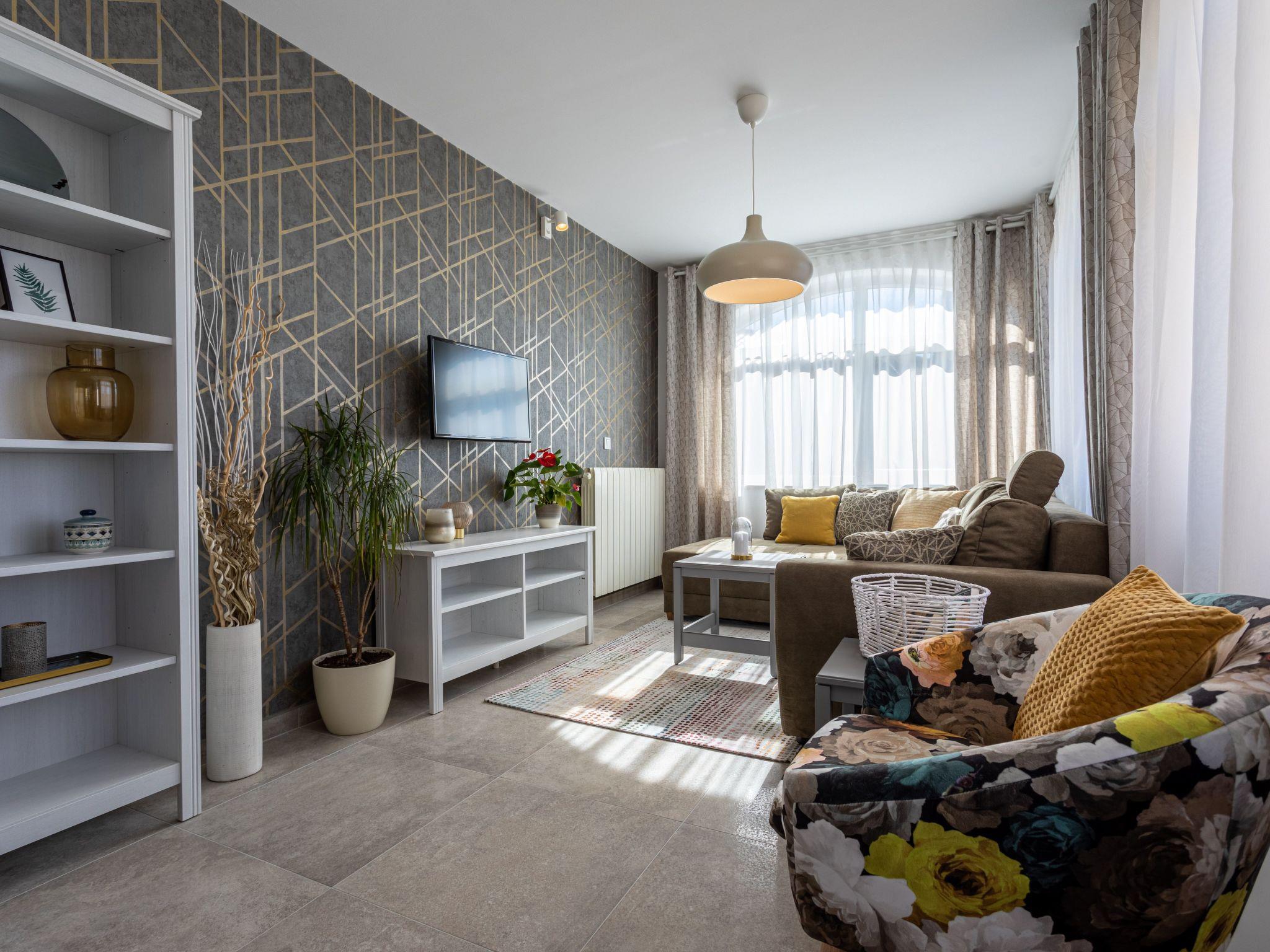 App has one bedroom with double bed, kitchen and leaving room with sofa for 1-2 people , aircondition and tv/sat.